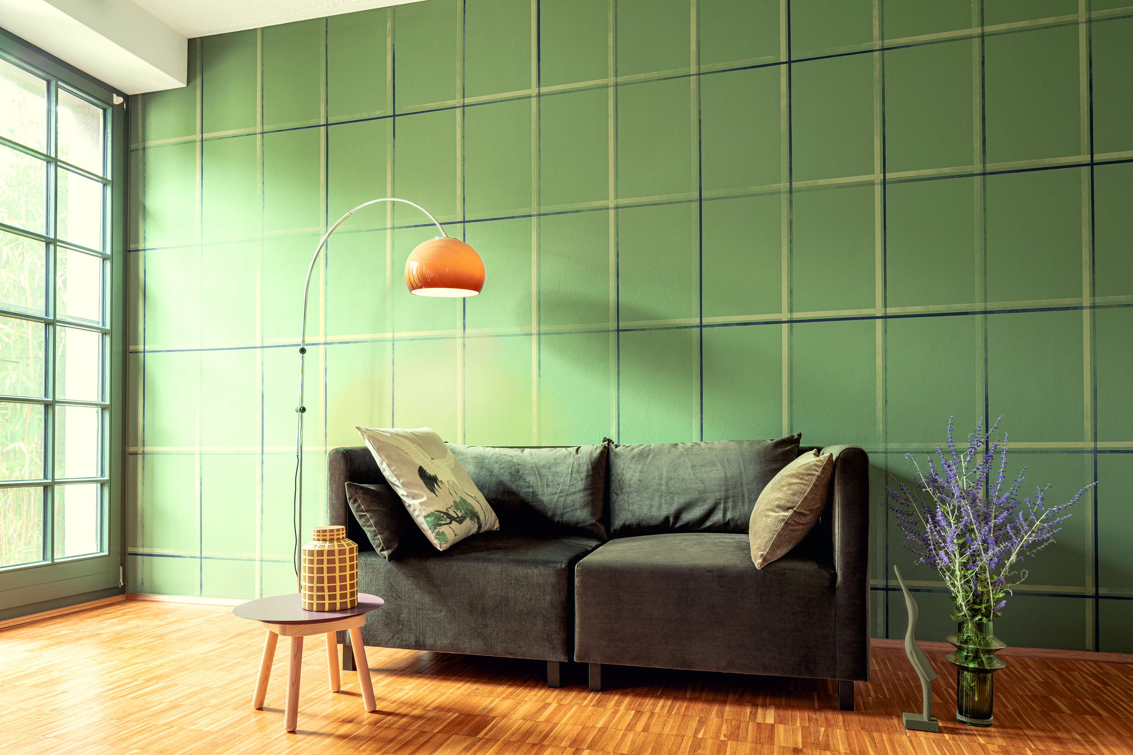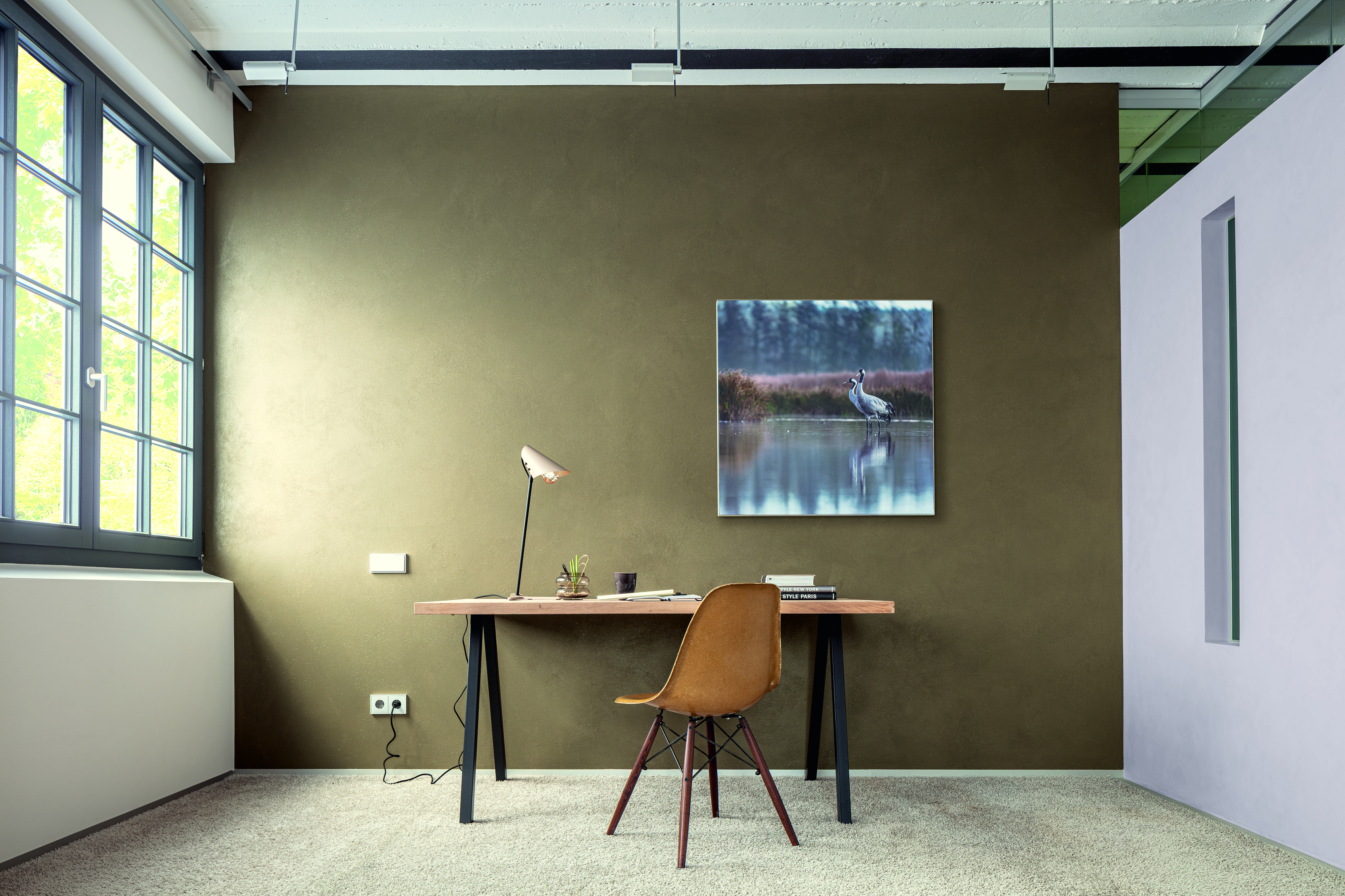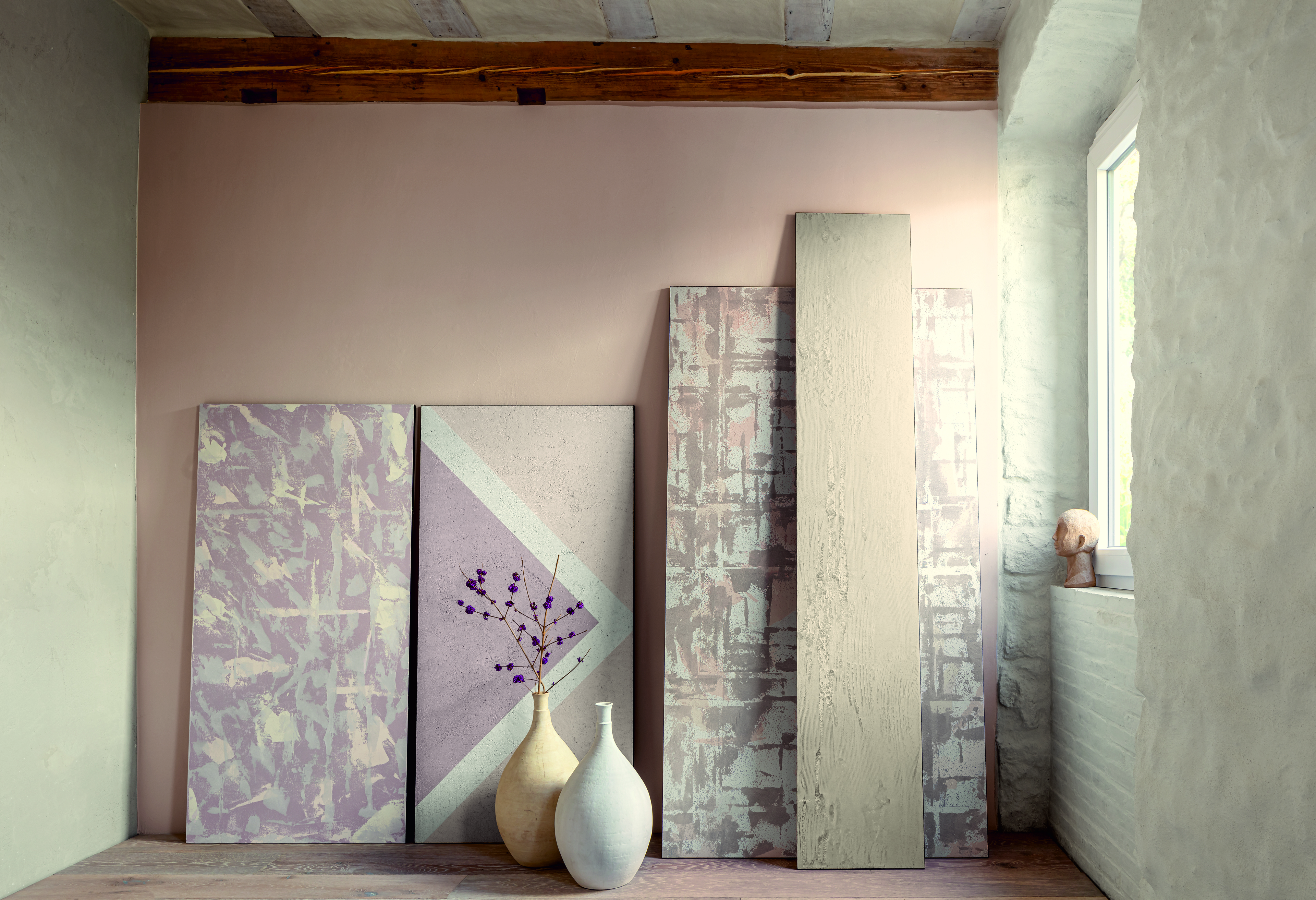 Einem komplett konträren Ansatz folgt „Die Lebendige“, die dritte Farbwelt. Im Zentrum steht Lavendel-Mauve, 3D Velvet 55, ein verblasstes Violett mit einem deutlich blauen Anteil, kühl und ruhig. Letzteres ist wichtig, da die weiteren Töne dieser Welt ausgesprochen kraftvoll auftreten. Das Spektrum hier reicht von erdigen graugrünen bis hin zu leuchtend ockerfarbigen Tönen. Obwohl kontrastreich und prägnant, können daraus harmonisch wirkende Kompositionen mit einer lebhaften Grundnote wachsen. Dazu passen dann auch Oberflächen, die subtilen Glanz und Glimmer ins Spiel bringen.