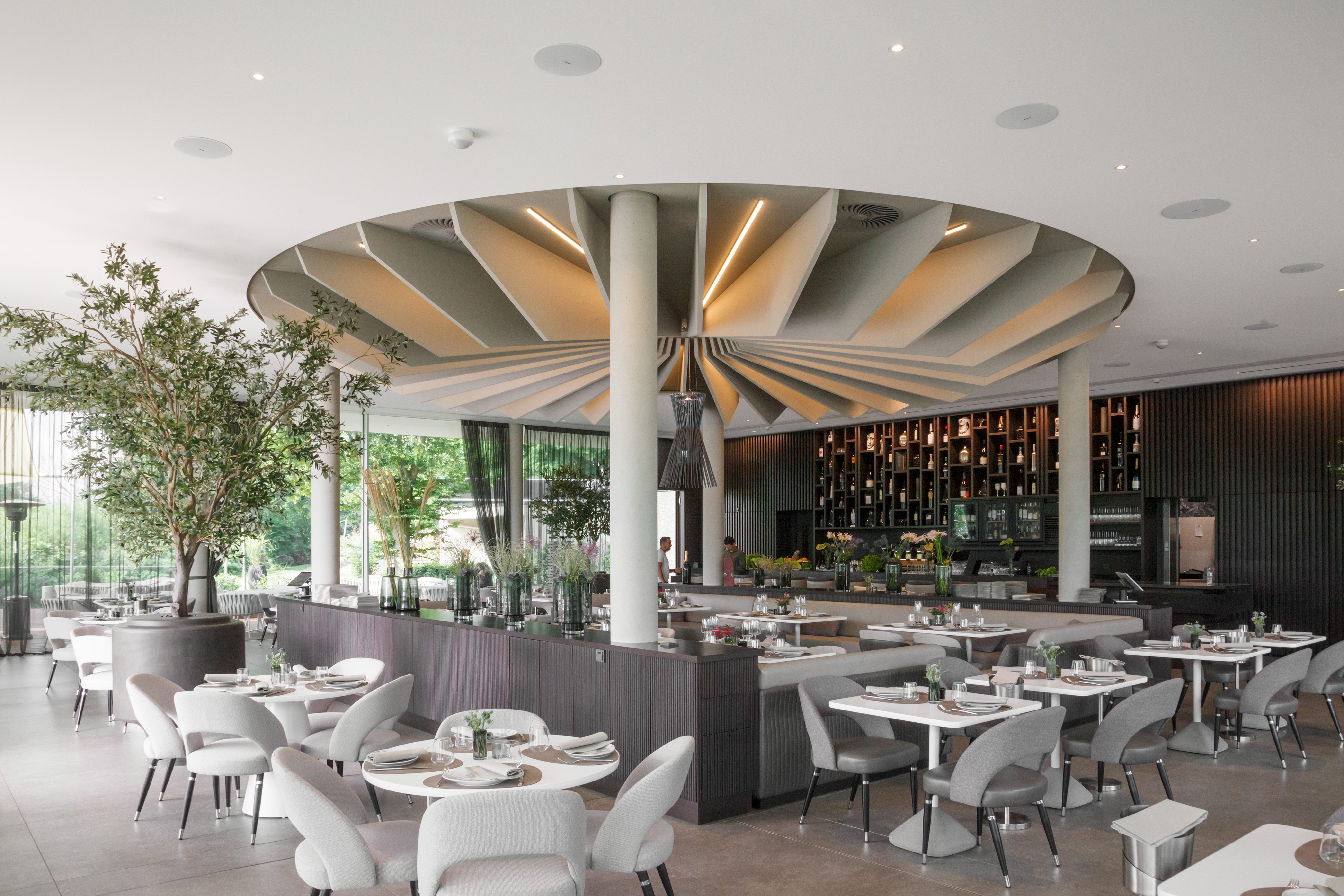 Das traditionsreiche Restaurant befindet sich schon seit vielen Jahren an dem Standort. Das Bestandsgebäude allerdings kam nach mehreren Umbauten an seine Kapazitätsgrenzen und bot keine Möglichkeit mehr für die Erweiterung von Küche und Gastraum. Deshalb wurde es abgerissen, an gleicher Stelle entstand der Neubau. „Ziel war es, einen neuen Wohlfühlort zu schaffen. Das neue Restaurant bietet heute einen großen, offenen Gastraum mit 150 Sitzplätzen, in dem eine flexible Bestuhlung möglich ist. Der Gastraum ist gläsern und lässt sich weit zur umlaufenden Außenterrasse öffnen, so dass Innen- und Außenraum im Sommer verschmelzen. Das spiegelt auch das mediterrane Flair wider“, erläutert die zuständige Architektin Jacqueline Zimmer von aplus architektur.