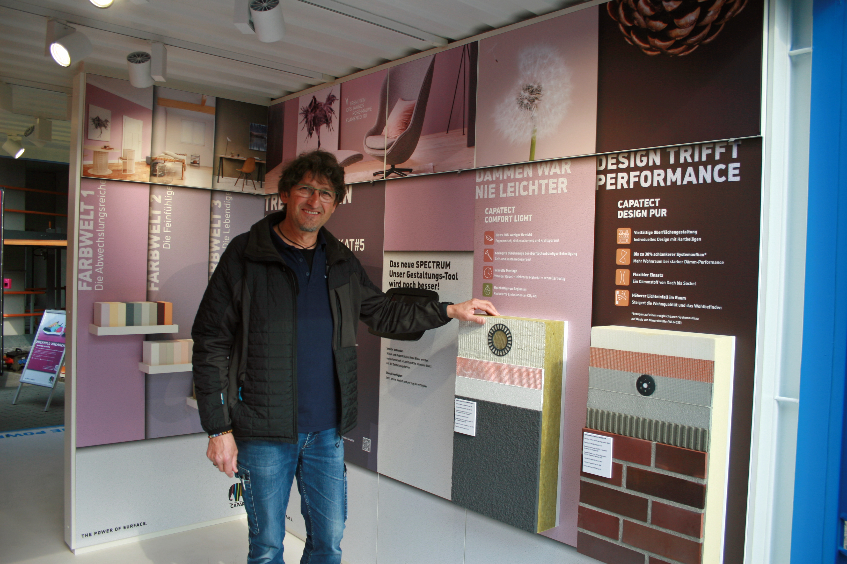 Malermeister Karl-Heinz Zecher aus dem südhessischen Zwingenberg war zur Auftaktveranstaltung nach Darmstadt gekommen. "Als ich davon hörte, war klar, dass ich vorbei schaue", sagt Zecher, der sich beeindruckt zeigt vom neuen Auftritt: "mutig, moderner, auffallend", lautet die Einschätzung, nachdem er sich einen ersten Eindruck verschafft und die beiden Event- Cubes besichtigt hat, die auf dem Hof des Farbengroßhändlers Späth Knoll stehen. Im Lead-Cube erlebt der Besucher geballte Oberflächen-Power mit inspirierenden Fassadenoberflächen, Trendfarben 2022, innovativen Gestaltungsmöglichkeiten und der Nachhaltigkeits-Initiative #mitcaparolumdenken. Im sogenannten Love-Cube finden die Gäste Eintritt in eine völlig neue Markenwelt.