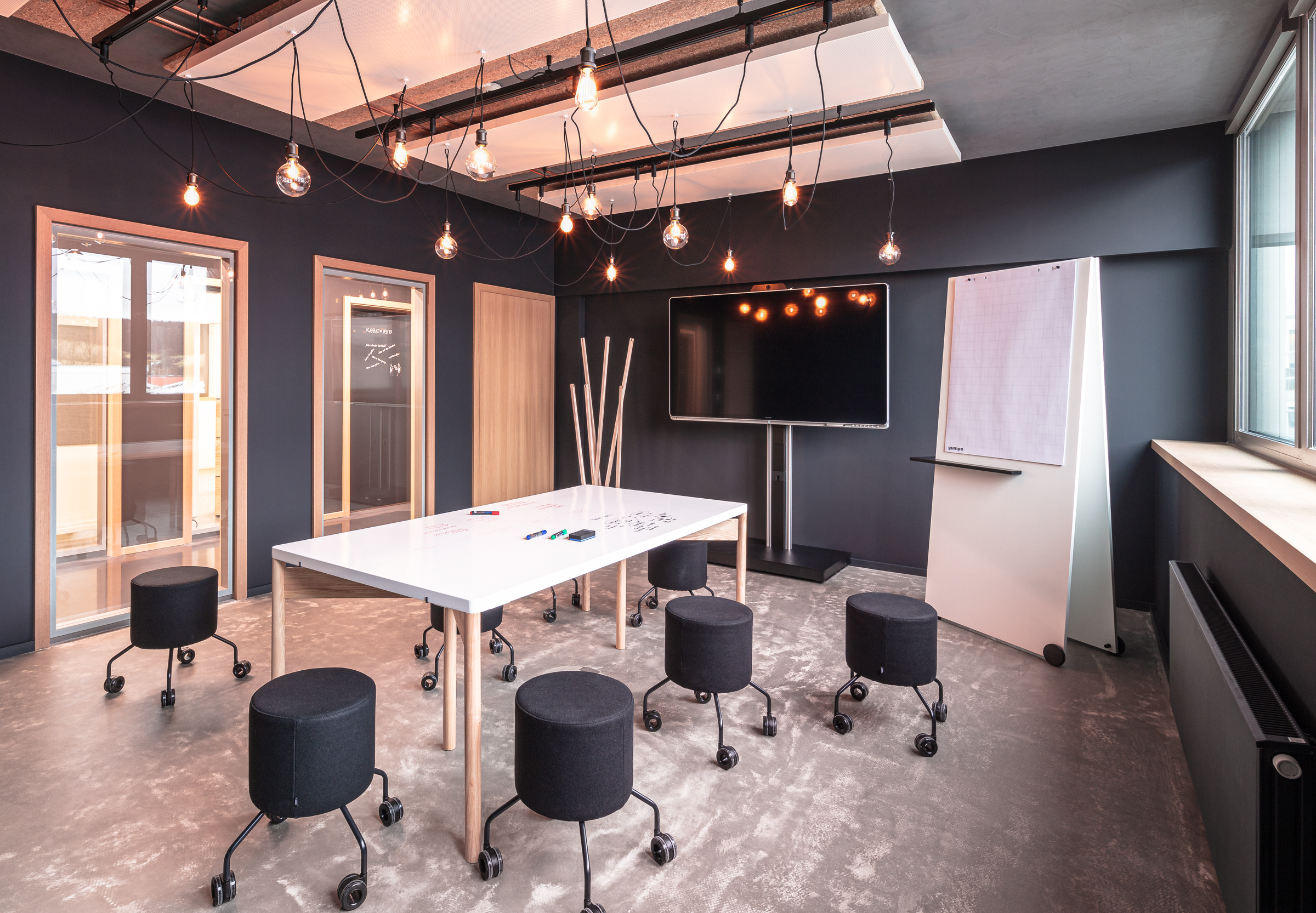 So sind sechs Meetingräume für zusammen 50 Personen entstanden, jeder Raum präsentiert sich – trotz gleicher Größe – eigenständig in Anmutung und Ausstattung gemäß des jeweiligen Nutzungsszenarios. Basis der Gestaltung bildet die Differenzierung der Räume in die Besprechungsanlässe „Entscheiden“, „Entwickeln“, „Austauschen“.