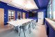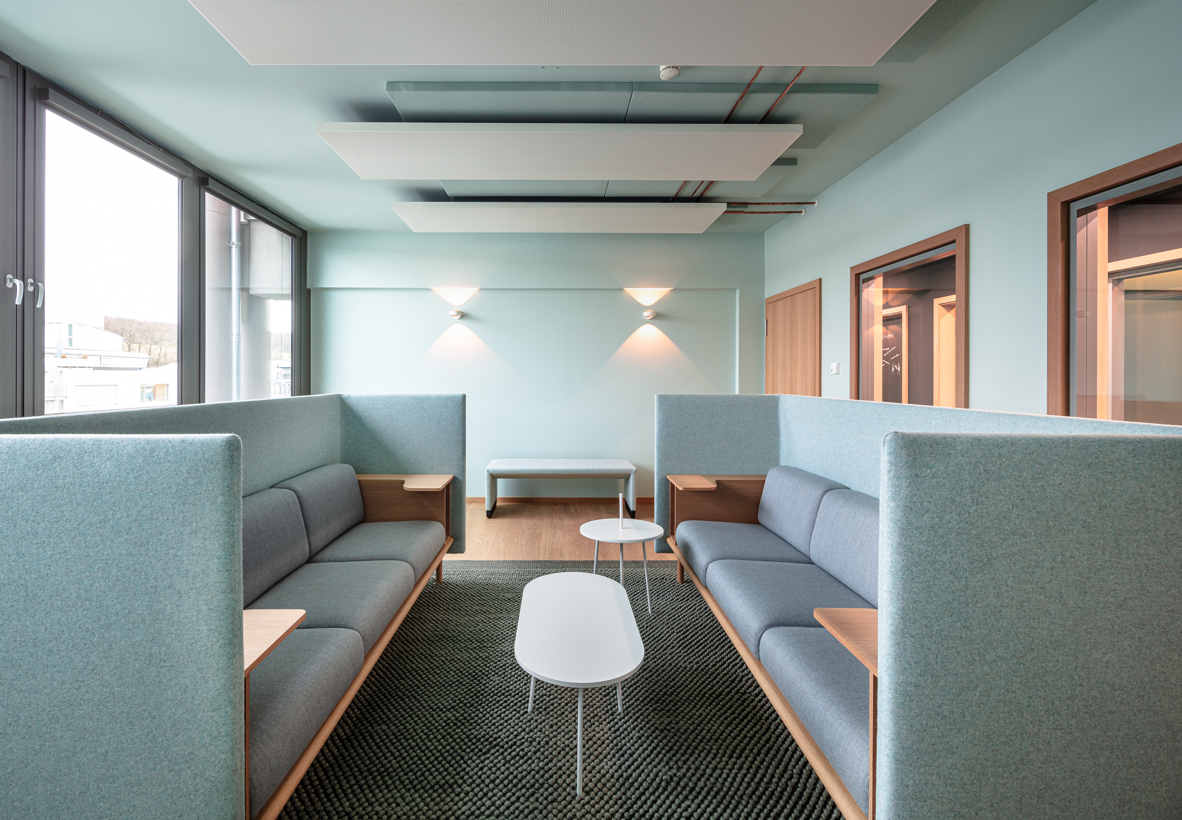 Diesen Grundmotiven folgt die konkrete Umsetzung mit Farben, Oberflächen, Textilien, Möbeln und Licht. Das Prinzip „Color-all-Over“ wird dafür aus dem Neubau fortgeführt, das heißt, die Farbnuancen stoppen nicht an Raumkanten oder Materialübergängen. Und: Alles ist daraufhin ausgerichtet, spontan auf neue Meeting-Anforderungen antworten zu können.