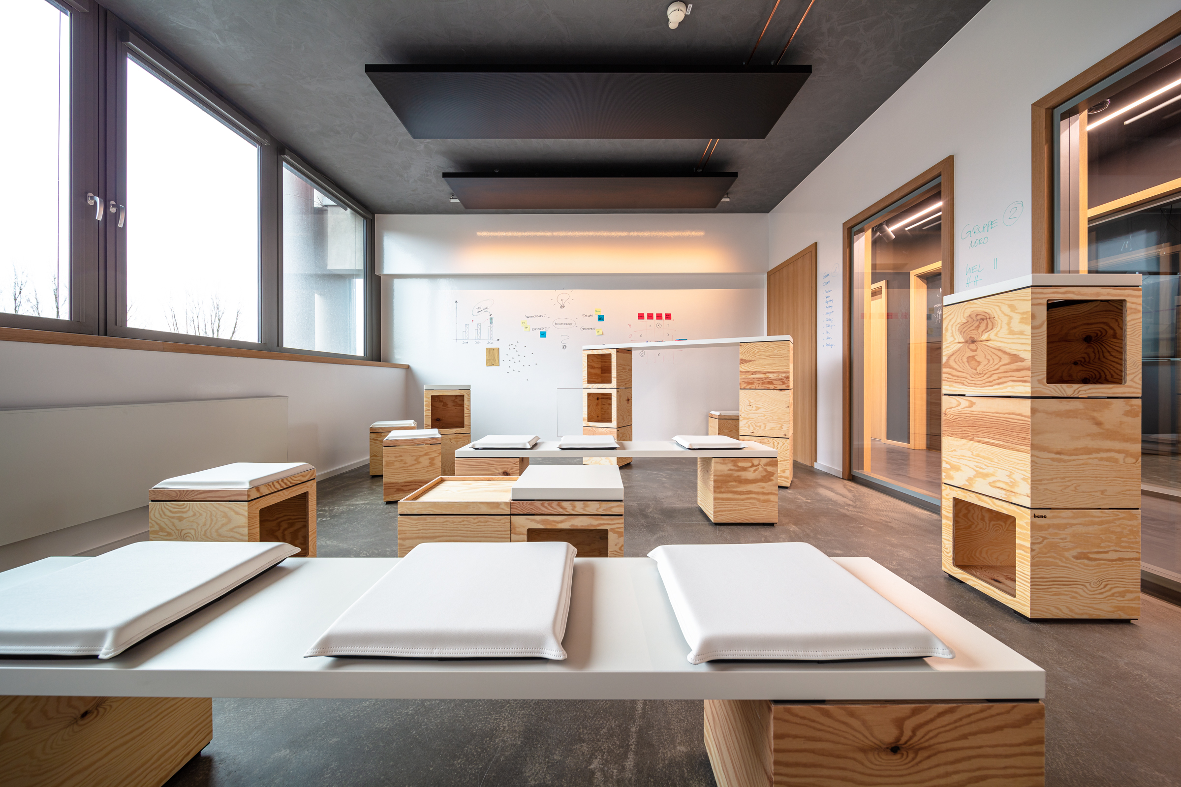 Dem „Austausch“ stehen eher wohnliche Farbnunacen sowie feine, zarte Kontraste zur Seite, hier geht es um das Fördern von Vertrautheit und Konzentration. „Entscheiden“ wiederum wird von klaren Farbigkeiten und hohen Kontrasten gerahmt, „Entwickeln“ bietet mit einer nicht alltäglichen Farbverteilung eine Plattform für dynamisches Agieren und neue Ideen.
