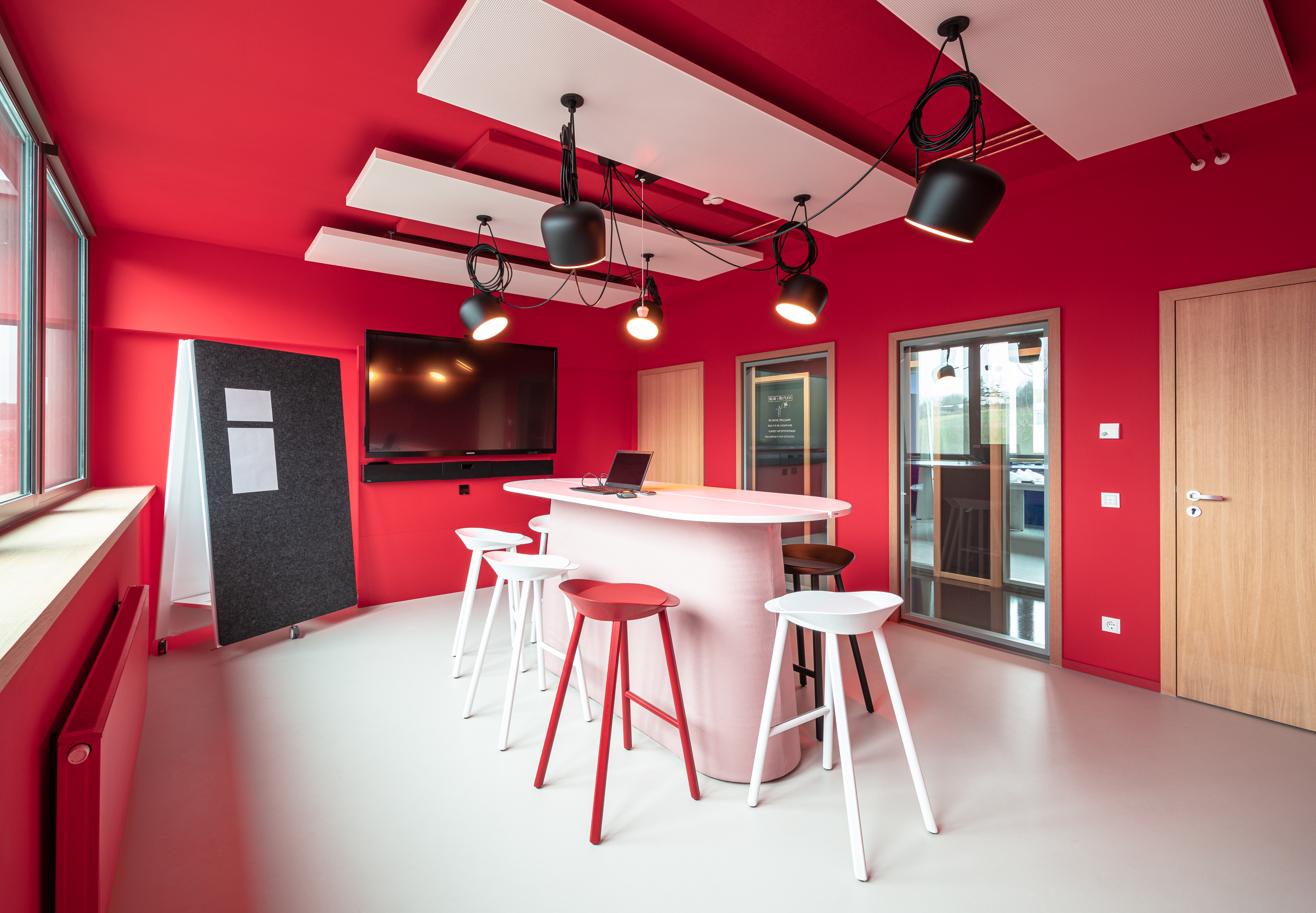 Neben den dezentralen Besprechungsräume wird es künftig weitere, auf einer Ebene konzentrierte Möglichkeiten für Meetings geben. Ging es früher darum, die Strecke vom eigenen Büro zum Meeting möglichst kurz zu halten, so wird der Weg auch als Gelegenheit gesehen, sich innerlich auf ein Meeting vorzubereiten, informell mit Kolleg*innen zu kommunizieren oder sich schlicht zu bewegen. Zugleich sollen Meetingräume mehr Charakter zeigen, inspirierend, aktivierend sein und so agile Workflows unterstützen. Die Devise lautet: Differenzierung. Konkret heißt das: jeder Besprechungsraum wartet mit einer eigenen Atmosphäre auf die Nutzer*innen. Und da spielt die Farbe natürlich eine maßgebliche Rolle.