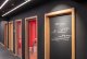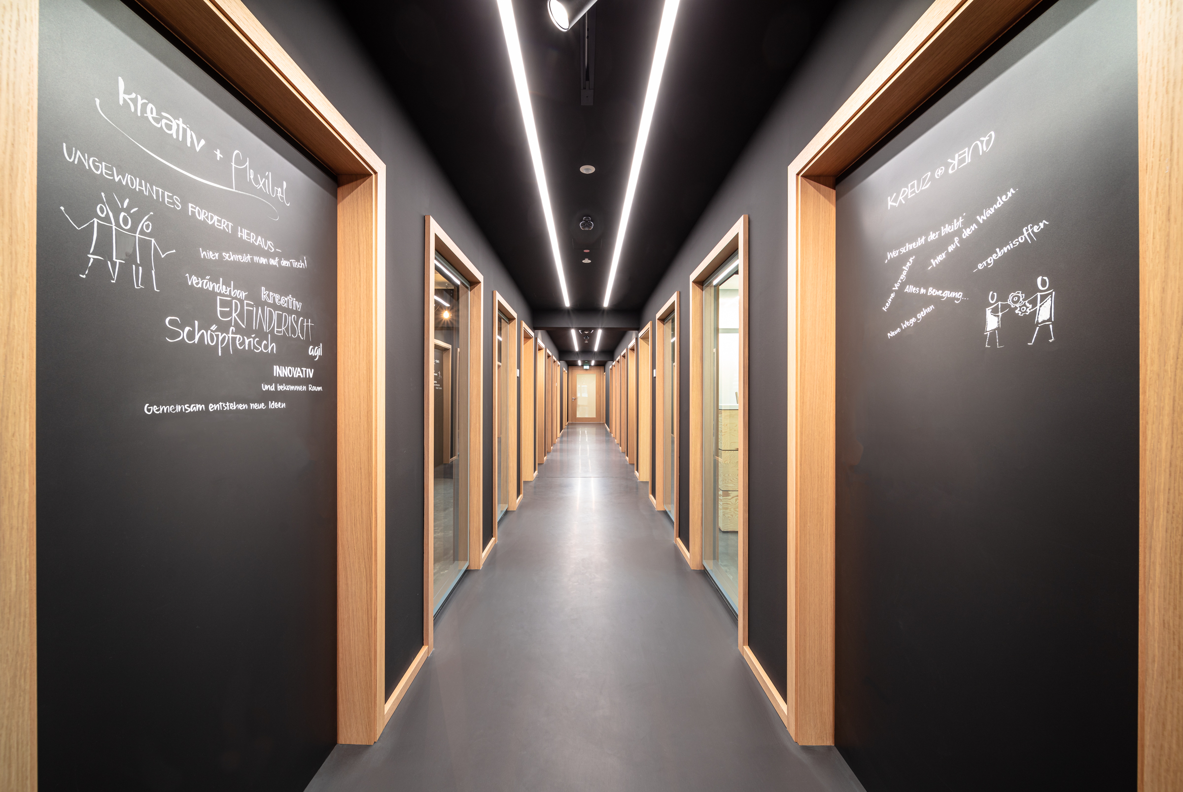 Der Grundriss der Besprechungsebene bleibt klassisch: Vom mittigen Erschließungsflur gehen links und rechts die Meetingräume ab. Der Flur ist komplett in tiefem Schwarz gehalten, lediglich die hölzernen Zargen setzen sich rhythmisch ab und kennzeichnen die Zugänge – und Einblicke. Bodentiefe Gläser sorgen für freie Sicht in die Räume – und zugleich auf das Ausstrahlen der sechs Farbwelten in den neutralen Flur. „Das Schwarz wirkt fokussierend, verbindet die einzelnen Farbräume und inszeniert diese“, so Simone Ferrari.