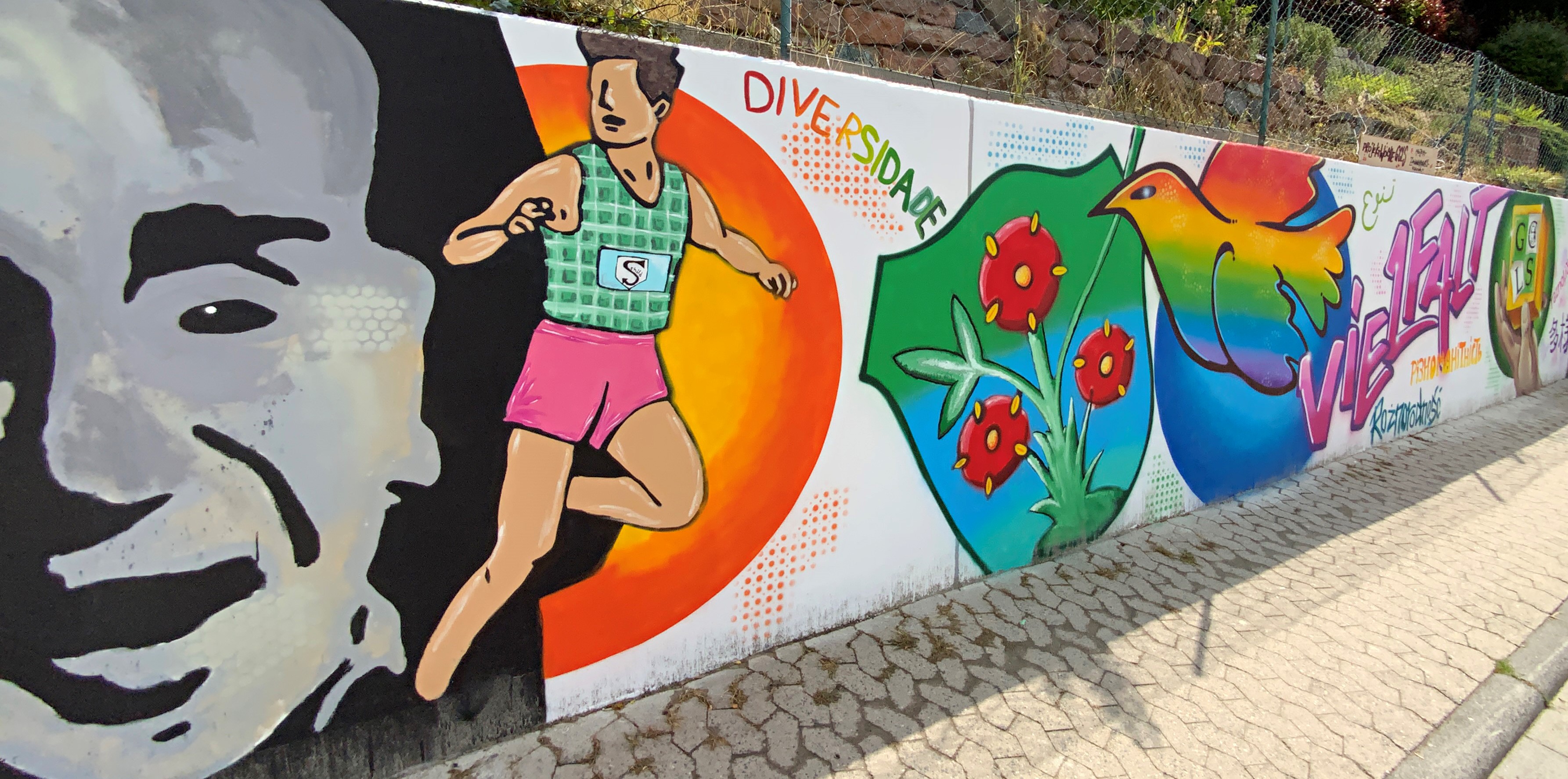Am Anfang der Komposition ist Bendorf als älterer Mann und, etwas kleiner, als junger Sportler abgebildet. Weil ihn mit den Schülern etwas Wichtiges verbindet, nämlich der Heimatort Ober-Ramstadt, prangt nun das Wappen der Stadt groß auf der Mauer. Gehalten wird es von einer Friedenstaube, deren Flügel in den Regenbogenfarben, dem Symbol für Vielfalt, aber auch für Ober-Ramstadt („Stadt der Farben“), schillern. Das Wort Vielfalt ist auf ukrainisch, portugiesisch, japanisch, polnisch und farsi aufgepinselt und weist auf die internationale Zusammensetzung der Klassen in der Georg-Christoph-Lichtenberg-Schule hin. Mit dem Bild des Stolpersteins für Bendorf und den Initialen der Schule endet der Zeitstrahl. Es ist ein Hinweis darauf, dass heute zum Glück andere Werte gelten als während der Nazi-Zeit.
