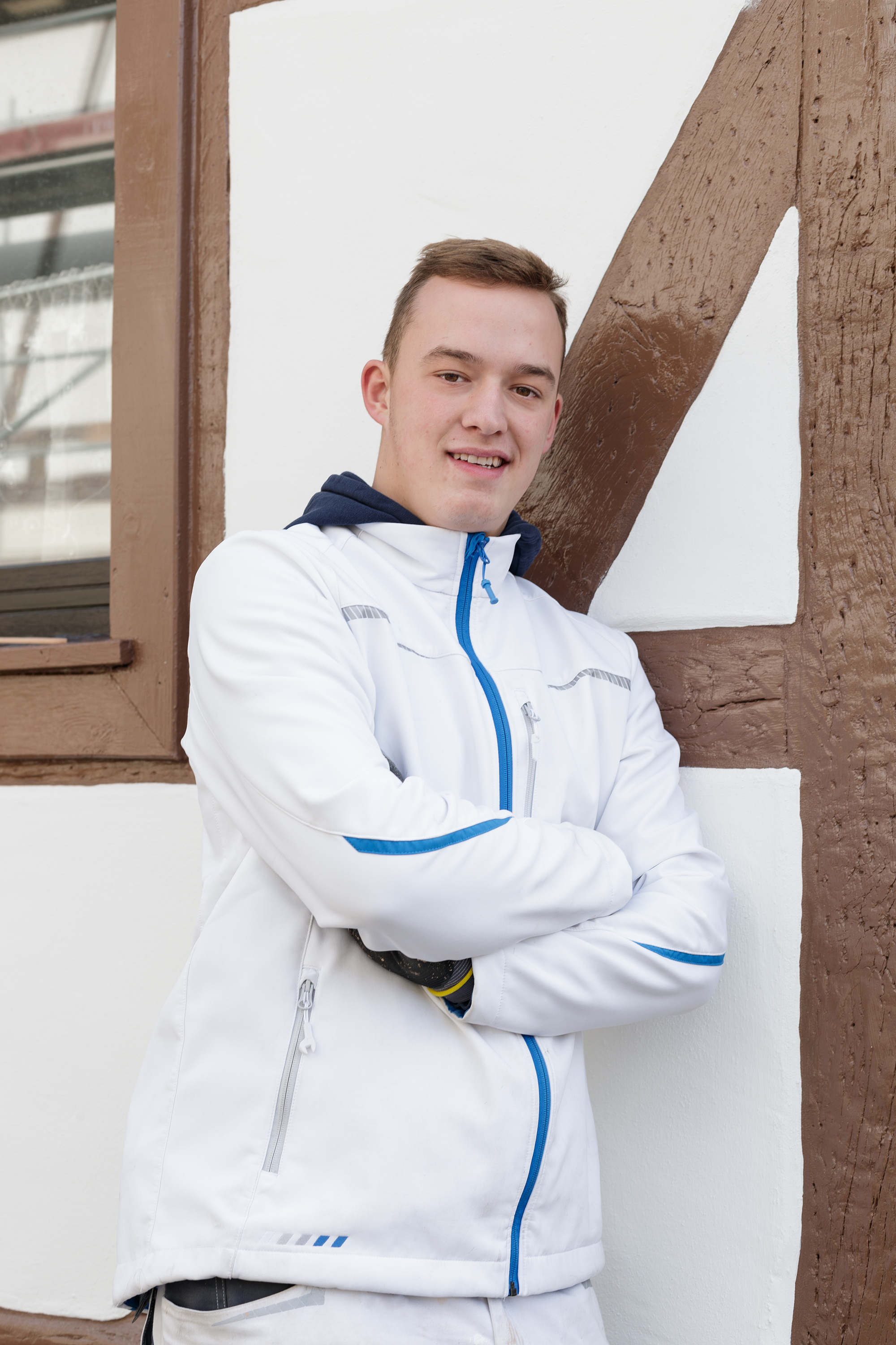 Mit auf der Baustelle ist immer wieder auch Paul Nolde, der bei der Firma Schüller seit August 2021 seine Ausbildung zum Maler macht. Zu Beginn seiner Ausbildung hat er in Herrstein vor allem Schleif- oder Abbrucharbeiten übernommen, inzwischen übt er sich immer stärker aber auch in Facharbeiter-Aufgaben: Gefache streichen, Holz lasieren und so weiter. „Wir machen mit der Firma viele Altbauten, aber in Herrstein kann ich das noch mal richtig vertiefen", erzählt er aus seinem Azubi-Alltag. „Was mir hier zum Beispiel richtig Spaß macht, sind die filigranen Malerarbeiten, wenn ich zum Beispiel die feinen Linien an den Fachwerkgestellen entlangziehe." Das macht Nolde – verständlicherweise – mehr Spaß als etwa irgendwo alte Tapeten abzuziehen.