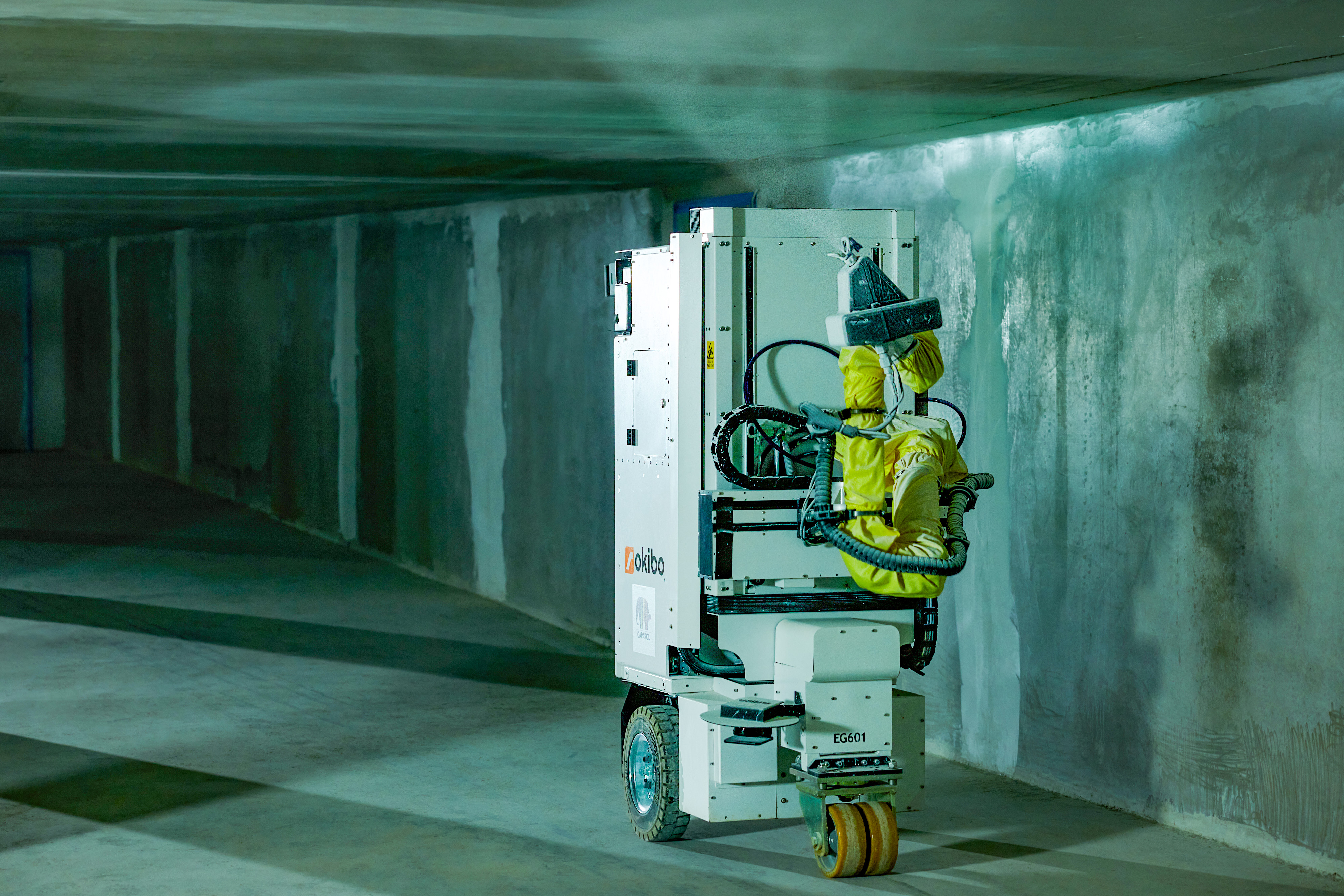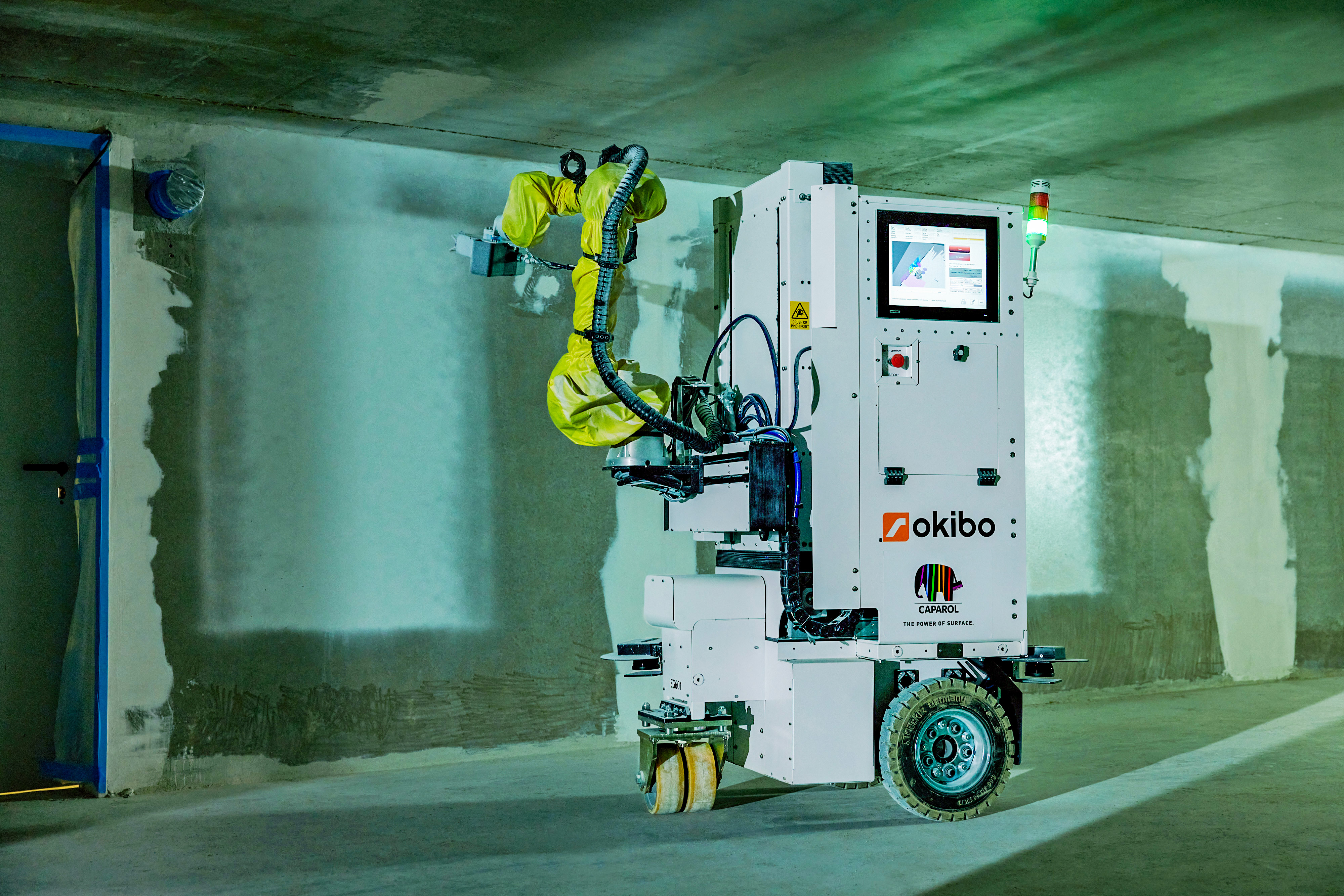 Gemeinsame Projekte mit dem Malerhandwerk sollen die Technologie nun vorantreiben und bei Tests weiter entwickeln. Dabei gehören die Koordination und Betreuung rund um den Einsatz des Roboters genauso zu den Aufgaben von Caparol wie die Logistik zu und von der Baustelle. Außerdem stellt Deutschlands größter Baufarbenhersteller hochwertige Beschichtungen mit diversen Farben aus seinem Sortiment zur Verfügung. Die Ausführung der Beschichtungsarbeiten erfolgt mittels neuester Robotertechnik, bedient durch geschultes Personal von Okibo. Für den Malerbetrieb heißt es, ein Objekt mit mindestens 5000 Quadratmeter Wand- und Deckenfläche zu nennen, den Einsatz des Roboters mit allen Beteiligten (Auftraggeber) abzustimmen, die Materialien festzulegen und eine robotertauglich vorbereitete Baustelle inklusive Abdeck- und Abklebearbeiten zur Verfügung zu stellen. Der Aufwand dafür ist vergleichbar mit dem Einsatz von Airlessgeräten. Mitarbeiter des Malerfachbetriebs sorgen zudem dafür, die Flächen zu beschichten, die der Roboter heute noch nicht erreichen kann. Es ist also Teamwork gefragt, um voneinander zu lernen, und die Bereitschaft, Zeit in gemeinsame Projekte zu investieren. Sie dienen zunächst nicht der Umsatzsteigerung, sondern sollen den Weg ebnen, später von einer dann ausgereiften effizienten Technik zu profitieren.