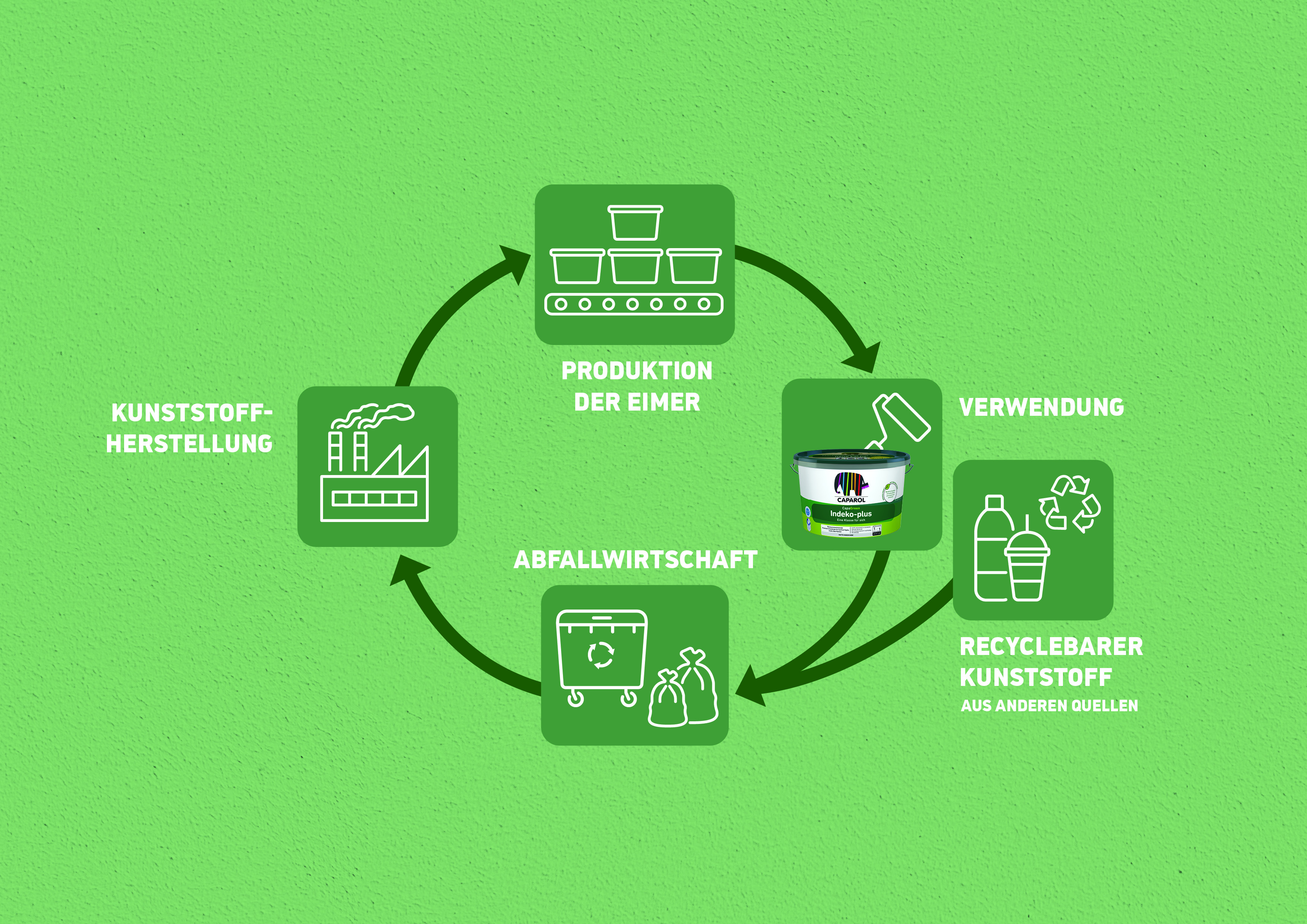 Caparol hat sich neben der Entwicklung umweltbewusster Produktlösungen auch nachhaltigen Verpackungen verschrieben. So bezieht Caparol für die Herstellung seiner Gebinde beispielsweise Kunststoff-Rezyklate (PCR) aus dem gelben Sack, also recyceltes Plastik. Mit einem PCR-Anteil von bis zu 70% sind die Verpackungen der CapaGreen-Linie besonders umweltfreundlich. Darüber hinaus setzt Caparol im CapaGreen-Sortiment Dosen aus Weißblech ein, die eine besonders hohe Recyclingfähigkeit haben.