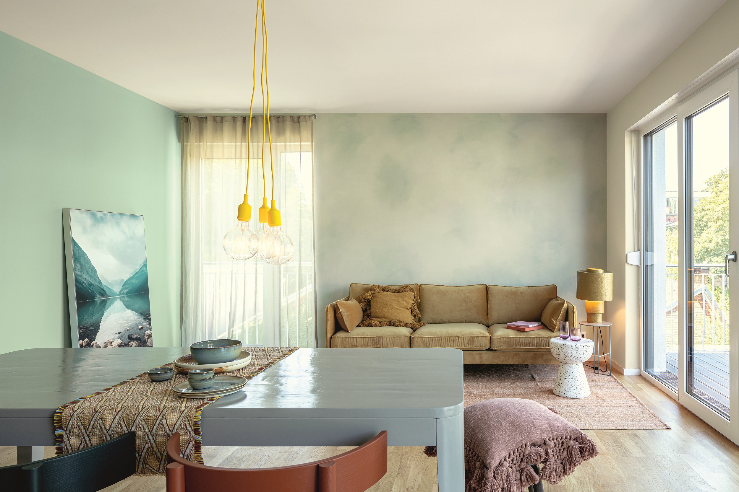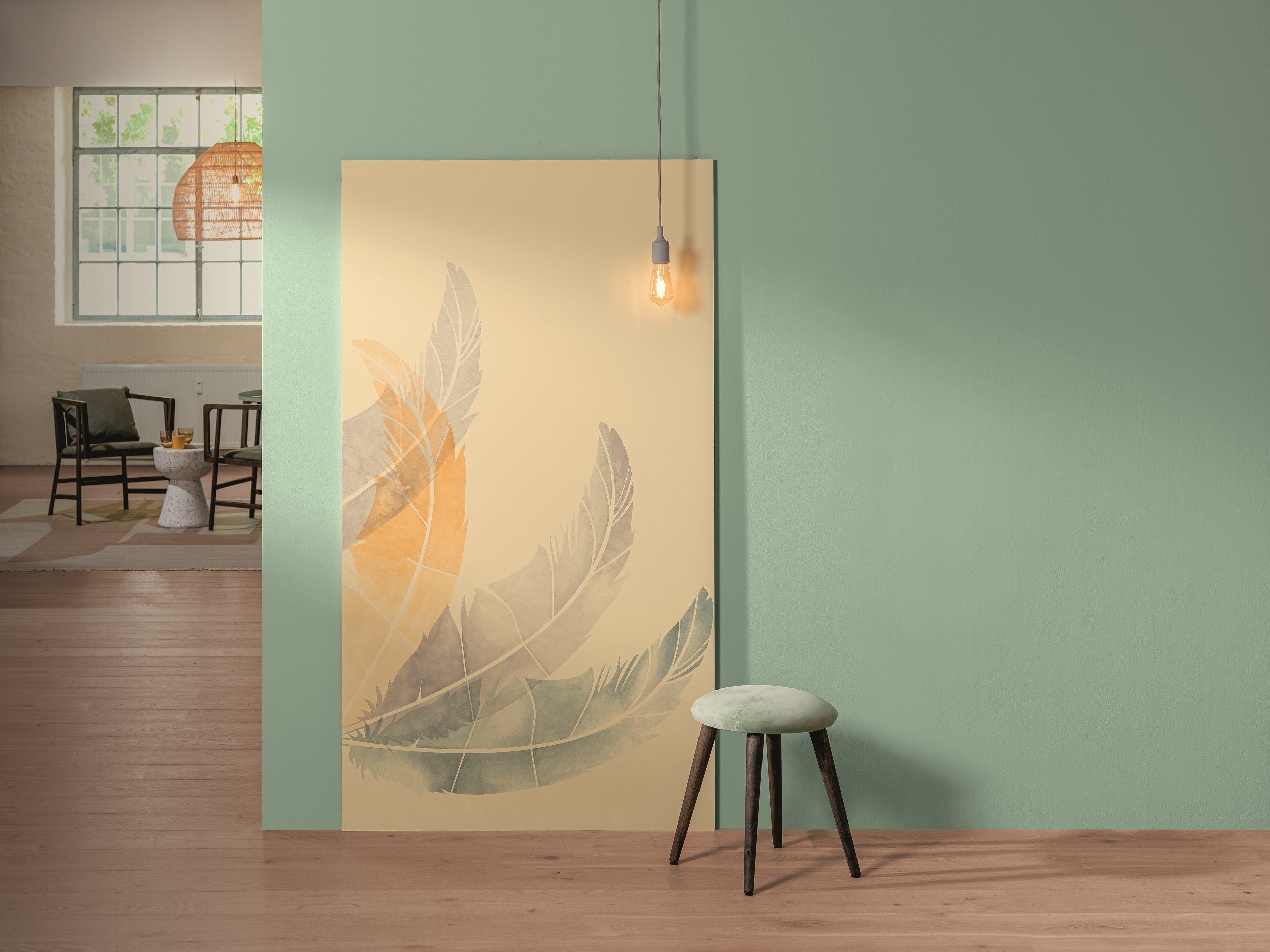 Völlig neu ist die Jahresfarbe: Bergsee-Grün, in der Caparol-Systematik als 3D Malachit 55 auffindbar. Dieses Grün überrascht, weil es kaum mit dem Rosé-Mauve von 2022 in Verbindung gebracht werden kann, also einen eigenständigen Farbton darstellt. Aber: „Bergsee-Grün passt harmonisch zu allen anderen Tönen und erweitert die bestehende Farbpalette wunderbar“, so Andrea Girgzdies. Kein Wunder, denn der Charakter dieses Grüns lässt sich umschreiben als leicht, frisch, luftig und klar. Unkompliziert wäre ein weiteres passendes Adjektiv, offen ebenso. Bergsee-Grün steht für die Sehnsucht nach Natur und Leichtigkeit, für das Zurücklassen der komplexen Alltagslasten. All dies lässt sich wie immer mit den aktuellen gesellschaftlichen und politischen Herausforderungen in Beziehung setzen. So fügt sich auch das Trend-Attribut, die Feder, ideal in das Gesamtbild. Die Feder ist leicht, filigran, robust sowie weich zugleich, sie hebt den Kranich in die Lüfte und lässt ihn die irdischen Unwägbarkeiten überwinden.