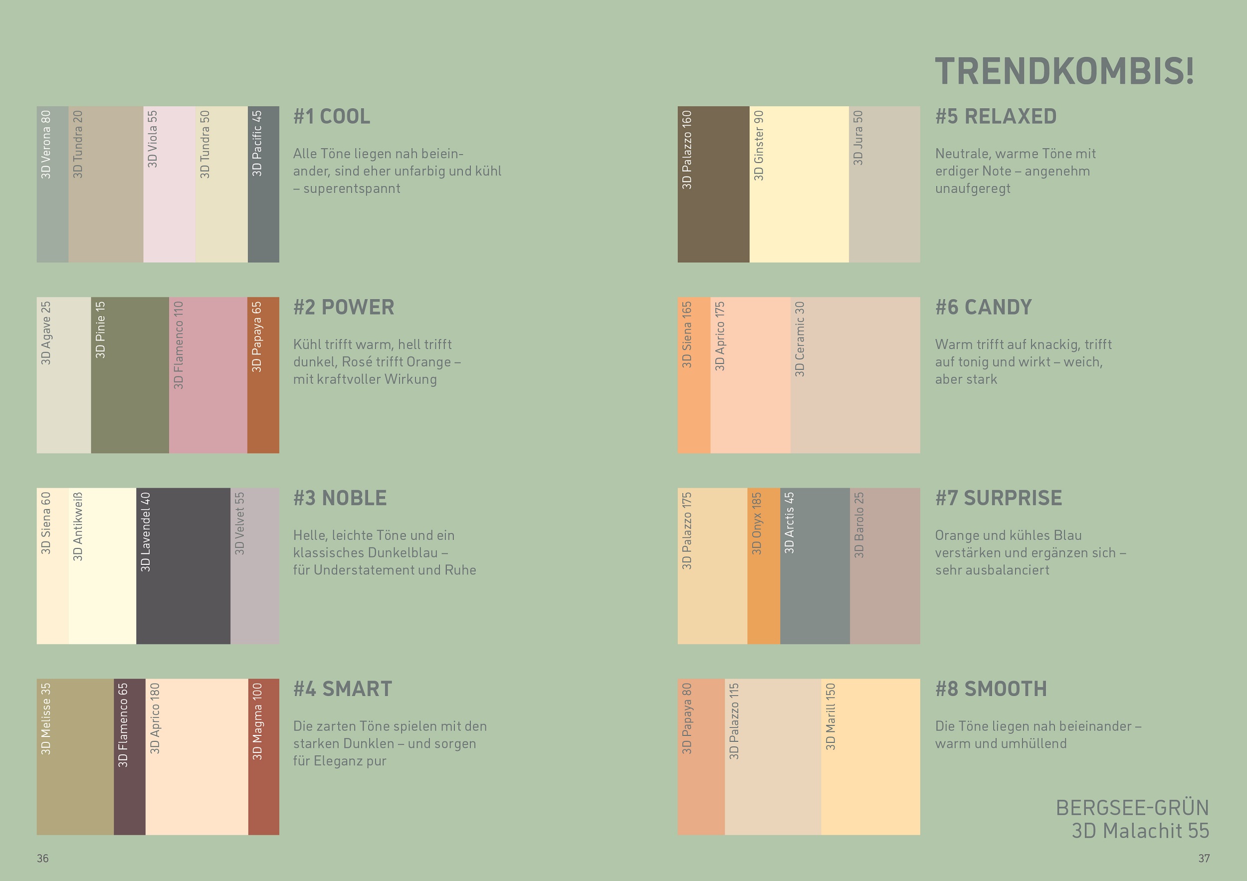 Die Farbharmonien sind so angelegt, dass sie sich klar voneinander differenzieren und sehr unterschiedliche Stimmungen erzeugen. Farbharmonie „#1 COOL“ beispielsweise kombiniert Töne, die alle nahe beieinander liegen, farblich zurückhaltend sind und tendenziell kühl wirken. „#2 POWER“ nutzt Komplementärkontraste und ist intensiv, charaktervoll, ein kraftvolles Statement. „#3 NOBLE“ gibt sich zurückhaltend, kombiniert leichte Töne mit dunklem Blau. „#4 SMART“ verknüpft zarte mit dunklen Tönen auf elegante Weise, „#5 RELAXED“ umfasst neutrale und warme Töne mit erdiger Note für zurückhaltende Lösungen. Ganz anders zeigt sich „#6 CANDY“, bestehend aus warmen, eher weichen, mitunter süßlichen Tönen. „#7 SURPRISE“ setzt wieder auf komplementäre Nuancen, die sich gegenseitig verstärken, „#8 SMOOTH“ schließlich besteht aus weichen, warmen und umhüllenden Einzeltönen.