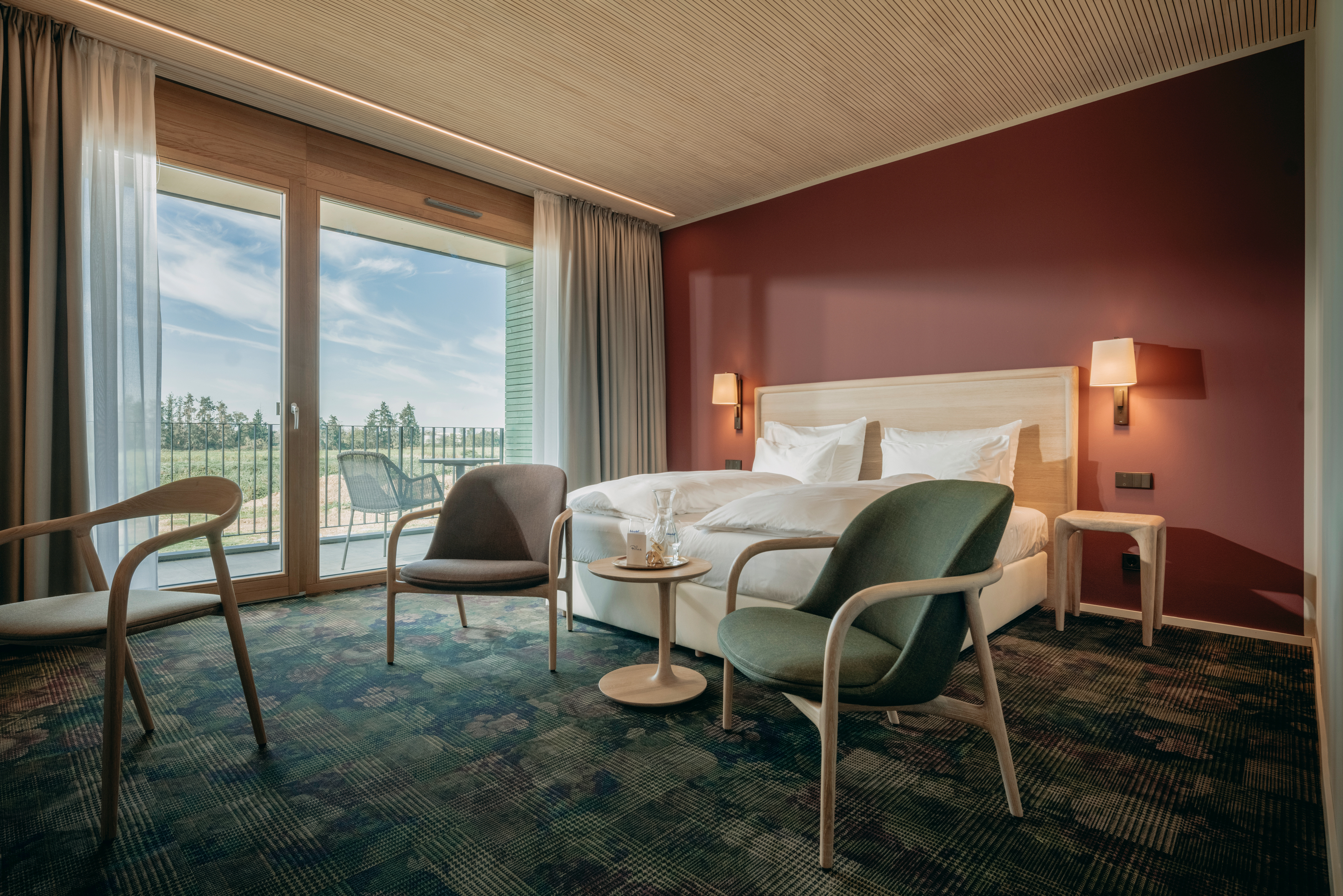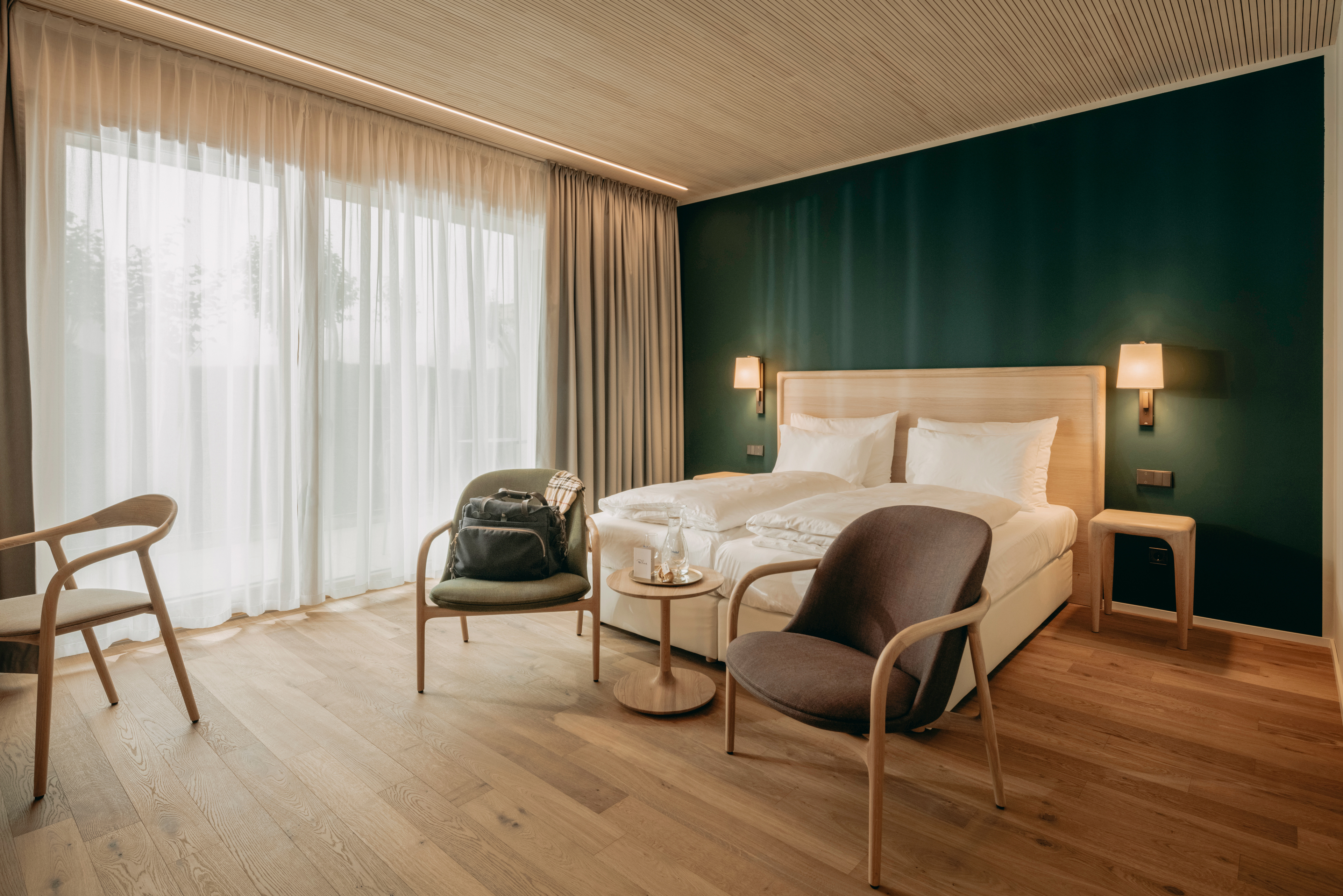 Mit dem Entwickeln eines Farbkonzeptes für das Landhotel Bohrerhof beauftragte man das Caparol FarbDesignStudio. Diplom-Designerin Petra Ruhnau plante hier im Team mit Architekt Rudolf Johannes Lais, Lais Architekten, und der auftraggebenden Familie Bohrer, für die Natur immer im Mittelpunkt steht: "Ankommen, zur Ruhe kommen, geerdet sein – das sind wichtige Stichworte für uns, das möchten wir unseren Gästen im Bohrerhof vermitteln", sagt Petra Bohrer, die Chefin im Familienunternehmen. Sie übernahm die Leitung für das Bauprojekt, als ihr Mann im März 2022 überraschend verstarb und setzte seine kreativen Ideen sorgsam um. Vorgabe für alle farblichen Überlegungen war ein konkretes Bild, das Bruno Bohrer vom eigenen Spargelacker aufgenommen hatte. Denn Kerngeschäft des Familienbetriebs ist nach wie vor das Gemüse, und diese Haltung möchte man durch die Farbwelt des Hotels noch mal betonen: Braun-beige für die Erde, Grün für die Pflanzen und Blau für den Himmel. Also bilden ruhige Töne aus der Natur die Grundlage des Farbkonzeptes, im Innenbereich mit belebenden Akzenten in Kontrastfarben und spannenden dekorativen Innenwand-Techniken, die für den besonderen Schick sorgen.
