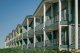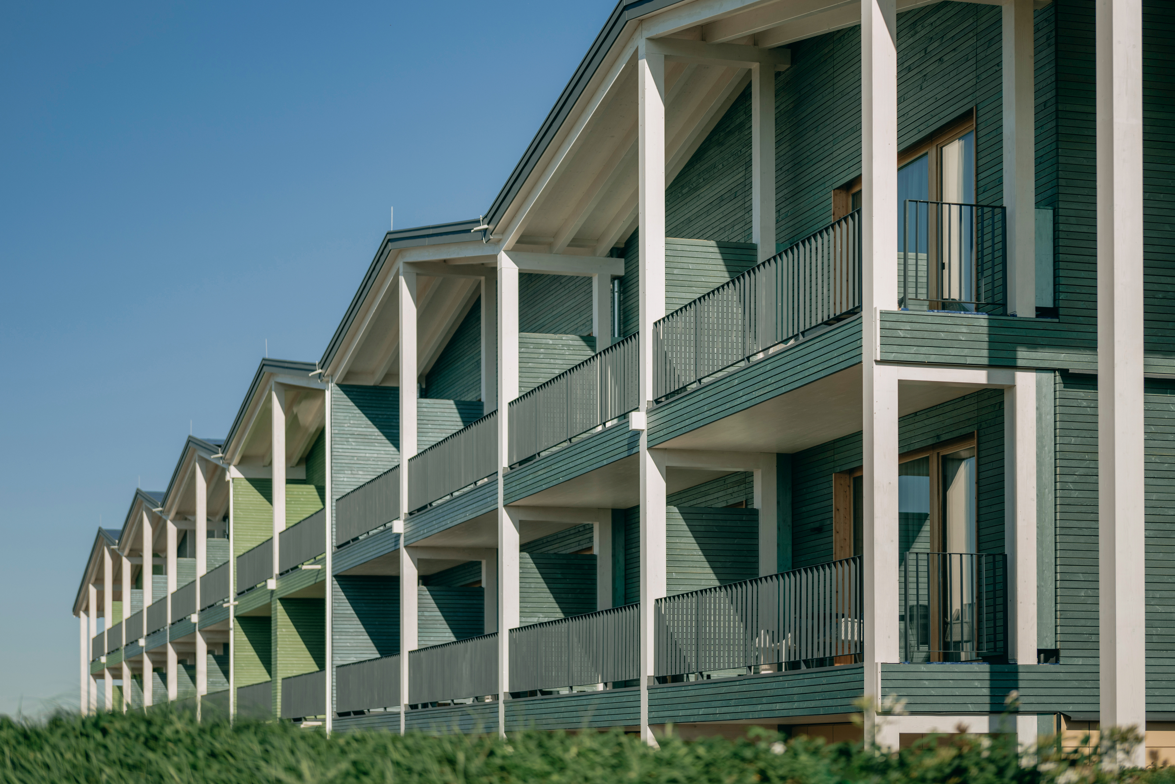 Das neue, dreigeschossige Holzgebäude steht zwar mitten im Feld, sieht aber aus, als gehöre es genau dorthin. Das liegt vermutlich auch an der gelungenen Fassadengestaltung. Die sollte farbig sein und sich gleichzeitig gut in die Landschaft und die anderen Gebäude des Areals einfügen – einladend und abwechslungsreich. Dass es eine Mischfassade geworden ist, war die Idee des Architekten: Mit den stranggezogenen, handgefertigten Tonplatten wirkt das Sockelgeschoss supersolide und ist gleichzeitig Natur pur. Sein Wunsch war es auch, die Fassade senkrecht zu gliedern. "Es sollte wirken wie mehrere schmale Häuser nebeneinander", erläutert Rudolf Johannes Lais, "und das hat mit der Farbkombination des Caparol FarbDesignStudios prima funktioniert." Farbdesignerin Petra Ruhnau visualisierte den finalen Entwurf: mit Blau- und Grüntönen für die Holzfassade, dazu Stützen und Untersichten in frischem Weiß – perfekt zu den sandfarbenen Keramik-Elementen im Erdgeschoss und Eingangsbereich.