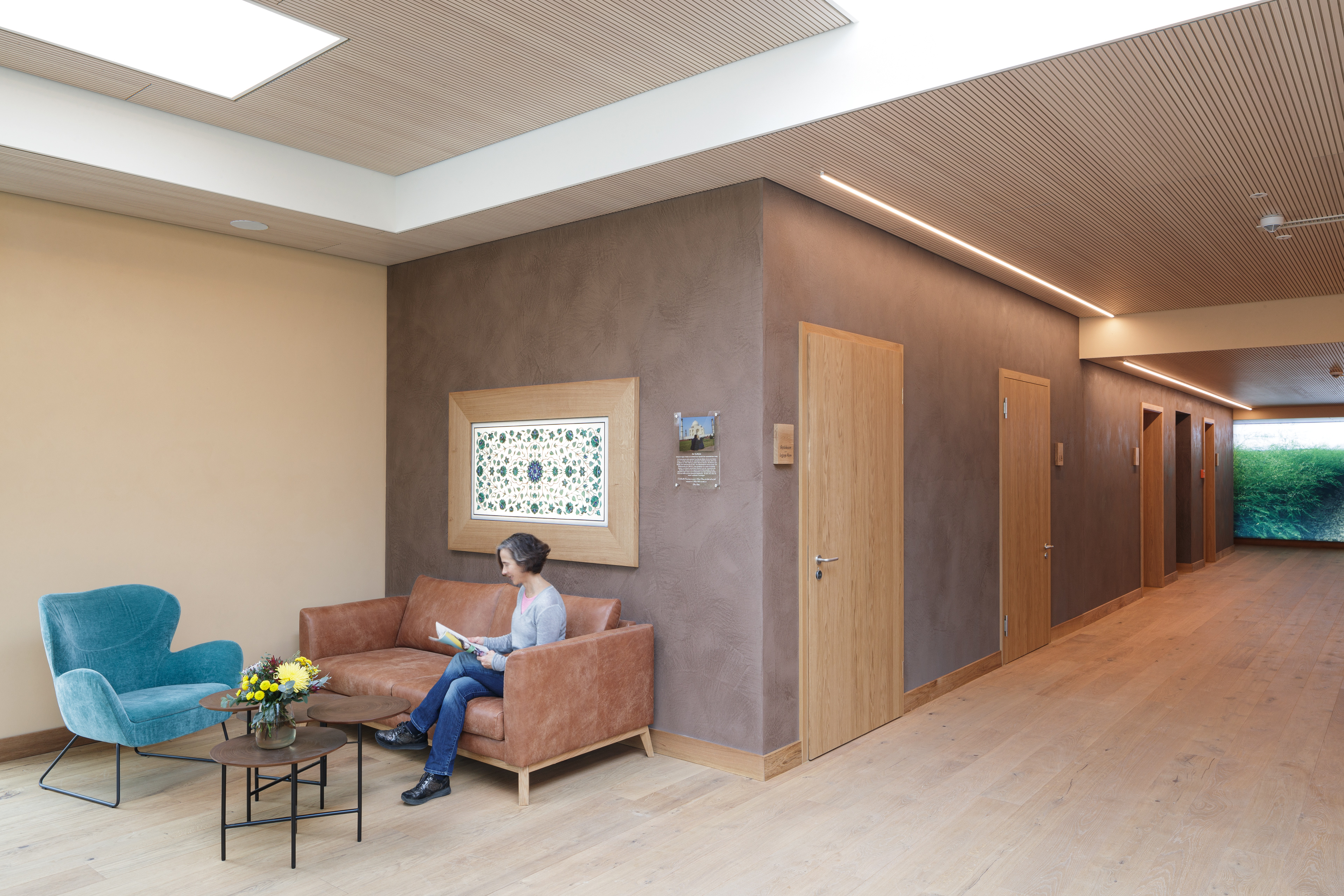 Auch innen spielt sich alles ganz natürlich ab: Basis für alle Stockwerke ist ein feiner Sandton (3D Curcuma 25), der die Farbrichtung der Holzdecken weiterführt und mit den verschiedenfarbigen Bodenbelägen in den Stockwerken harmoniert. Mit CapaGreen Indeko-plus kam dabei ein Produkt mit besonders hohem Deckvermögen zum Einsatz. Die ressourcenschonende Innenfarbe passt mit ihrer lösemittel- und konservierungsmittelfreien E.L.F.+ Rezeptur auch inhaltlich gut zu den natürlichen Tönen und als Teil des CapaGreen-Sortiments zeichnet sie sich außerdem durch klimaneutrale Produktion, eine nachhaltige Verpackung (Stand April 2023: 70% Recyclat aus dem gelben Sack!) und nachhaltige Bindemittel aus.