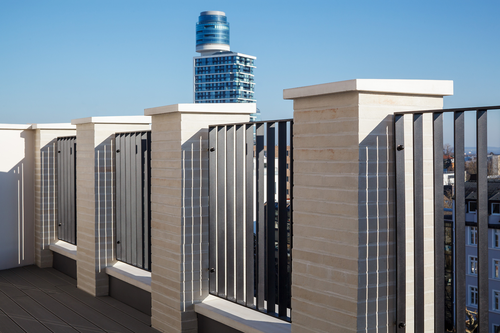 Mersudin Kurgas gibt weitere Einblicke in das Projekt: „Für uns als im Vergleich kleiner Malerbetrieb war nicht nur die Größe des Projekts, sondern auch das gesamte Konzept der Fassade beeindruckend", erzählt er. „Die Besonderheit beim Objekt in der Darmstädter Landstraße bestand vor allem im Zusammenspiel der Materialen. Neben dem Einsatz von Klinker und verschiedenen Putzarten haben wir als gestalterisches i-Tüpfelchen auch Caparol Faserbeton-Elemente in Form von Brüstungsabdeckungen, Fensterbänken und Stützenabdeckungen verbaut. Ein Gewinn für die Gestaltung, denn die Fassade wirkt dadurch noch wertiger und lebendiger."
