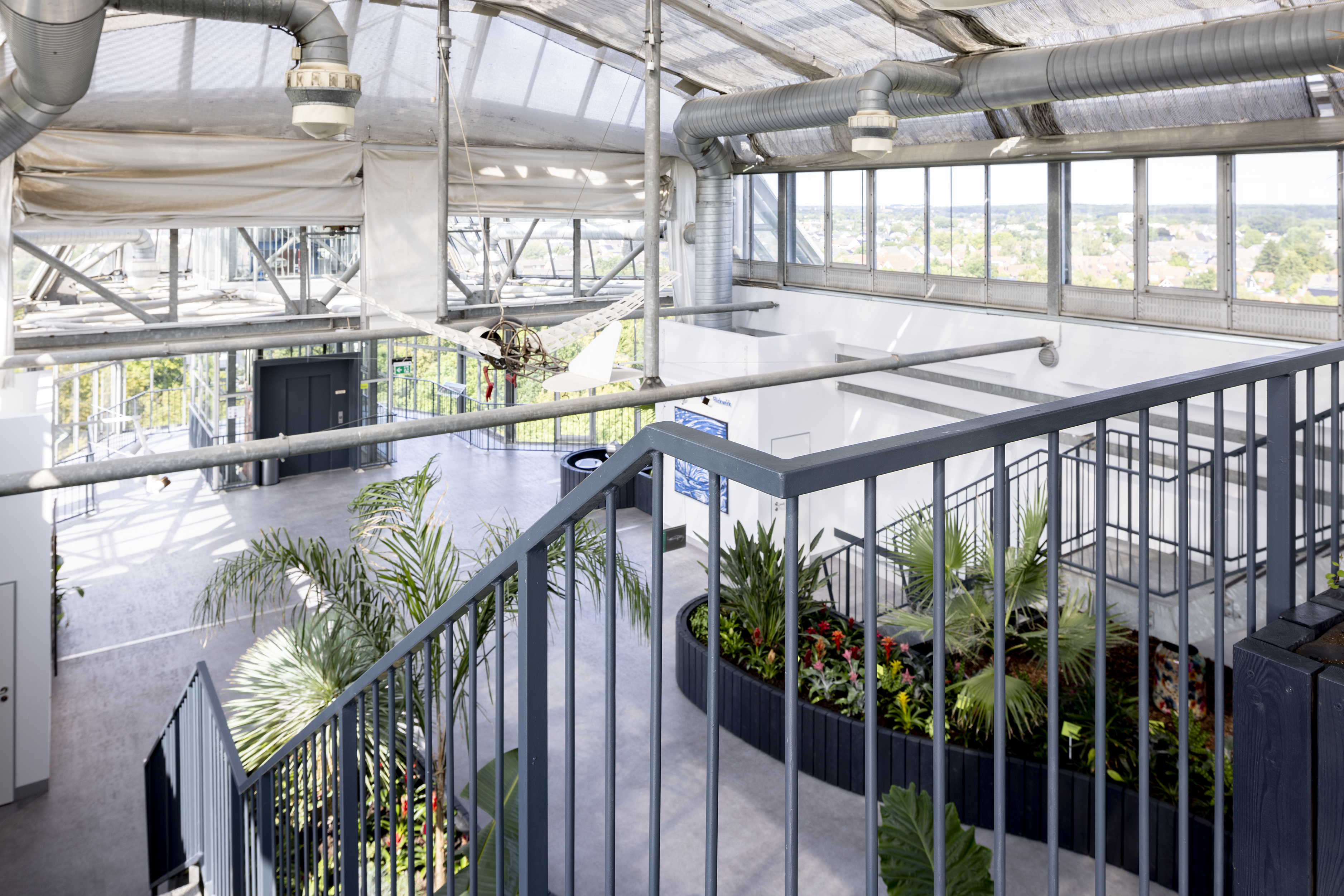 Mit umfassenden Umbau- und Renovierungsarbeiten war es möglich, die gesteckten Ziele zu realisieren: Dabei wurden nicht nur der Estrich und die Bepflanzung komplett erneuert, sondern auch die Innenwände, die Fahrstuhltüren sowie die Geländer an Treppen und den oberen Etagen mit einem frischen Anstrich versehen. Oberste Priorität hatte dabei das Thema Besuchersicherheit.