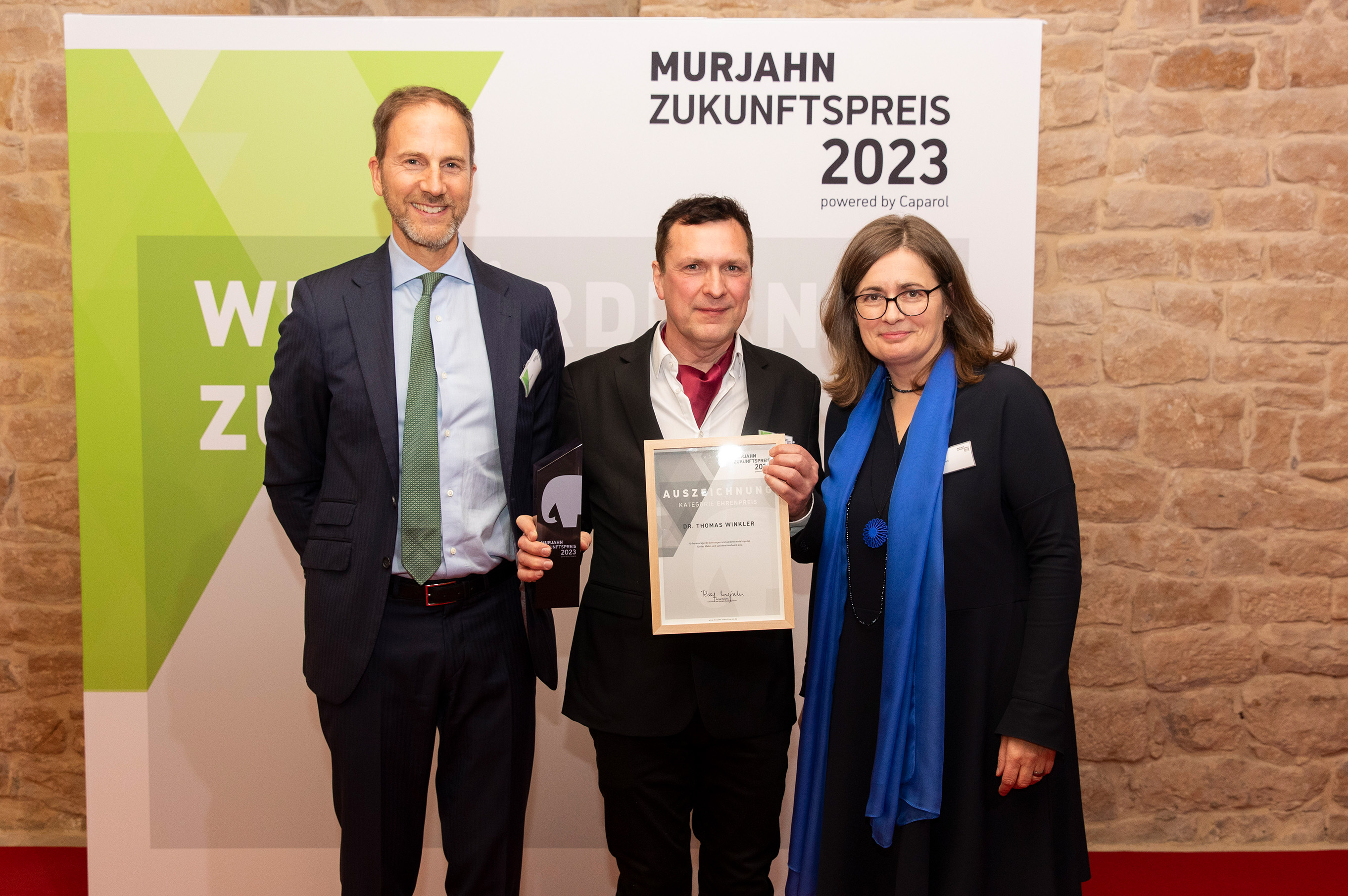 Die Kategorien des Murjahn Zukunftspreises reichen weit über Technik, Gestaltung und aktuelle Herausforderungen der Branche hinaus. So gibt es auch einen Ehrenpreis, mit dem herausragende Leistungen honoriert werden, die für das Maler- und Stuckateurhandwerk von zukunftsweisender Bedeutung sind. Die Wahl der Jury fiel hier auf Dr. Thomas Winkler von den Staatlichen Berufsbildenden Schulen (SBBS) Eichsfeld, der sich mit dem „Maler-Projekt InForm“ beworben hatte – einem Lernkonzept für Berufsschulen zur Unterstützung der Ausbildung im Bereich Farbe basierend auf über 25 Jahren Berufsschulpraxis. In der Laudatio von Farbdesignerin Margit Vollmert wurde insbesondere die Angebotsvielfalt gewürdigt, die neben der Software, die eine komplette Unterrichtsvorbereitung enthält, zudem eine Fachbuchreihe, Lernhefte, Filme, Arbeitsblätter sowie diverse Malerwerkzeuge umfasst.