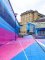 „Ich will einen Raum schaffen, in dem man sich gerne aufhält und wohlfühlt“ erklärt die in Bautzen geborene Künstlerin. Für die Fassaden hat sie Blau- und Magentaabstufungen gewählt, weil diese Farben Energie ausstrahlen, aber nicht überfordern. „Meine anderen Bilder sind zum Teil noch viel viel farbiger, aber wenn ich ganz viele Extremfarben nehme, wird es zu unruhig,“ sagt sie. Erstmals hat die Streetart-Expertin für die großen Flächen die Caparol Fassadenfarbe Muresko auf SilaCryl Basis verwendet, die sie verdünnt mit dem Airless-Spritzgerät aufgetragen hat. Die Farben wurden von Caparol nach ihren Wünschen abgetönt. Von Graffiti-Sprayfarben kommt sie mehr und mehr ab, weil diese sich nicht für große Flächen eignen und nur von begrenzter Haltbarkeit sind. Dabei hat sie selbst über 10 Jahre Lackfarben für eine auf Graffiti-Produkte spezialisierte Firma entwickelt. Von schwer zu recyclenden Sprühdosen will sie sich aus Umweltschutzgründen verabschieden. Während der Malarbeiten am Darmstädter Museumsobjekt konnte sie sich von den Vorteilen von Muresko überzeugen. Die Caparol Fassadenfarbe bietet höchste Farbtonvielfalt und zugleich höchste Farbtonstabilität, sie schützt das Mauerwerk vor Regenwasser und Feuchtigkeit und dank der Filmkonservierung auch vor der Besiedlung von Algen und Pilzen. Die Darmstädter werden also noch lange Freude am Werk von MadC haben.