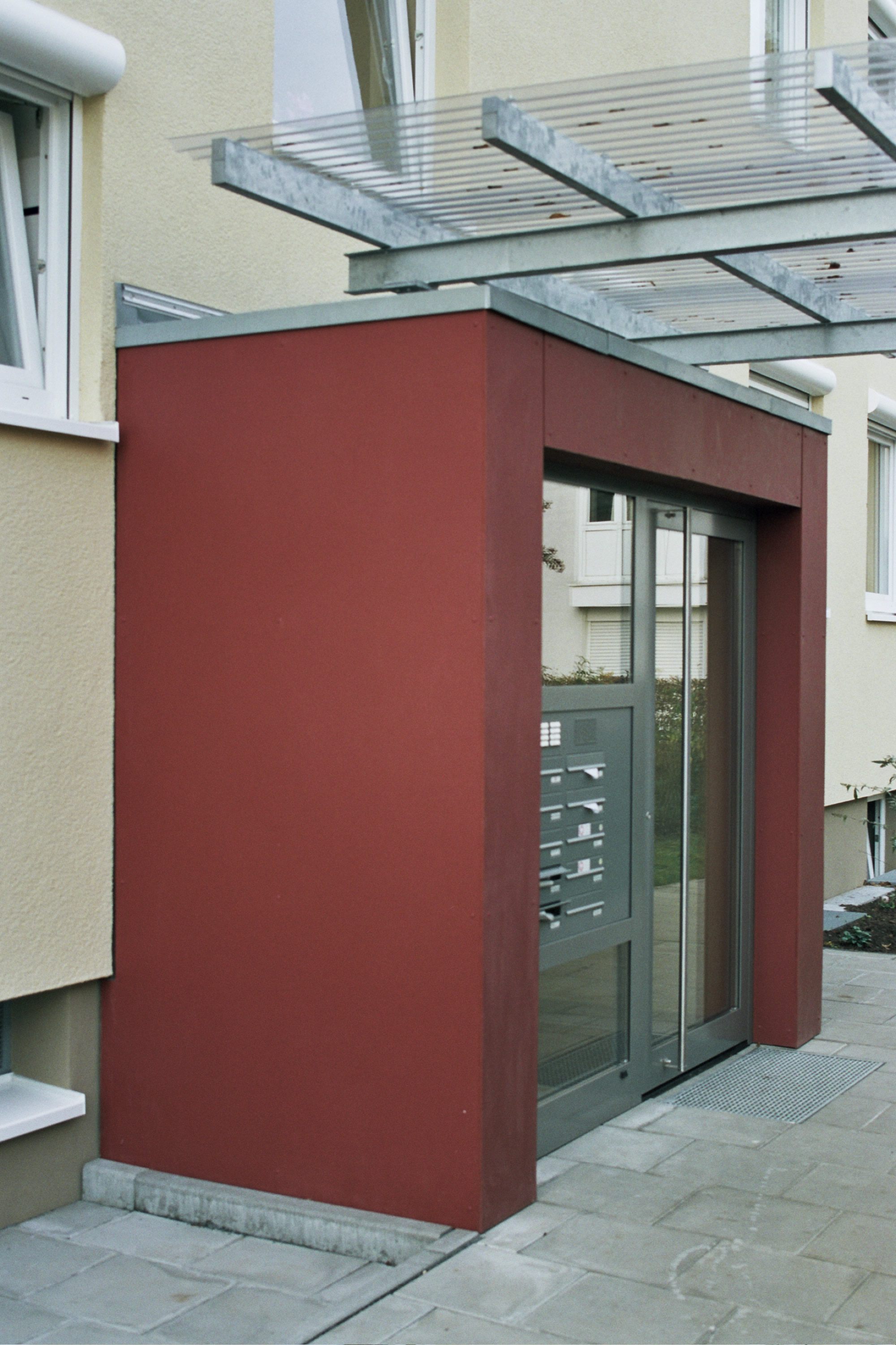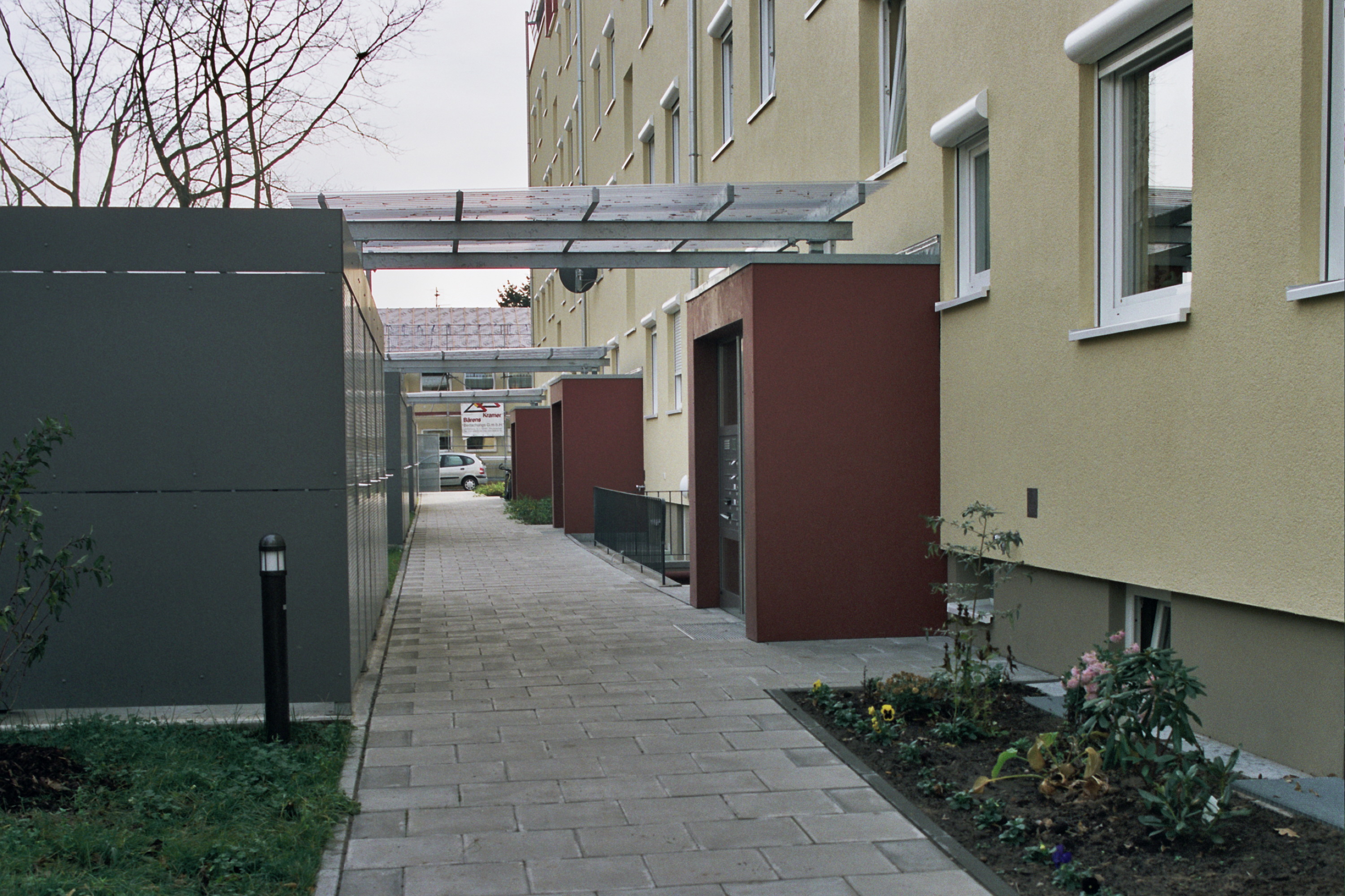 Die alten mit Treppenstufen versehenen dunklen und engen Hauseingänge wurden entfernt. Mit den jetzt kubisch gestalteten Hauszugängen erweitert sich der Eingangsbereich und stellt gleichzeitig eine deutliche Verbindung zu den mit dem gleichen Material und in analoger Form gestalteten Treppenhausköpfen im Dachgeschoss dar. Vor den Eingängen sorgen Vordächer für wettergeschützte Zugänge sowohl zum Haus selbst als auch zu den Fahrradabstellboxen. Die Zugangswege im Außenbereich wurden angehoben und ermöglichen damit ein barrierefreies Betreten der Häuser.