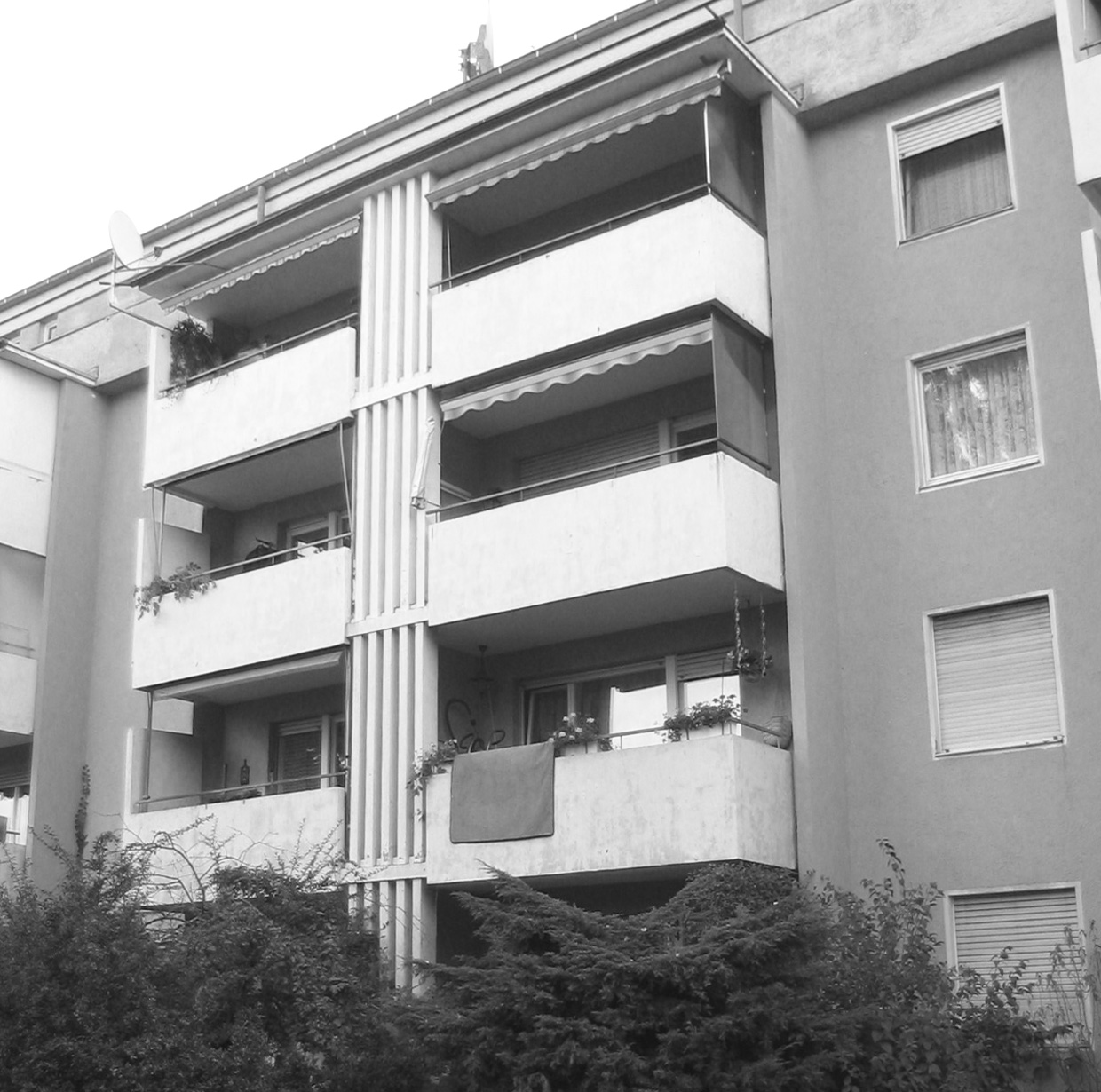 Im ursprünglichen Zustand verfügten die 24 Wohnungen über Balkone mit massiven Brüstungen: Wärmebrücken, Abdichtungsschwachstellen sowie die geringe Tiefe stellten dabei besondere Probleme dar. Deswegen wurden die vorhandenen Deckenplatten der Balkone abgetrennt. Vor der Fassade wurden neue frei stehende Balkone angebracht, die sich nach Süden und Westen orientieren. Durch ihre größere Tiefe verbessern sie die Wohnqualität.