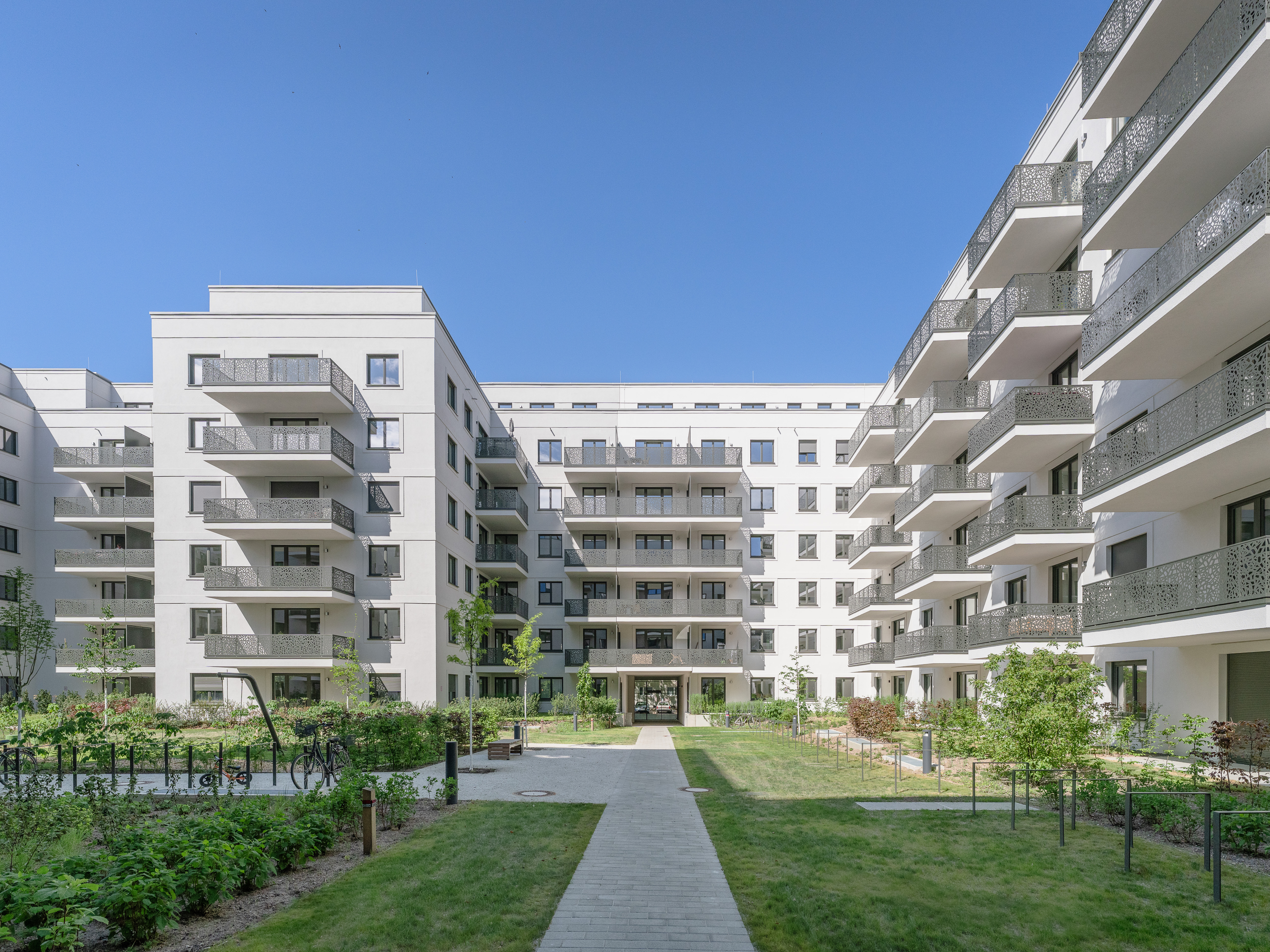 Das siebengeschossige Ensemble mit insgesamt 219 Wohneinheiten und acht Gewerbeflächen schließt nicht nur eine städtebauliche Lücke im Schöneberger Gründerzeitquartier, sondern schafft auch eine gestalterische Verbindung zur zeitgenössischen Baukultur. Die Architektursprache orientiert sich am klassischen Berliner Stadthaus, interpretiert diese jedoch zeitgemäß. Die Gliederung in fünf Gebäudesegmente sorgt für Identität und eine klare Adressbildung.