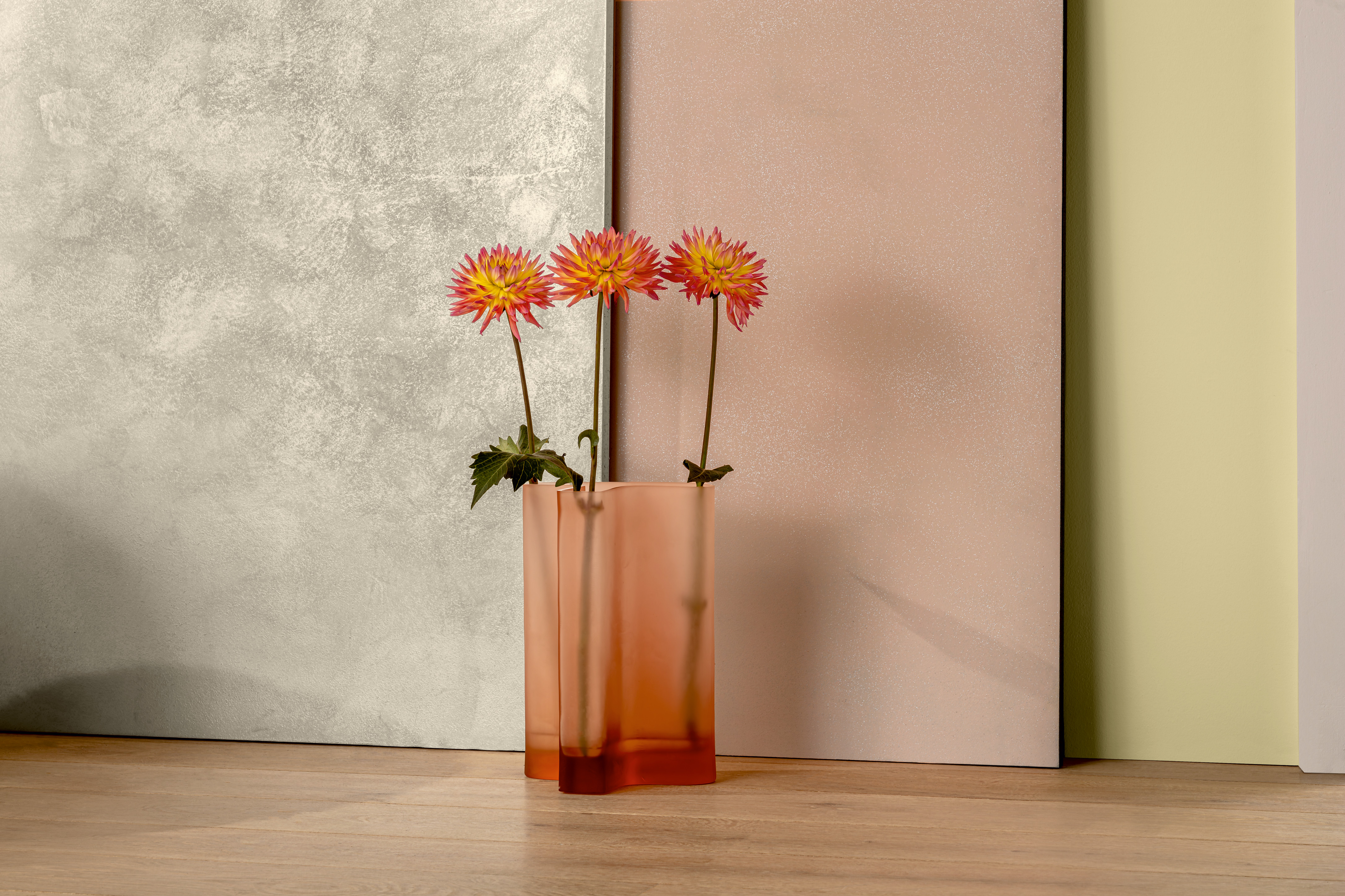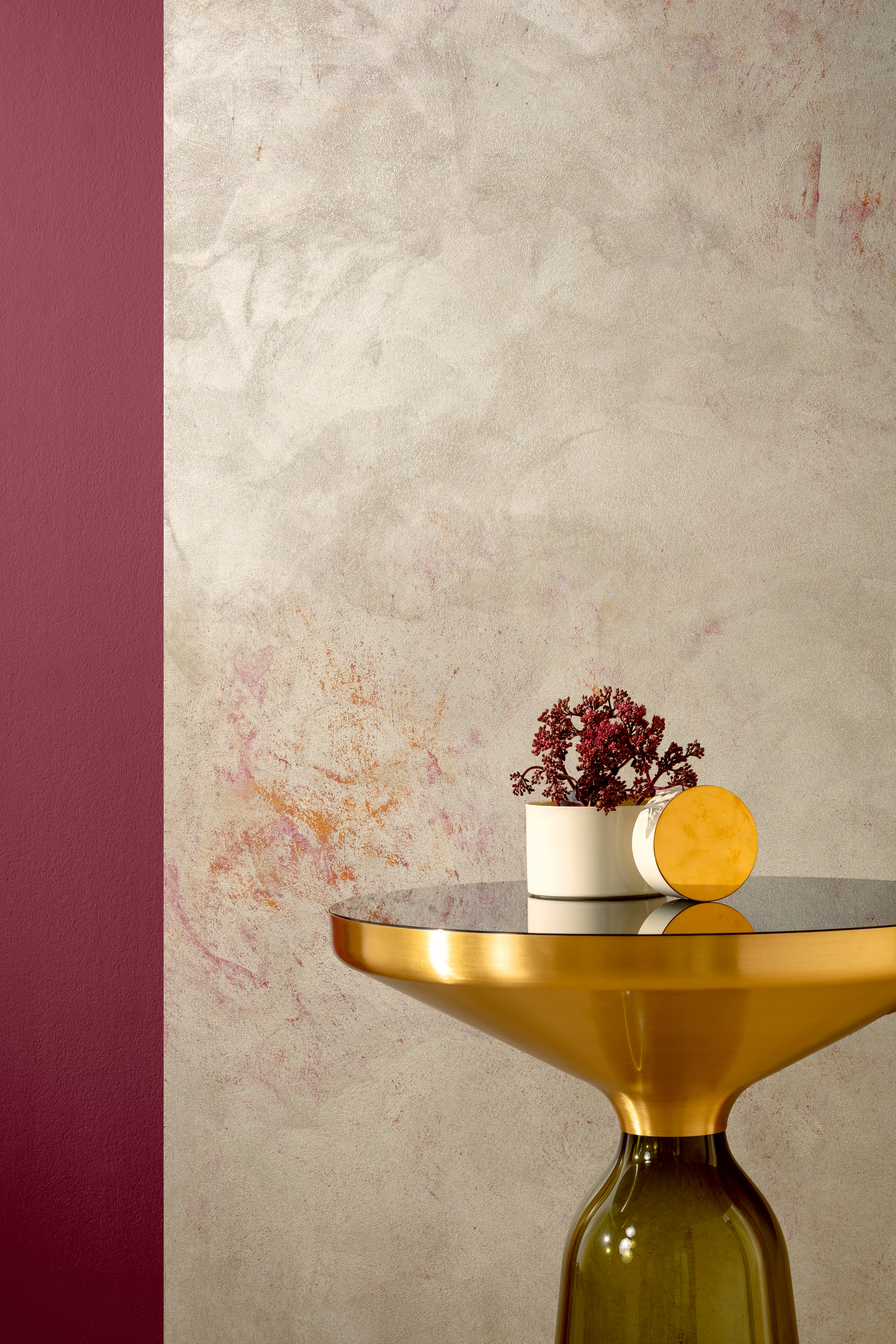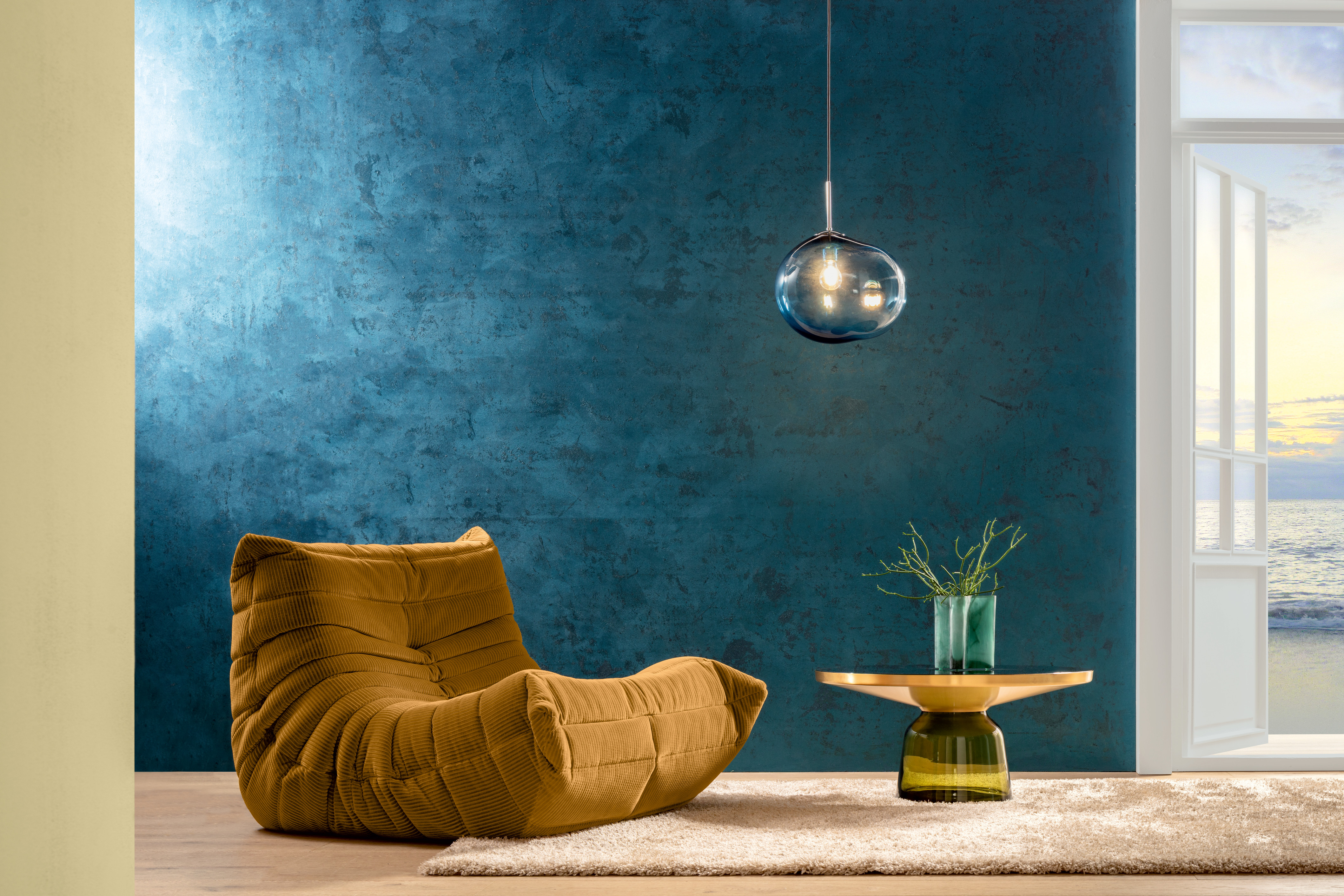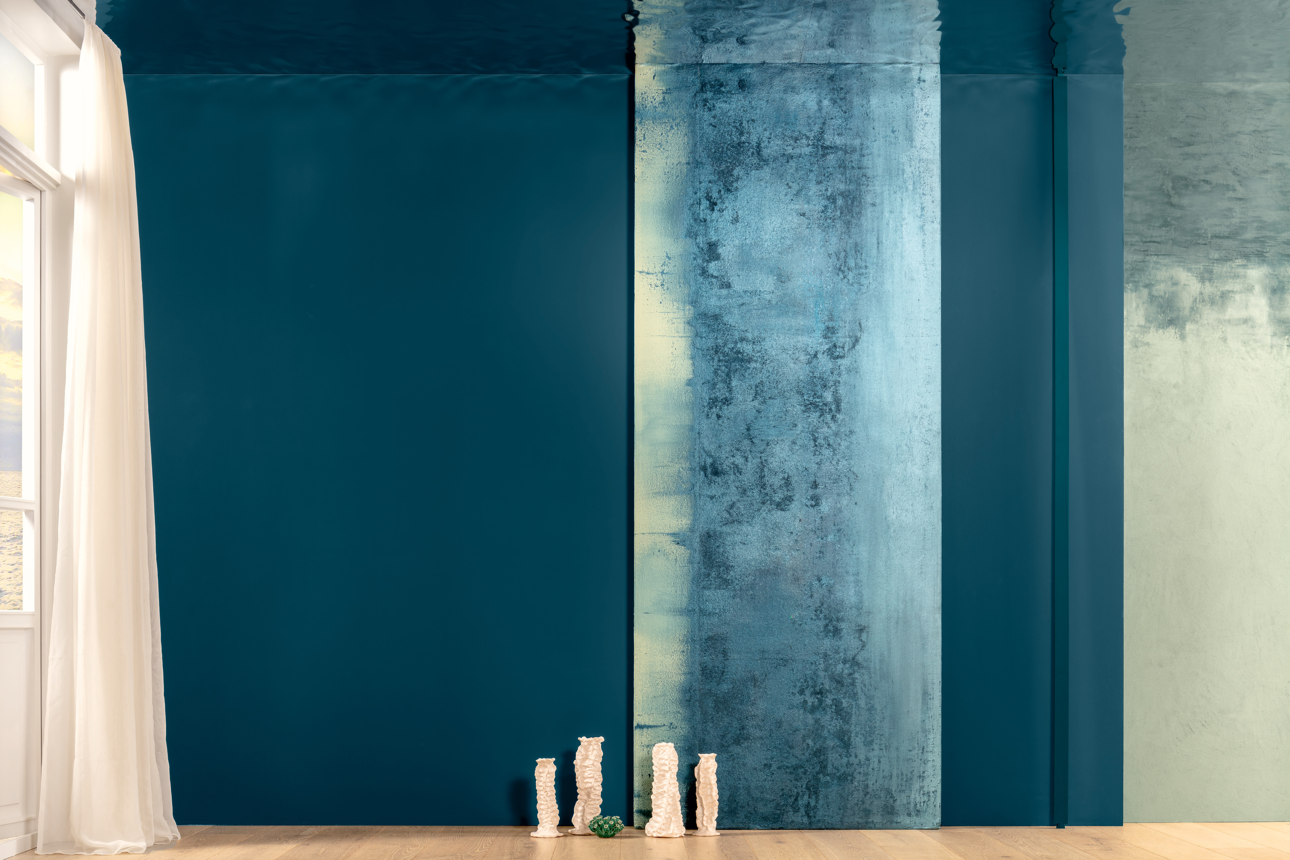 Dass die Trendfarben 2026 die Dualität von Über- und Unterwasser-Perspektiven verbinden, veranschaulicht besonders die Kreativ-Oberfläche des Jahres. „Stucco Eleganza Fusion“ greift wie schon die Oberfläche des Vorjahres auf das vielseitige Standardprodukt Stucco Eleganza zurück. Das Material mit seiner seidig-perlmuttartigen Oberflächenwirkung wird zunächst zweifach per Venezianerkelle im Farbton des Jahres vollflächig aufgespachtelt. Nach der Trocknung appliziert man – wiederum mit der Kelle – kreisförmig die metallisch pigmentierte und mit Quarzkörnchen angereicherte Metallocryl-Dispersion. Gerade der Quarzzuschlag ist für die Gesamtwirkung elementar, denn diese Quarzteilchen mit ihrer rauen Haptik und Optik ergänzen die Tiefe des Blaus, die seidige Basisfläche und die illustren Pigment-Reflexe mit einem gänzlich anderen, mineralisch-substanziellen Effekt. Die Helligkeiten der beiden Farbnuancen unterscheiden sich übrigens nur marginal. Reflexe, Tiefe, Strömungen und scheinbar fließende Partikel stehen assoziativ für den Ozean. Dass bei der Entwicklung über die Ästhetik hinausgedacht wird, versteht sich von selbst: Die Oberfläche des Jahres ist sowohl rationell sowie sicher handwerklich umsetzbar.