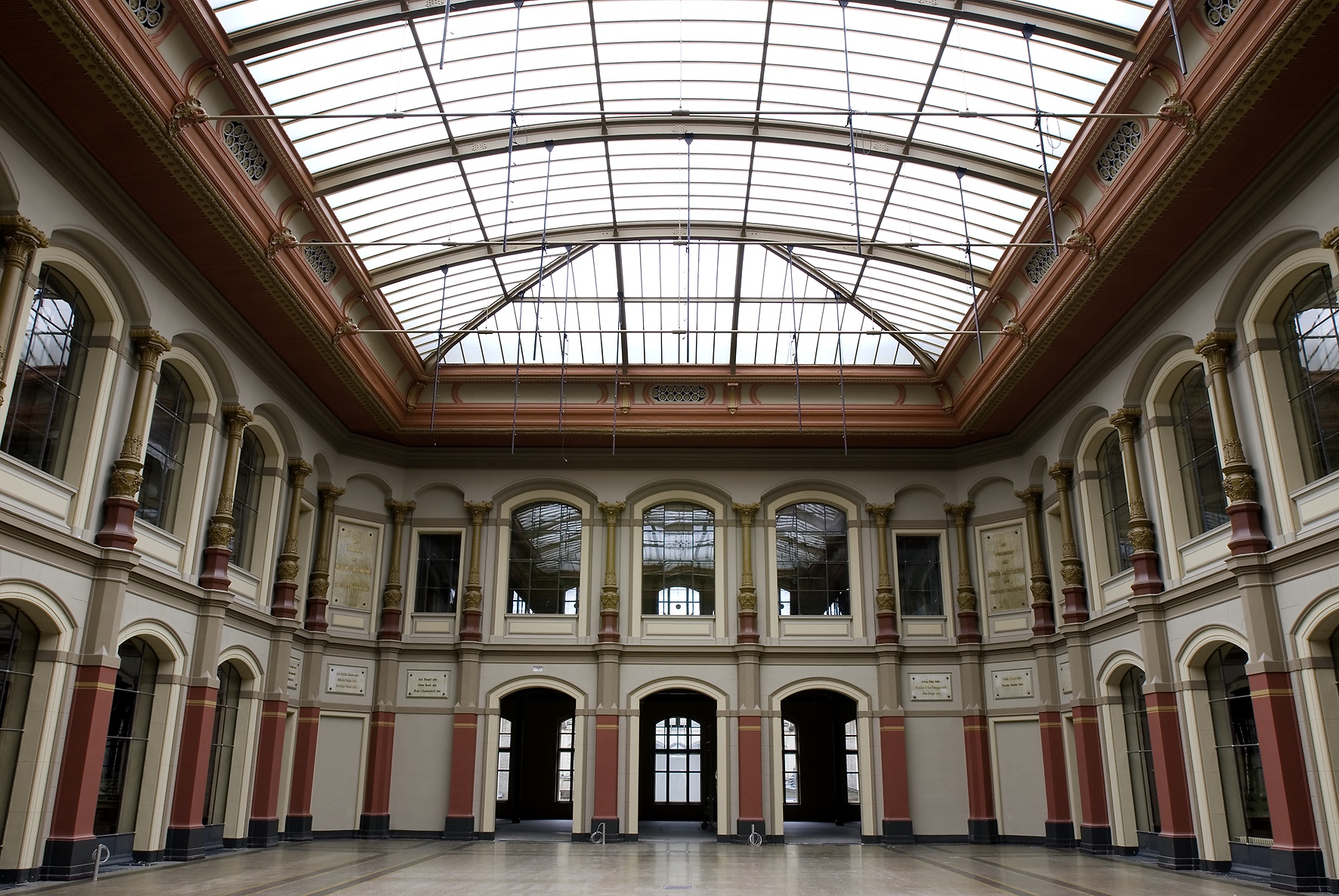 Den Farbauftrag bezeichneten die Restauratoren als "Malen nach Zahlen". Denn jeder Fläche wurde der entsprechende Farbton mit einer Zahl zugeordnet. Numerisch hatte sich eine Bilanz von rund 40 reproduzierbaren Farbtönen ergeben. Als geeigneter Anstrich für die Neufassung auf dem Putzuntergrund mit seinen alten Leimfarben bot sich die reversible Caparol-Emulsionsfarbe mit ihrem tuchmatten Charakter an. Mit der Bürste aufgetragen, ergibt sie eine Oberfläche, die ihre handwerklichen Herkunft nicht verleugnet. In der Ausschreibung der Malerarbeiten setzte sich die Berliner Tunnat-Mannhold Malermeister GmbH durch, bei der die rund 17 000 m² Wand- und Deckenfläche in guten Händen war. Die Farben wurden vom Hersteller abgetönt und bei gewünschten Korrekturen nachrezeptiert. Die gute Zusammenarbeit von Alexandra Restaurierungen, Farbhersteller und Verarbeiter erwies sich als solide Grundlage für den termingerechten Abschluss der mit großer Zustimmung aufgenommenen Restaurierung.