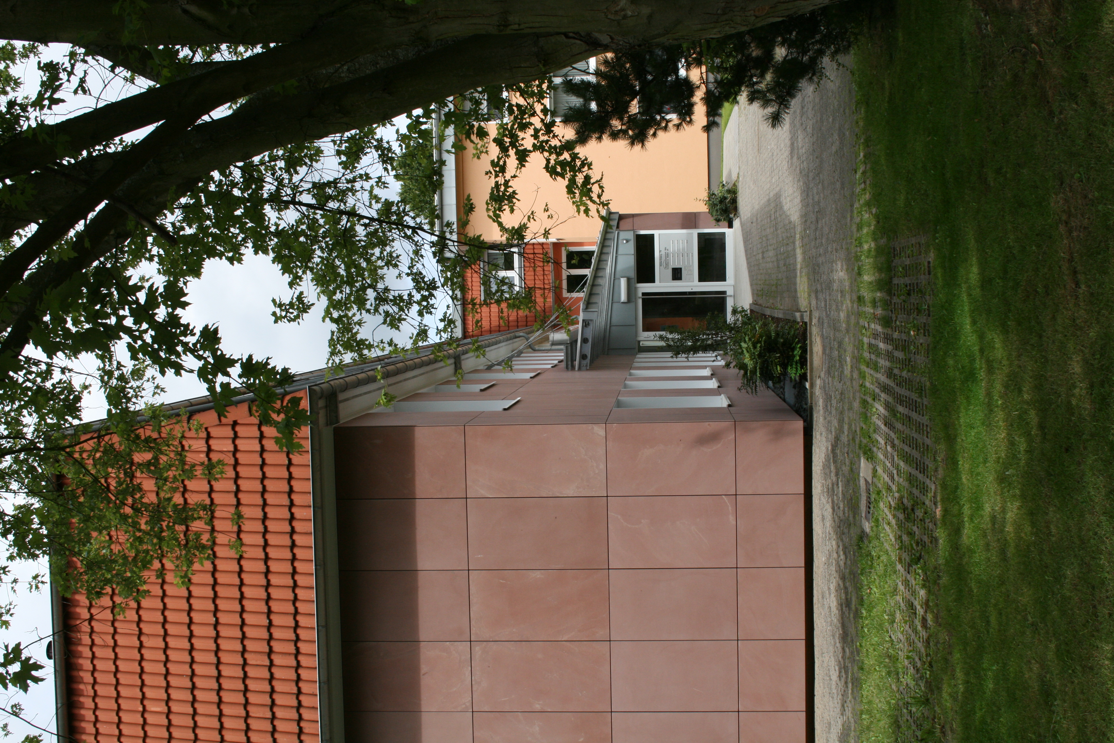 Die Erschließungsbereiche und Eingänge erhielten daher aus diesem Grund eine gesättigte orangerote Farbigkeit. Die Hauptfassaden sind korrespondierend zum vorhandenen Hellgelb in gesättigteren rötlichen Gelb- und Grautönen gehalten.