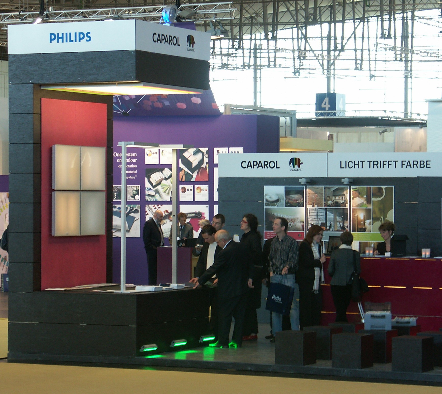 Auch der Caparol-Gemeinschaftsstandsstand mit dem Lichthersteller Philips unter dem Motto: "Farbe trifft Licht – Licht trifft Farbe" in Halle 4 war Quelle umfassender Gestaltungskompetenz. Die Besucher erfuhren auf eindrucksvolle Weise, wie durch Kombination von Licht, Farbton und Werkstoff eine kreative Vielfalt für Raumoberflächen entsteht. Dabei präsentierte das Unternehmen mit FantasticFleece eine neue Oberflächentechnik, deren raffinierte Tiefenwirkung und transparente Mehrschichtigkeit eine einzigartige Optik ermöglicht. Die Oberfläche dieses speziellen Glasvlieses ist in unterschiedlichen Dessinstrukturen mit weißer Farbe vorbedruckt. Zwölf Dessins entfalten ihre außergewöhnlichen gestalterischen Möglichkeiten, wenn sie mit abgetönter Caparol Deco-Lasur im einmaligen Bürstenauftrag beschichtet werden. Die eindrucksvolle Tiefenwirkung entsteht durch das differenzierte Saugverhalten des neuen vorbedruckten Glasvlieses FantasticFleece. Jede Oberfläche ist ein handgefertigtes Unikat und unterstreicht den einzigartigen Charakter dieses Materials und der Gestaltungstechnik."