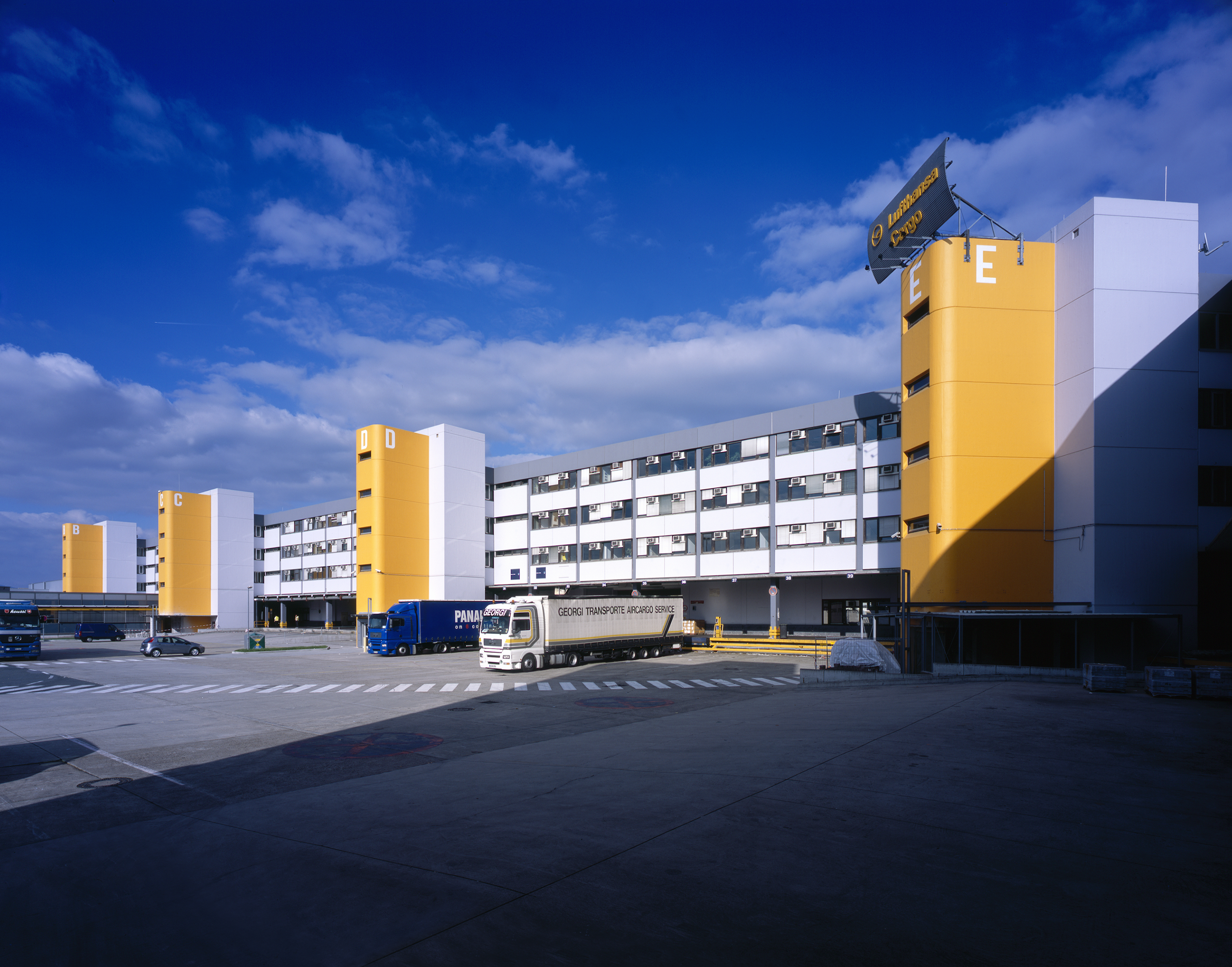 Wer in letzter Zeit vom Frankfurter Flughafen gestartet oder dort gelandet ist, dem dürften sieben gelbe Quader aufgefallen sein. Wie Türme ragen sie 21 Meter hoch in den Himmel. Das L-förmige Gebäude erfährt durch diese kräftigen Akzente eine deutliche vertikale Gliederung. Die Türme dienen als Treppenhäuser des Hallen- und Verwaltungskomplexes der Lufthansa Cargo AG. Seit der Verjüngungskur und dem gleichzeitigen Modernisierungsprogramm Anfang 2007 geben sie den Ton an.