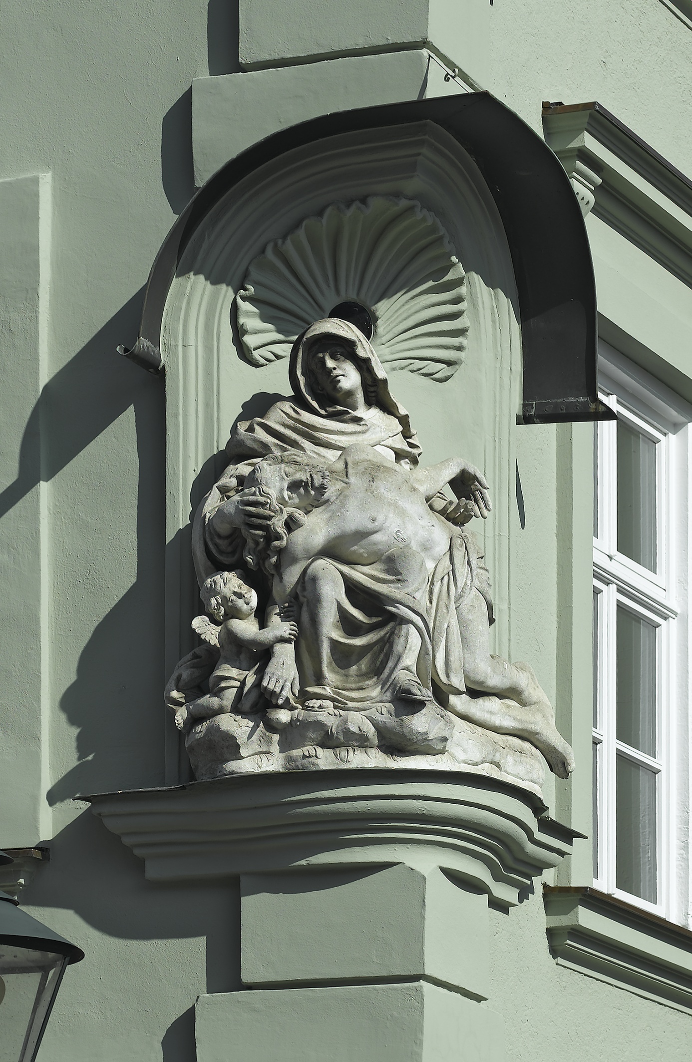 Zur Beschichtung wurden Silikatfarben ausgeschrieben. Diese Art von Anstrichstoffen besitzt hervorragende bauphysikalische Eigenschaften wie Lichtbeständigkeit, Nichtbrennbarkeit sowie hohes Wasserdampfdiffusionsvermögen. Der ausführende Malerbetrieb entschied sich für silikatische Produkte der Firma Caparol. Nach der Fassadenreinigung und der Ausbesserung von Putzausbrüchen und Fehlerstellen erfolgte die Ausführung im Caparol-Histolith-System. Die Neuputzstellen wurden fluatiert, um die Sinterschichten zu entfernen. Nach dem Nachwaschen mit Wasser erfolgte ein zweimaliger Anstrich mit abgetönter Dispersions-Silikatfarbe "Histolith Außenquarz". Die Histolith Dispersions-Silikatfarbe "Außenquarz" ist durch die einzigartige Doppeltverkieselung ungewöhnlich kreidungsstabil, hoch deckend, widerstandsfähig gegen saure Luftschadstoffe und beeindruckt durch ihre tuchmatte Oberfläche. Den Sockelbereich ließ man mit Histolith-Fassadenputz ausbessern und anschließend mit Histolith-Außenquarz beschichten. Die Fensterflügel im ersten und zweiten Obergeschoss wurden abgeschliffen und weiß lackiert, die Fensterrahmungen und Gusseisenstützen im Erdgeschoss beschichtete man auf Empfehlung des Restauratorenteams farblich abgesetzt in kräftigem Petrolgrün. Die Hausfigur, die Kopie einer Pietà des mittleren 18. Jahrhunderts, wurde gereinigt, fehlende Teile wurden ergänzt und eingefärbt.