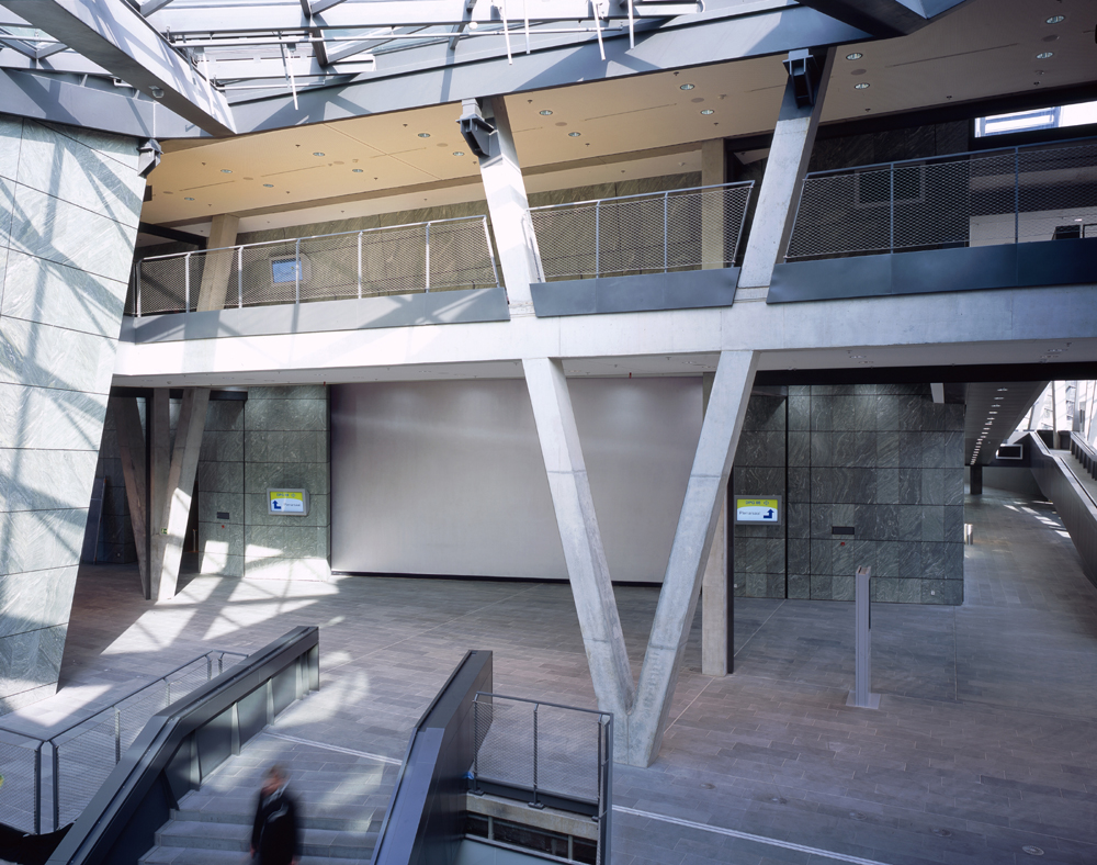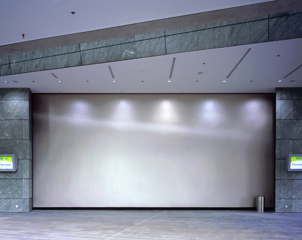 Die Innenraumgestaltung erfolgte nach den Konzepten der ARGE Funk und Schröder, Thio und Mulzer, Chalabi/Wien. Die meisten Flächen im Innenbereich sind in Sichtbeton ausgeführt, um die Materialität zu verdeutlichen. Die Wand vor dem Kongresssaal wurde farblich angelegt. Passend zu dem avantgardistischen Ambiente entschied man sich für die Effektbeschichtung MetalloCryl Interior in Silber von Caparol, die dem Vorraum mit ihrer metallischen Wirkung eine exklusive Ausstrahlung verleiht.