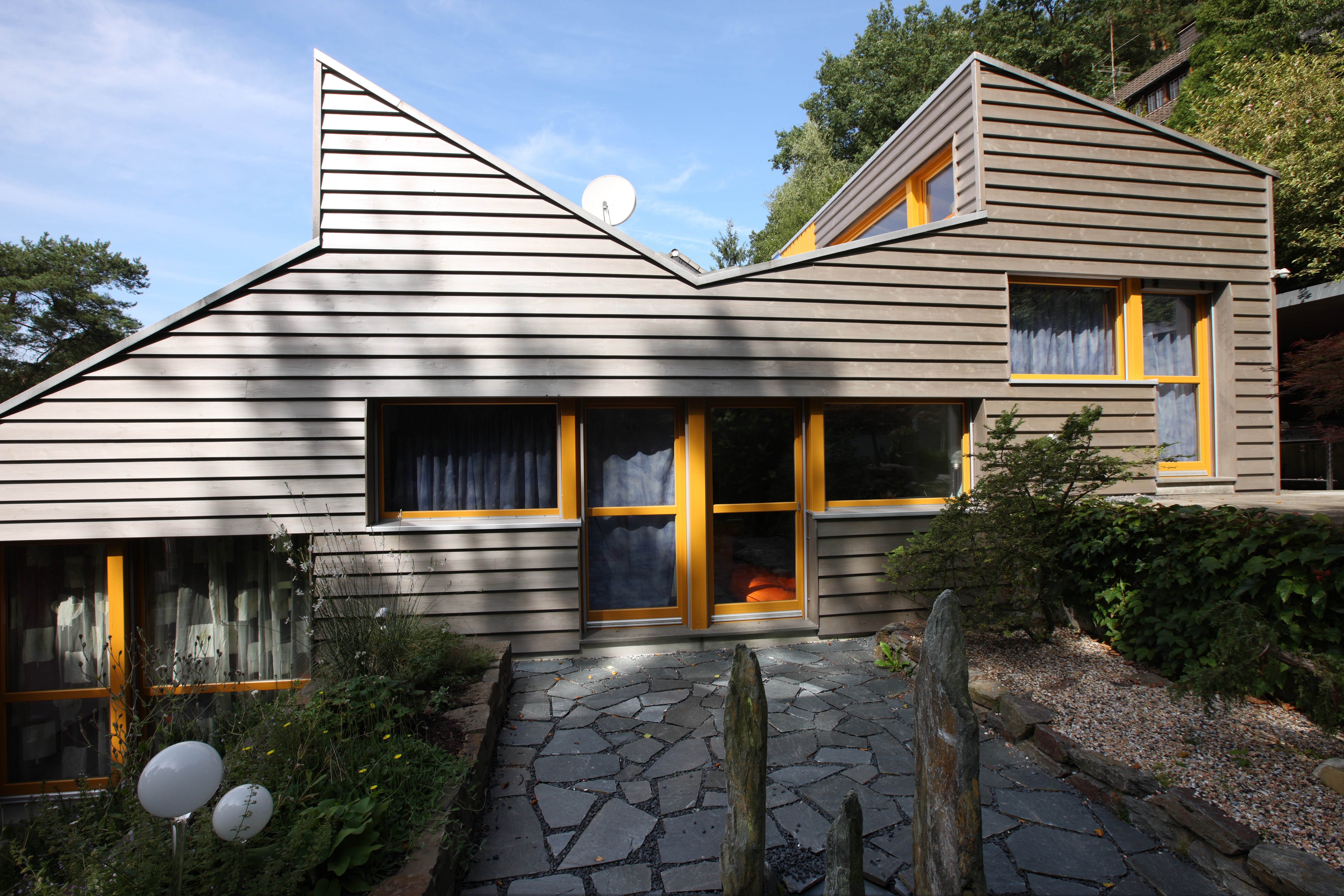 Das ist auch bei dem architektonisch außergewöhnlichen Wohnhaus der Familie Schmitz in Rösrath der Fall, entworfen von dem Architekten und Schreiner Ralf Wirths aus Morsbach. Die Fassadenbekleidung des vielgestaltigen Bauwerks besteht aus einer Stülpholzschalung aus Lärche. Nach zehn Jahren war die einst gräuliche Lasur stellenweise erheblich und sehr ungleichmäßig verwittert, die Verkleidung der Traufen wies Pilzbefall auf - eine Renovierung stand an. Auf Wunsch des Bauherrn sollte die ursprüngliche Farbgestaltung mit grauer Lasur nicht wesentlich verändert werden, die neue Beschichtung sollte die Architektur unterstreichen. Die Lösung war die neuartige Holzlasur Capadur GreyWood von Caparol. Mit dieser gering schichtbildenden Lasur auf Alkyd-Acrylharzbasis lassen sich lebendig wirkende Ansichten gleichmäßig abgewitterten Holzes erzielen, eine spezielle Pigmentkombination interpretiert die natürliche Vergrauung in naturnahen Farbtönen.