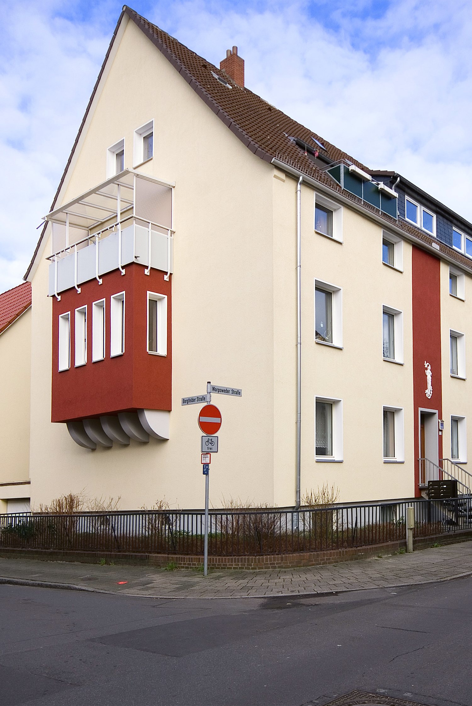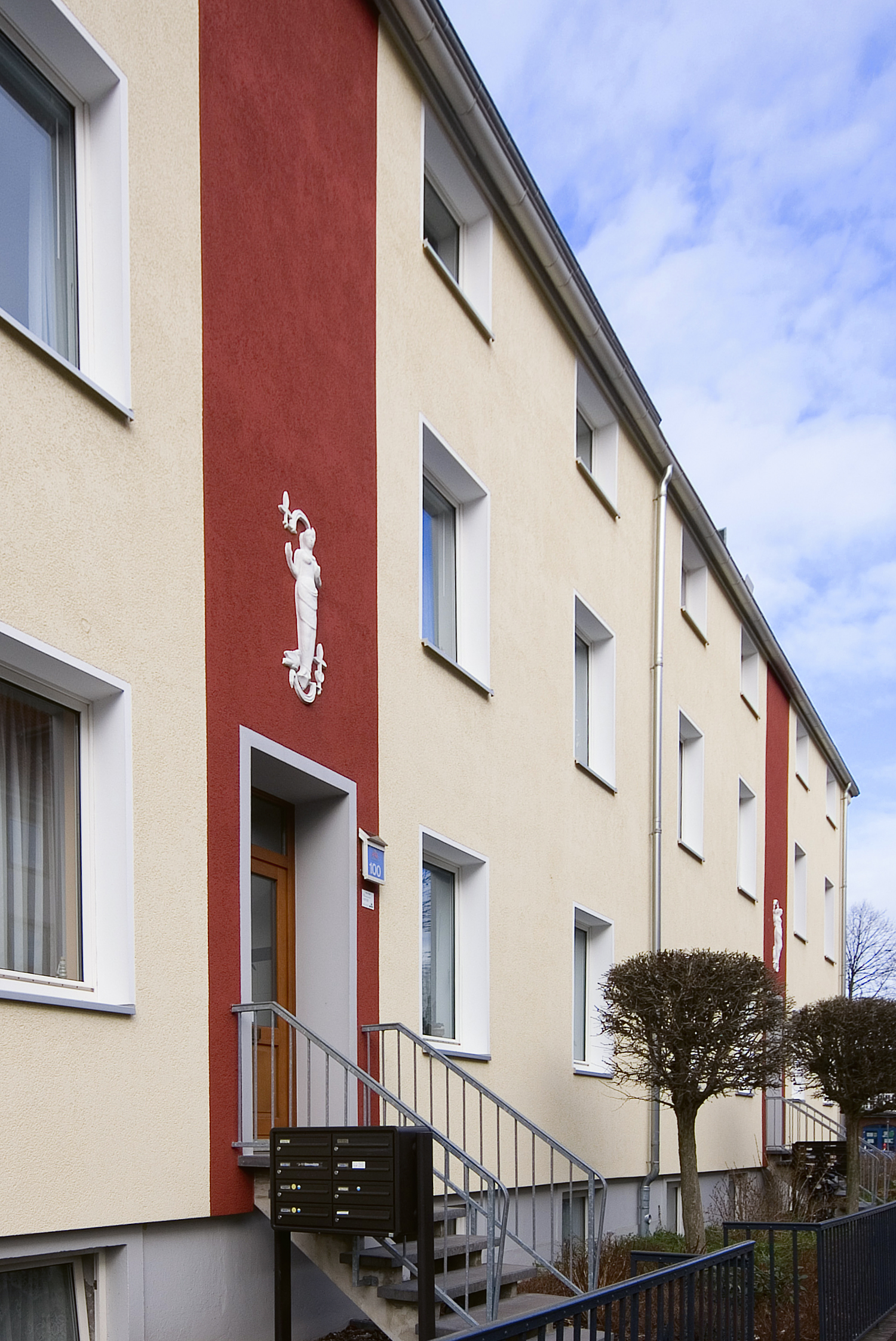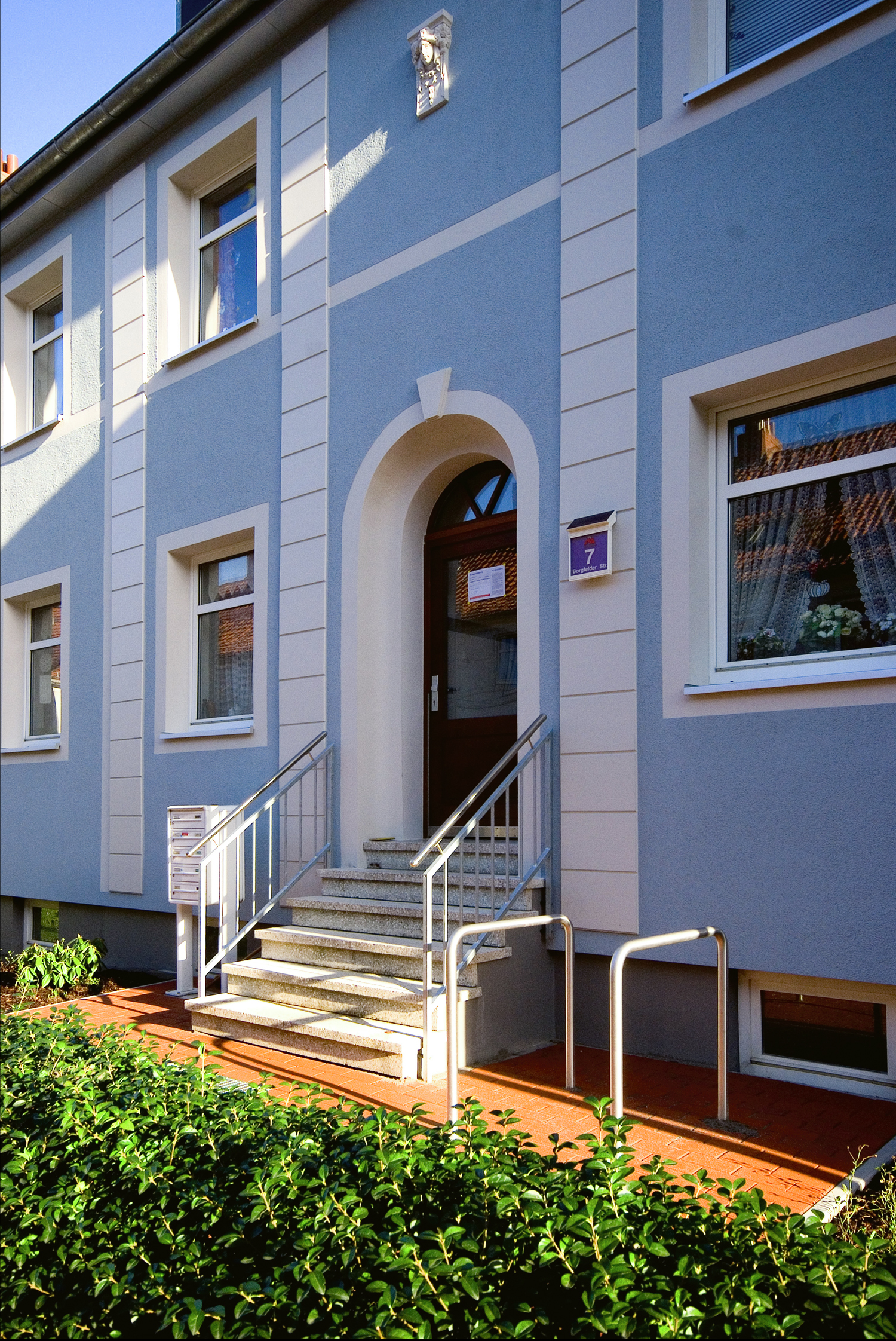 Nachdem Putz und nicht mehr tragfähige Altanstrichen von der freigelegten Wand entfernt worden waren, konnte bei der Montage des Capatect Wärmedämm-Verbundsystems ein flottes Tempo angeschlagen werden. Mehr Geduld und handwerkliches Geschick erforderte die Befestigung der Schmuckelemente am angestammten Platz. Ungeachtetet dessen lobte Jörn Schnakenberg die gute Handhabbarkeit der Capapor-Profile. Ursprünglich nicht vorhandene Farbigkeit brachten die Maler mit Unterstützung des FarbDesignStudios von Caparol in die Borgfelder und Worpsweder Straße. Der Farbentwurf entstand im Dialog zwischen Designern und Technischer Objektverwaltung der Genossenschaft. Die gewählte AmphiSilan-Spezialfarbe wurde mit dem hochmodernen NespriTEC-Verfahren in zwei Arbeitsgängen nebelfrei auf den Oberputz aufgesprüht und mit der Rolle verschlichtet. Hatten die Bewohner vor Beginn der Baumaßnahmen ihre Bedenken gegenüber allzu großen Veränderungen und Vereinfachungen zum Ausdruck gebracht, waren sie am Ende angesichts des überzeugenden Ergebnisses des Lobes voll.