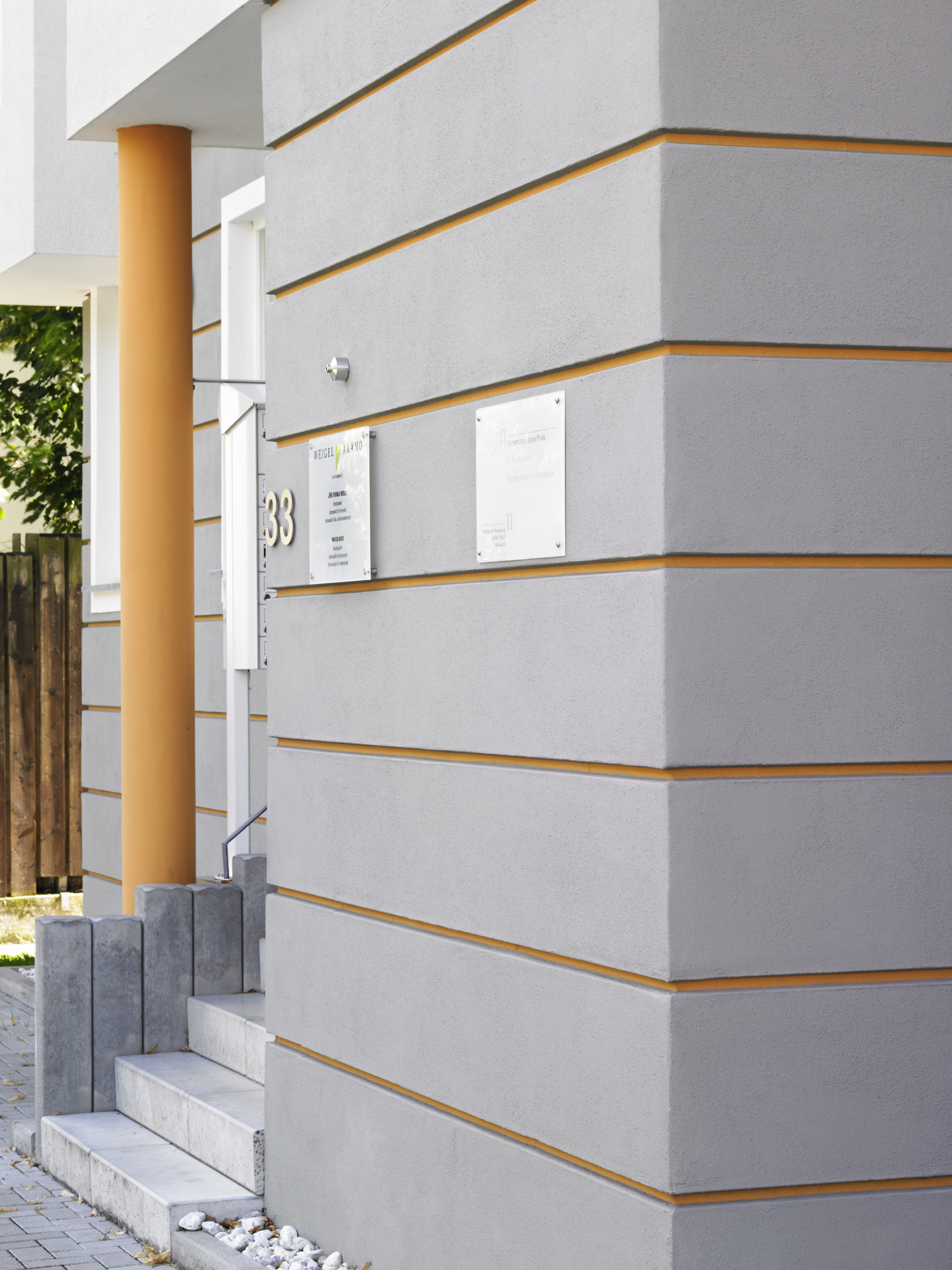 Die Fassade wurde mit den besonders wärmedämmfähigen und thermisch unempfindlichen grau-weiß gesprenkelten Capatect Dalmatinerplatten 160 gedämmt. Der Anstrich auf dem Mineralputz K 60 erfolgte mit der Fassadenfarbe ThermoSan von Caparol. ThermoSan ist eine spezielle siliconharzbasierte Fassadenfarbe zum Schutz vor Algen- und Pilzbefall, zum lang anhaltenden Feuchteschutz und für hohe Wasserdampfdurchlässigkeit. Ausführender Malerbetrieb war GADE IHR Komplettlöser GmbH, Kirchhain.