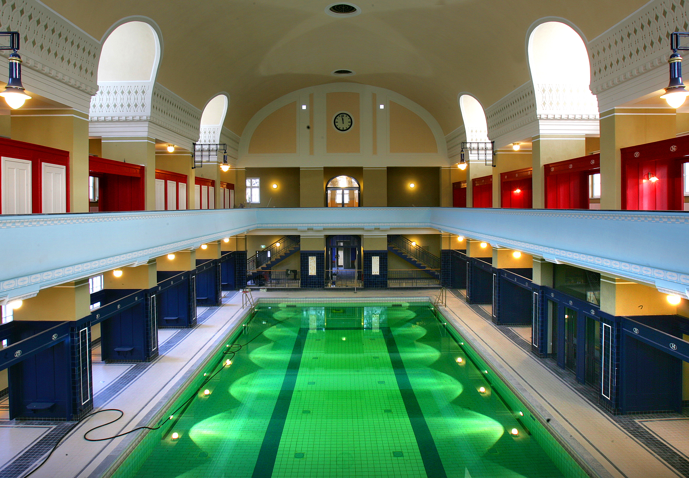 Durch die Sanierung haben im alten Gebäudeteil die Terrazzoböden, Mosaiken, Schmuckfriese und Ornamente ihren alten Glanz zurückerhalten - und sehen aus wie zu Zeiten des Architekten August Buxbaum. Die kräftigen Farben wie Ultramarinblau und Flammenorange, die für den heutigen Geschmack mutig wirken, waren typisch für die Zeit des Jugendstils. Im Trakt des heutigen "Beauty-Bereichs", in dem sich früher Wannenbäder befanden, wurden lang verschollene Dekor-Details entdeckt. Jeder Raum war individuell mit verschiedenen Farben und Dekoren gestaltet. Die unterschiedliche Farbgebung der Räume ist auch heute noch trotz einer etwas großzügigeren Raumaufteilung gut zu erkennen.