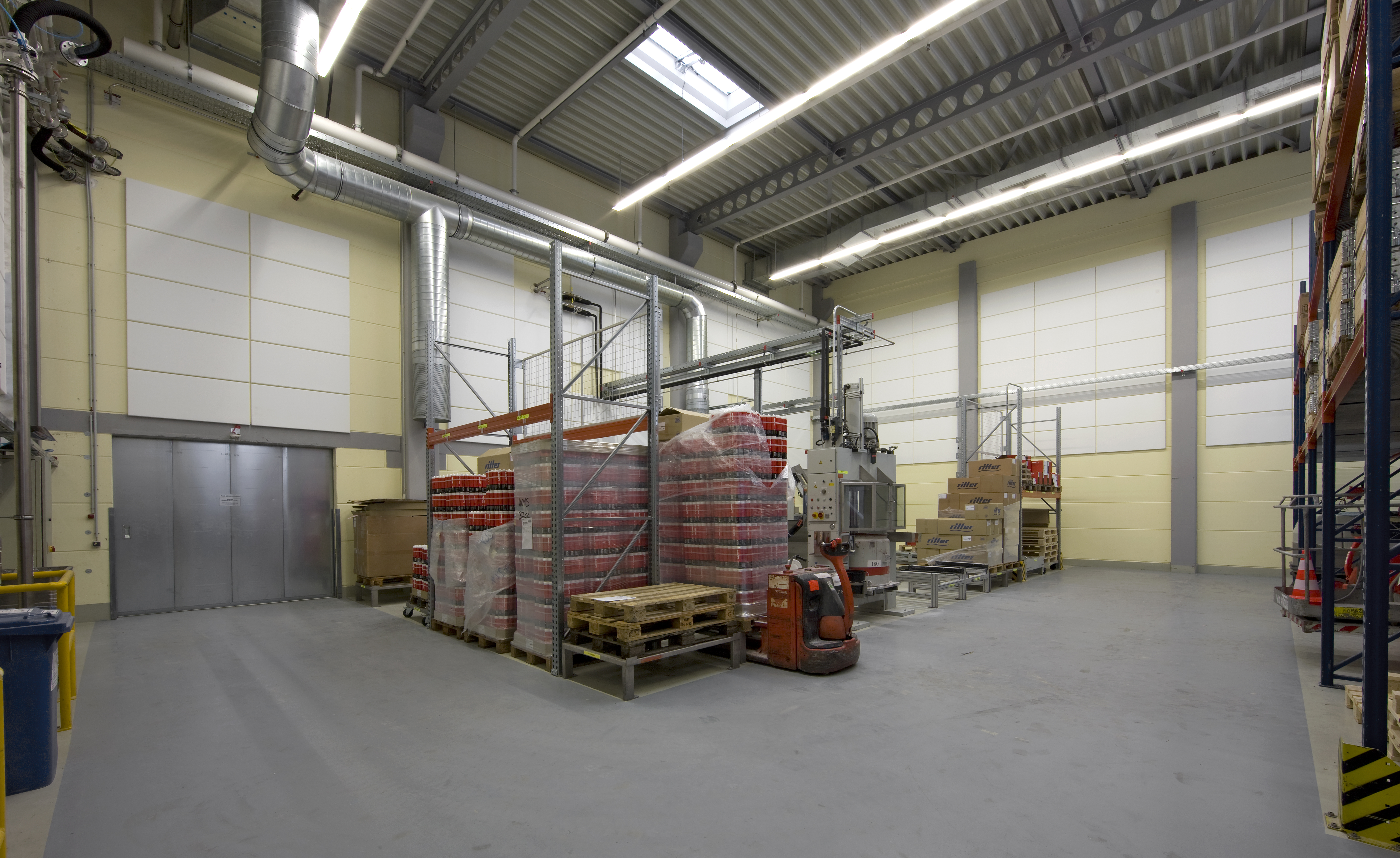 Die früher als Palettenregallager genutzte Halle hat eine Grundfläche von ca. 230 Quadratmeter, die Raumhöhe beträgt acht Meter, was eine extrem ungünstige Raumakustik zur Folge hatte. In dem Raum steht die Abfüllanlage, Zuleitungsrohre befinden sich an den Wänden, die aus relativ schallharten Materialien wie Porenbeton aufgebaut sind. Eine Wand ist mit Sandwich-Elementen verkleidet, Fensterflächen reflektieren den Schall. Die Decke besteht aus einer Trapezblechkonstruktion, Infrastrukturstraßen wie Lüftungen und groß dimensionierte Förderleitungen sind dort untergebracht.