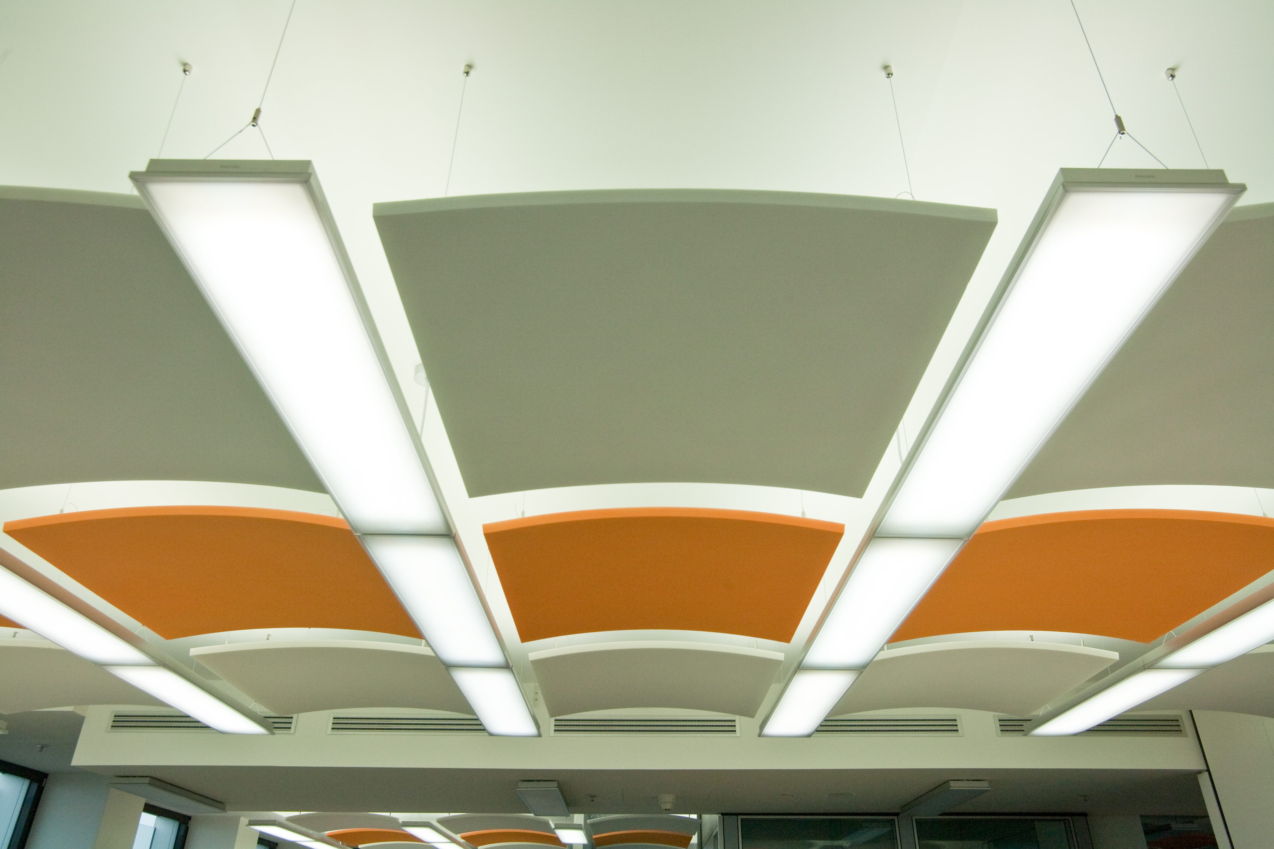 Das Philips-Facility-Management gab Anbietern unterschiedlicher auf dem Markt befindlicher Akustik-Systeme Gelegenheit, sich vor Ort zu informieren und geeignete Produkte vorzustellen. Einen Namen gemacht hat sich auch auf diesem Gebiet der Farben- und Dämmsystemhersteller Caparol, der sein Sortiment entsprechend dem Bedarf an umweltgerechter Systemtechnik ständig erweitert. Was Planer- und Objektberater Udo Cordes an Vorschlägen unterbreitete, trug den Gegebenheiten und Ansprüchen des Auftraggebers Rechnung. Nach Bemusterung und Erprobung fiel die Entscheidung zugunsten einer Lösung die sowohl den technischen Anforderungen wie hoher Schallabsorptionsgrad und Leistungserhalt der Betonkernkühlung, als auch den Vorstellungen an Geometrie und Optik gerecht wurde. Die Wahl fiel auf das CapaCoustic Melapor Deckensegel. Das gerundete Absorberelement besteht aus einem 30 Millimeter dicken Weichschaumstoff auf Melaminharzbasis, der zur Stabilisierug auf ein Aluminium-Lochblech aufgebracht ist. Durch die Lochung auf der Rückseite ist das Segel in der Lage, von oben einfallenden Schall im zweiten Zugriff zu absorbieren und damit einen sehr hohen Wirkungsgrad zu erzielen. Unter Berücksichtigung der Raumgeometrie wurden die gut einen Quadratmeter großen, nach oben gewölbten Platten im Tripel zwischen den Lichtbändern angeordnet. Produktmanager Alexander Barchfeld bestätigt die Ergebnisse der Messungen, aus denen hervorgeht, dass durch Aufhängung und Formgebung der Deckensegel der Kühleffekt der Decken gewährleistet wird.