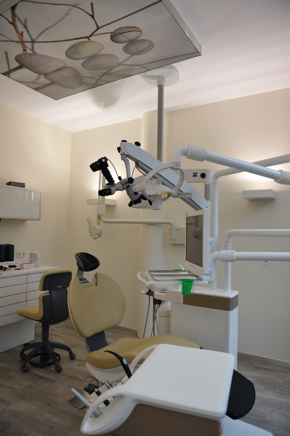 In den drei Behandlungsräumen sind Akustik-Elemente zur Schalldämmung mit verschiedenen Motiven montiert. Als Allgemeinlicht wurden LED-Einbauspots, in den Behandlungsräumen HQI-Wandleuchten sowie zwei attraktive Hängeleuchten über der Empfangstheke von der Fa. Foscarini angebracht, die sehr gut zu der Formensprache der abgerundeten Ecken passen. Die Ausstattung mit den Behandlungsstühlen und Schränken stammt von MPS Dental GmbH Köln.
