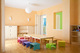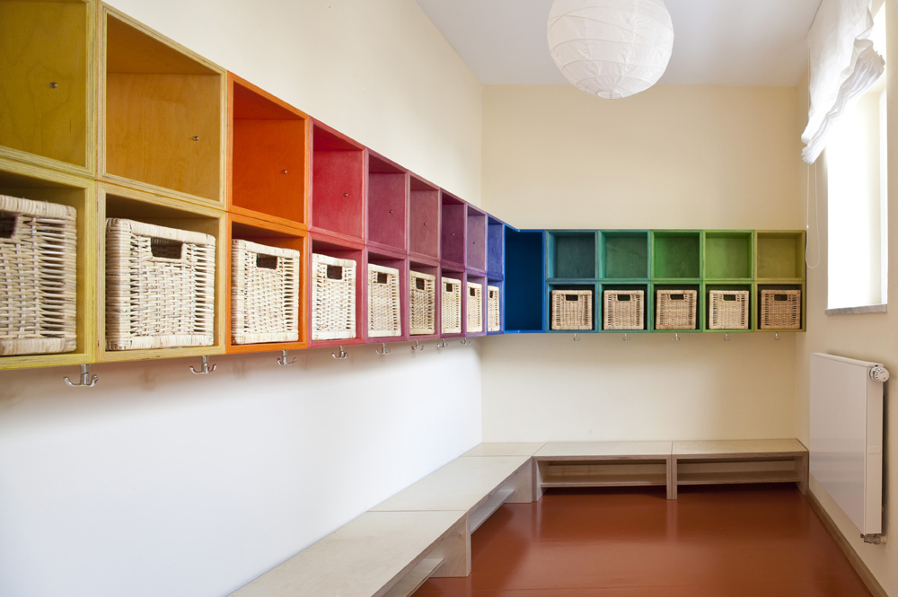 Empfangen werden die kleinen Gäste und ihre Eltern an der farbenfrohen Garderobe. Hier warten 15 Plätze, Holzkistchen in den Farben des Regenbogens, auf ihre kleinen Benutzer. Der Gruppenraum ist in einem Palazzoton gestrichen und anschließend mit einer Deco-Lasur in einem Apricoton lasiert, was ein zartes Farbspiel erzeugt. "Das läßt die Augen spazieren gehen und schafft Lebendigkeit", schwärmt Hörr. 15 kleine Hocker ohne Arm- und Rückenlehne (das ermöglicht eine aktive Sitzposition) nehmen das Thema "Regenbogen" auf. Sie sind jeweils in einer anderen Farbe lasiert. Ein mit Teppich ausgelegtes Podest als zweite Ebene im Raum lädt die Kleinen zum Klettern und Krabbeln ein, kann aber auch als Höhle zum Zurückziehen genutzt werden.