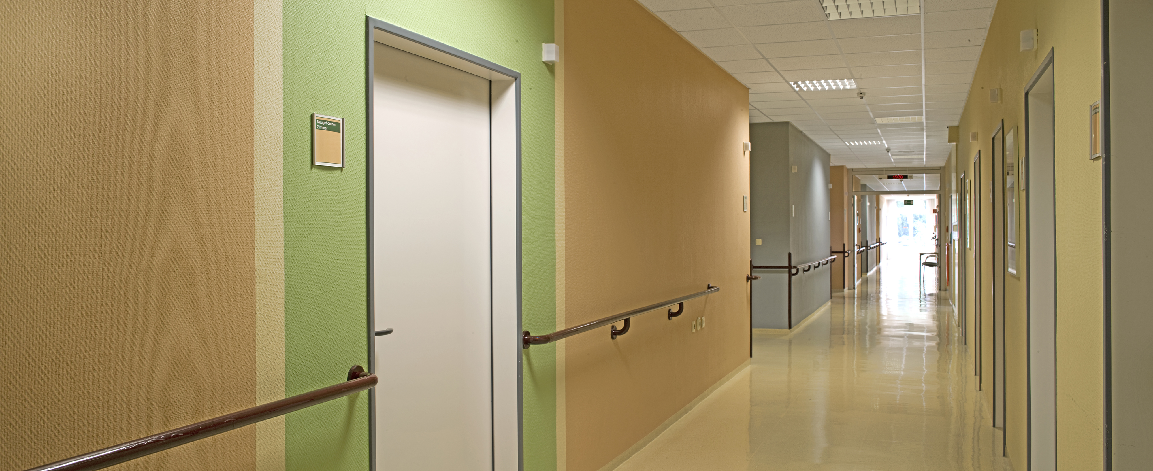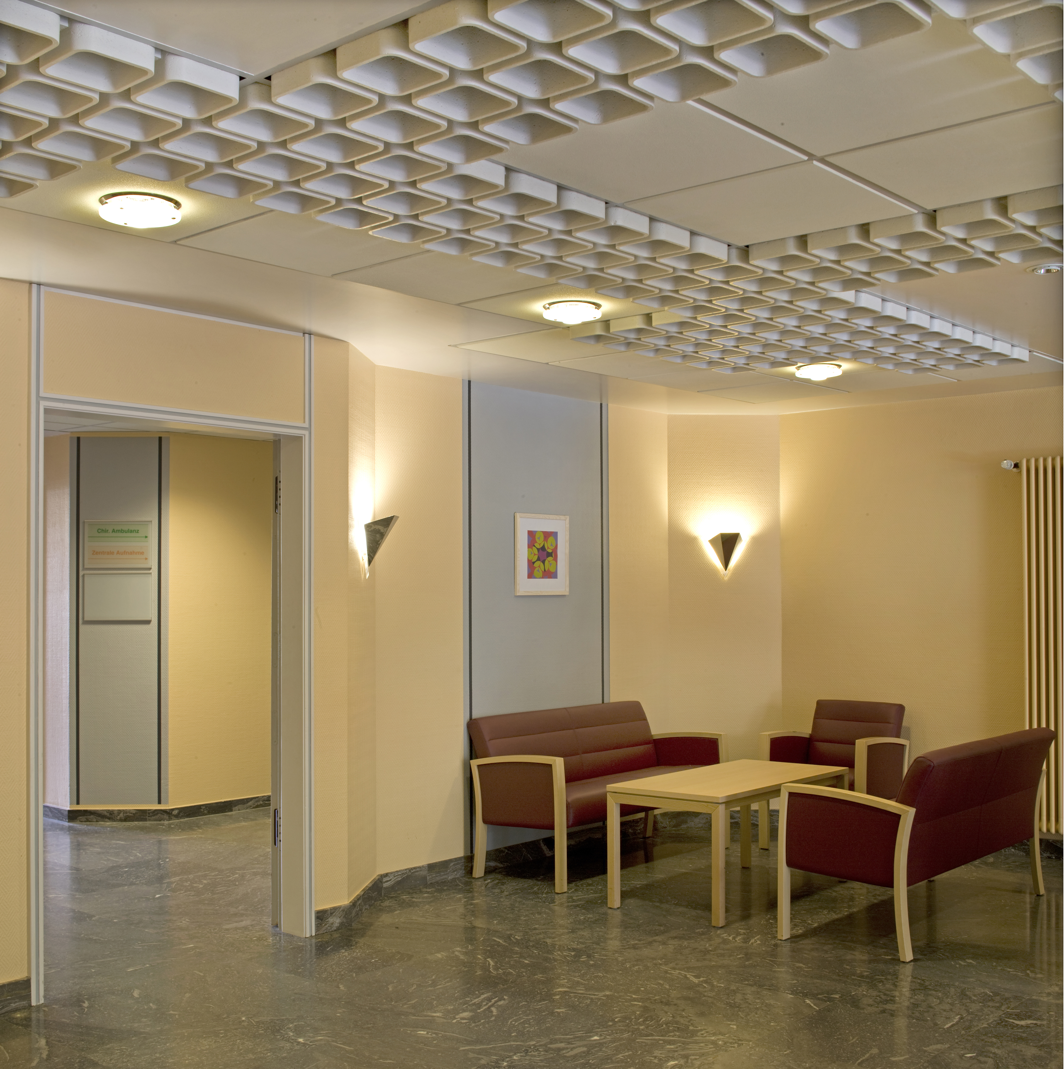 Die Flure im Medizinischen Versorgungszentrum (MVZ) zeichnen sich heute durch eine warmtonige und freundliche Atmosphäre aus. Besonders interessant sind die Oberflächentechniken, die hier im Wandbereich zum Einsatz gekommen sind. Durch die Kombination der matten Capadecor-Putzbeschichtung für die Hauptwandflächen mit Akzenten in einer kupferfarbigen glänzenden Metallocryloberfläche entsteht ein spannender Farb- und Materialkontrast. Beide Beschichtungsmaterialien vereinen mehrere Vorteile: ein wohnlicher, hochwertiger Eindruck wird mit äußerster Strapazierfähigkeit kombiniert. Der Capadecor Putz kann im Roll- oder Spritzverfahren aufgebracht werden. Auch das Metallocryl kann in unterschiedlichen Auftragsmöglichkeiten auf die Wand gebracht werden - wichtig ist allerdings ein strukturierter Untergrund. Die senkrecht abgezogene Bürstenstruktur unterstreicht die vertikale Ausrichtung der Akzentflächen und bildet zudem einen angenehmen Ausgleich zur feinen Sprenkeloptik des Putzes. Die Wandfarbigkeit passt sowohl zum hellen Holz der Einrichtung als auch zum Bodenbelag - eine harmonische ToninTon-Farbatmosphäre prägt den Raum. Einen Akzent hierzu bildet die rubinrote Tür. Bilder mit abstrakten Motiven wurden passend zur neuen Farbigkeit ausgewählt. Der Eingangsbereich des Hauptgebäudes und der Aufenthaltsbereich in der Chirurgischen Ambulanz wirken im Gegensatz zu vorher hell und freundlich. Die positive Wirkung der neuen Farbkonzeption und Einrichtung wird zusätzlich unterstützt durch Wandleuchten, die ein behagliches, wohnliches Licht ausstrahlen. Ein besonderes Augenmerk legte die Farbdesignerin auch auf die Gestaltung der Neugeborenenstation. Alle Einzelheiten hinsichtlich der Farbauswahl, Stellung der Betten etc. wurden mit den Schwestern ausführlich besprochen. Eine Atmosphäre der Geborgenheit ist entstanden, in der die Babys einladend begrüßt werden.