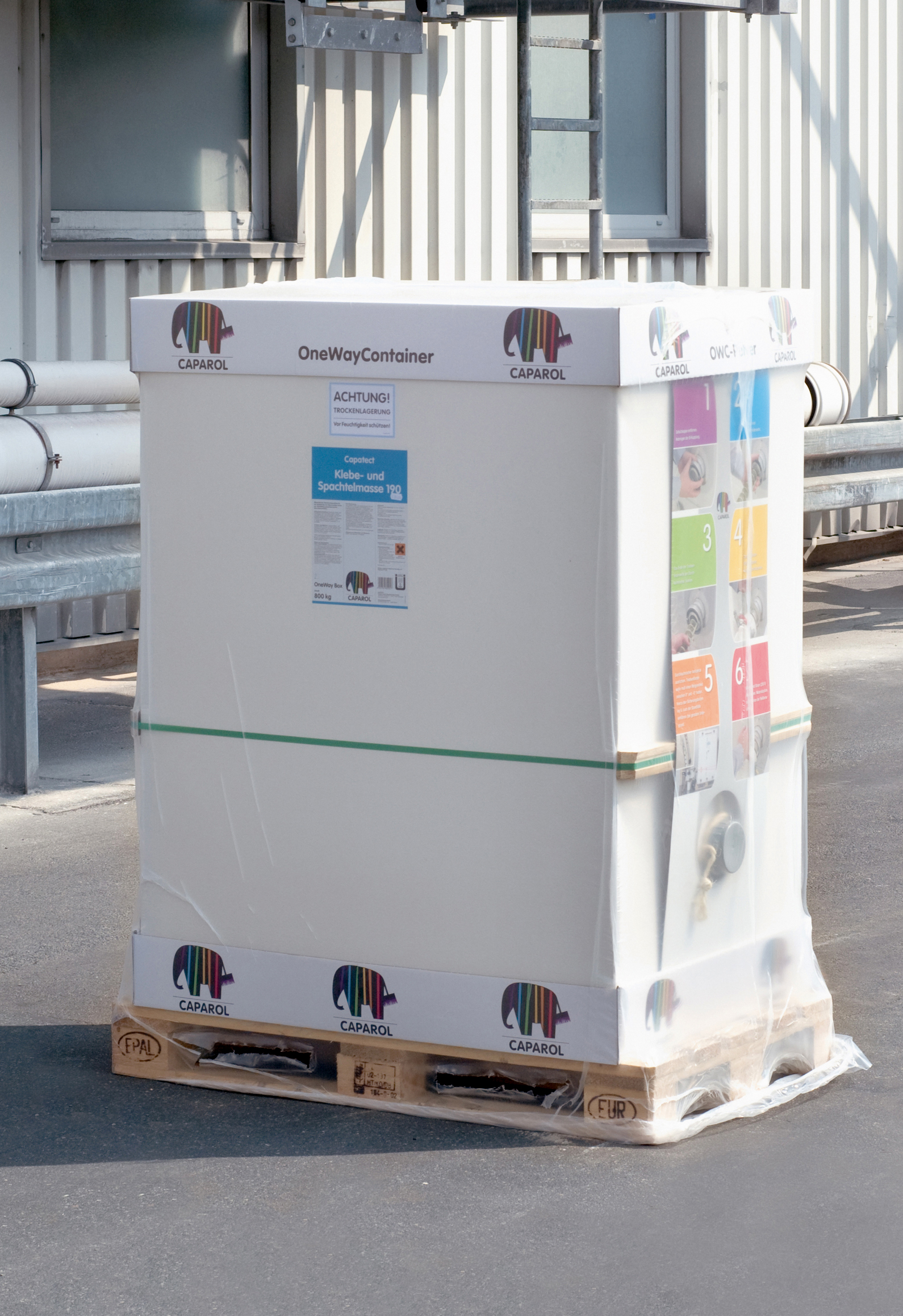 Sollte die optimierte Füllmenge von 800 kg pro OneWayContainer bauseits einmal nicht reichen, lässt sich der Container bei Bedarf einfach mit Sackware nachbefüllen. Nach vollständigem Ausgebrauch ist keine aufwendige Rückholung notwendig: Da OneWayContainer aus recyclebarer Pappe bestehen, werden sie an Ort und Stelle zusammengefaltet und danach einfach wie Altpapier entsorgt. Damit sind sie genauso schnell wieder verschwunden, wie sie geliefert werden: Weil Caparol OneWayContainer auf jede Europalette passen, lassen sie sich außerdem besonders rationell und kostengünstig transportieren. Für das kompakte Normformat fallen nicht einmal Stellgebühren an, denn der Vorgarten kann als baunahe Abstellfläche dienen. Gehwege und Straßen bleiben völlig frei. Das sind handfeste Vorteile, die für Profis in der Praxis zählen.