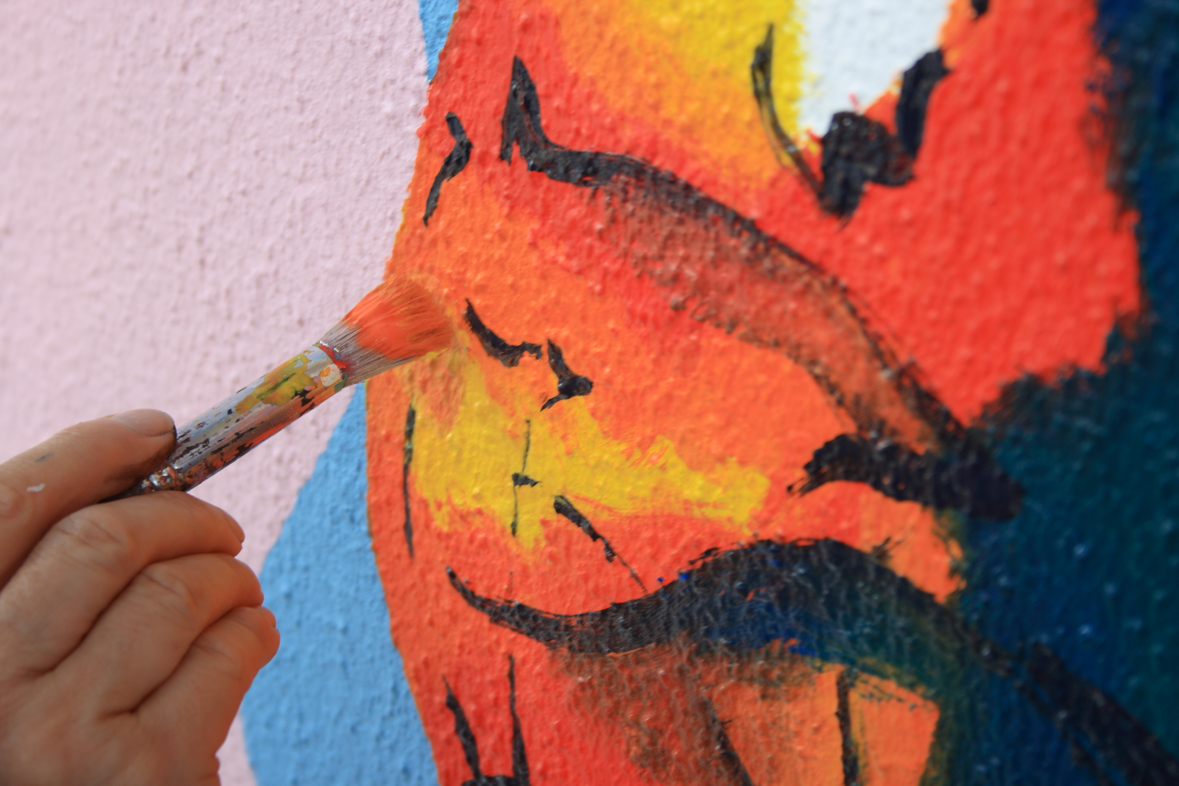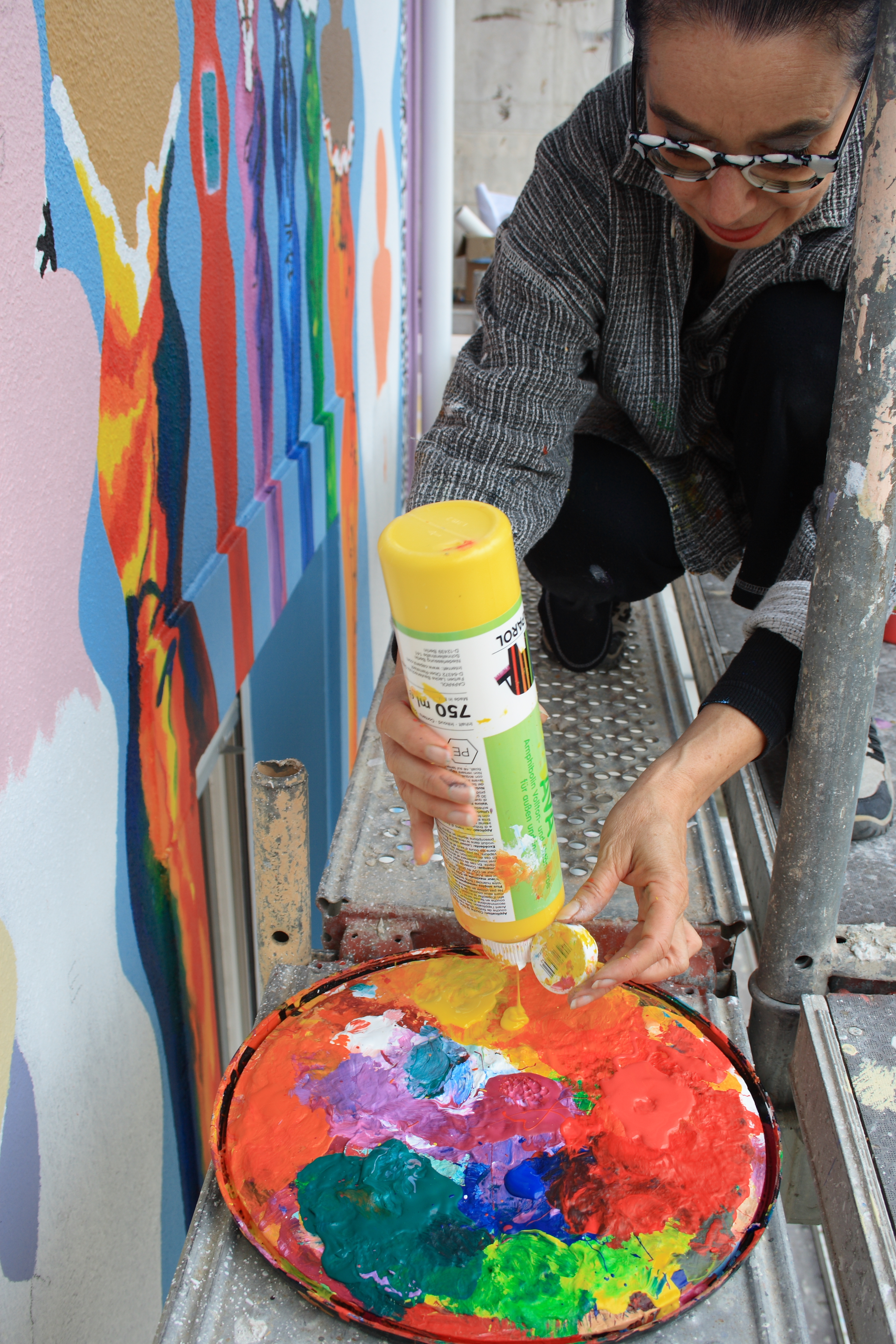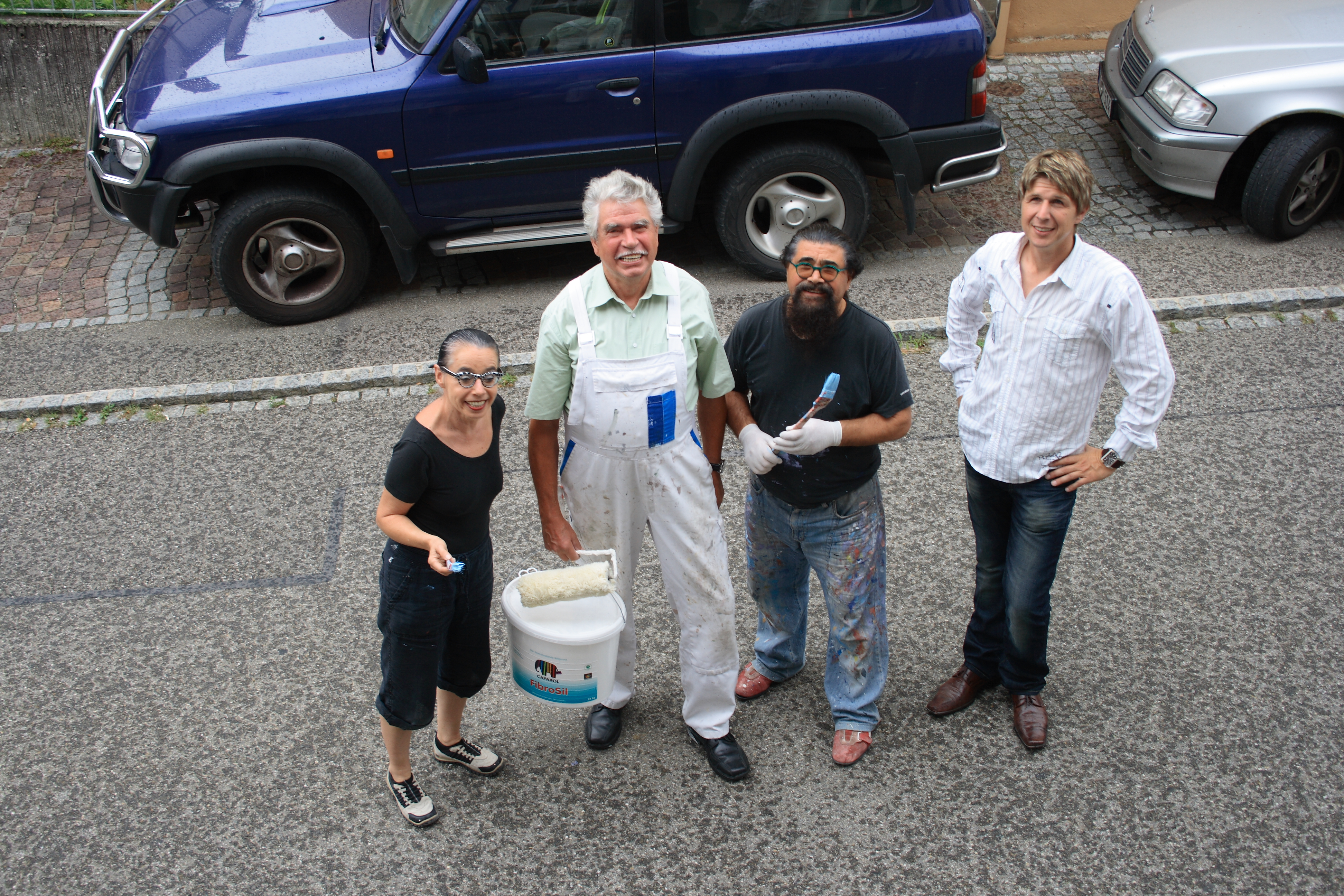 Die notwendige Vorbereitung des Untergrunds konnte durch eine sachkundige Beratung garantiert werden. Schnell war klar, dass die verwendeten Farben höchste Qualität und Leuchtkraft bieten müssen. Daher entschieden sich die Verantwortlichen für Amphibolin. Für die Künstler war wichtig, dass sie mit den Farben auf der Fassade genauso arbeiten konnten, wie sie es auf einer Leinwand oder an einer Skulptur gewohnt sind. Zarte, fließende Übergänge, pastellige Töne und Nass-in-Nass-Arbeiten mussten genauso realisierbar sein wie kräftige, intensiv leuchtende Farbtöne. Amphibolin bietet mit fast unendlich vielen Farbtönen ein so großes Spektrum, dass die Wünsche der Künstler optimal umgesetzt werden konnten. Hierbei half die Firma Farbtex Kaltenbach & Maier, die die Farben kostenlos exakt nach Vorgabe über eine Color-Express- Anlage vor Ort abtönte und so den Künstlern optimales Arbeitsmaterial zur Verfügung stellte.