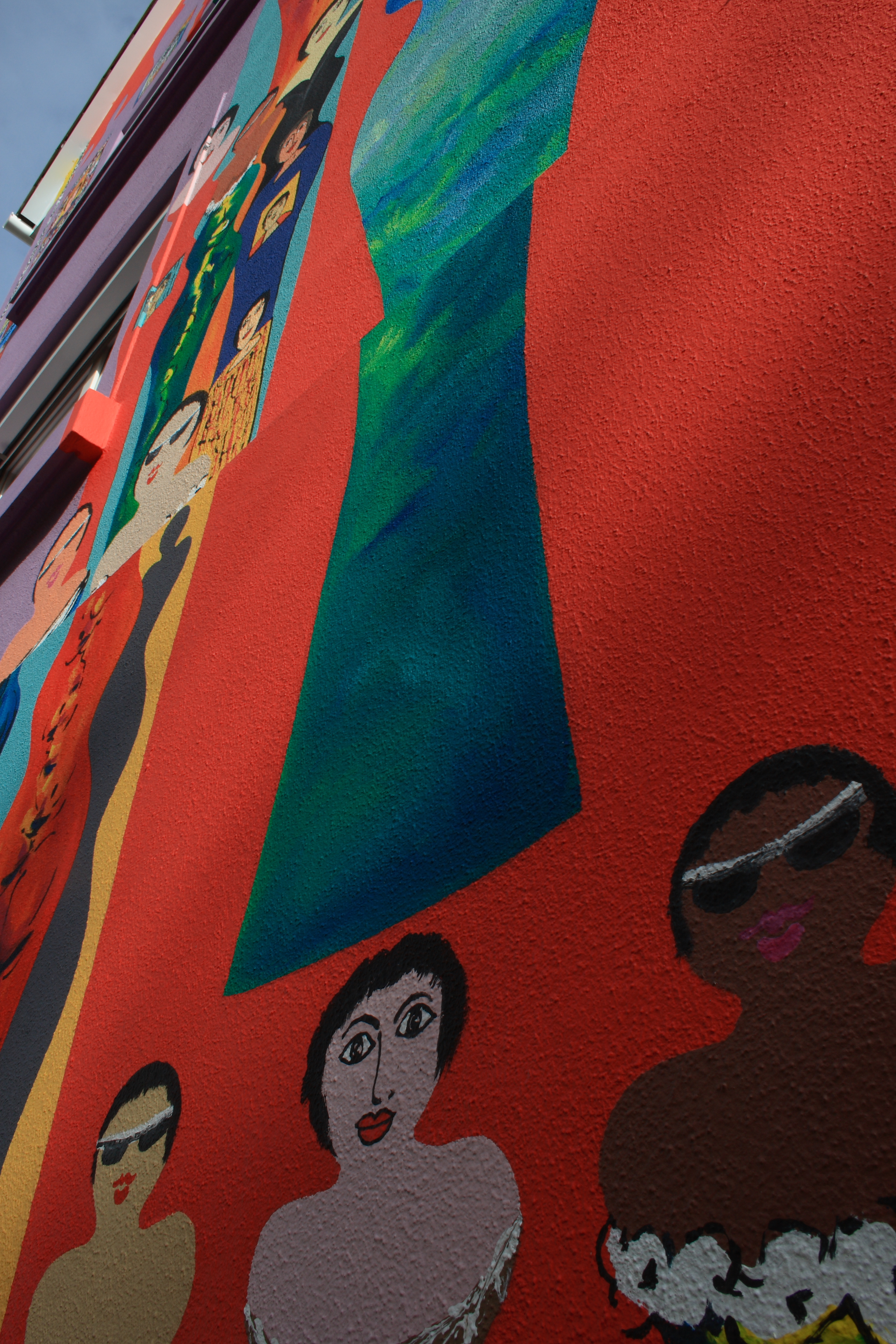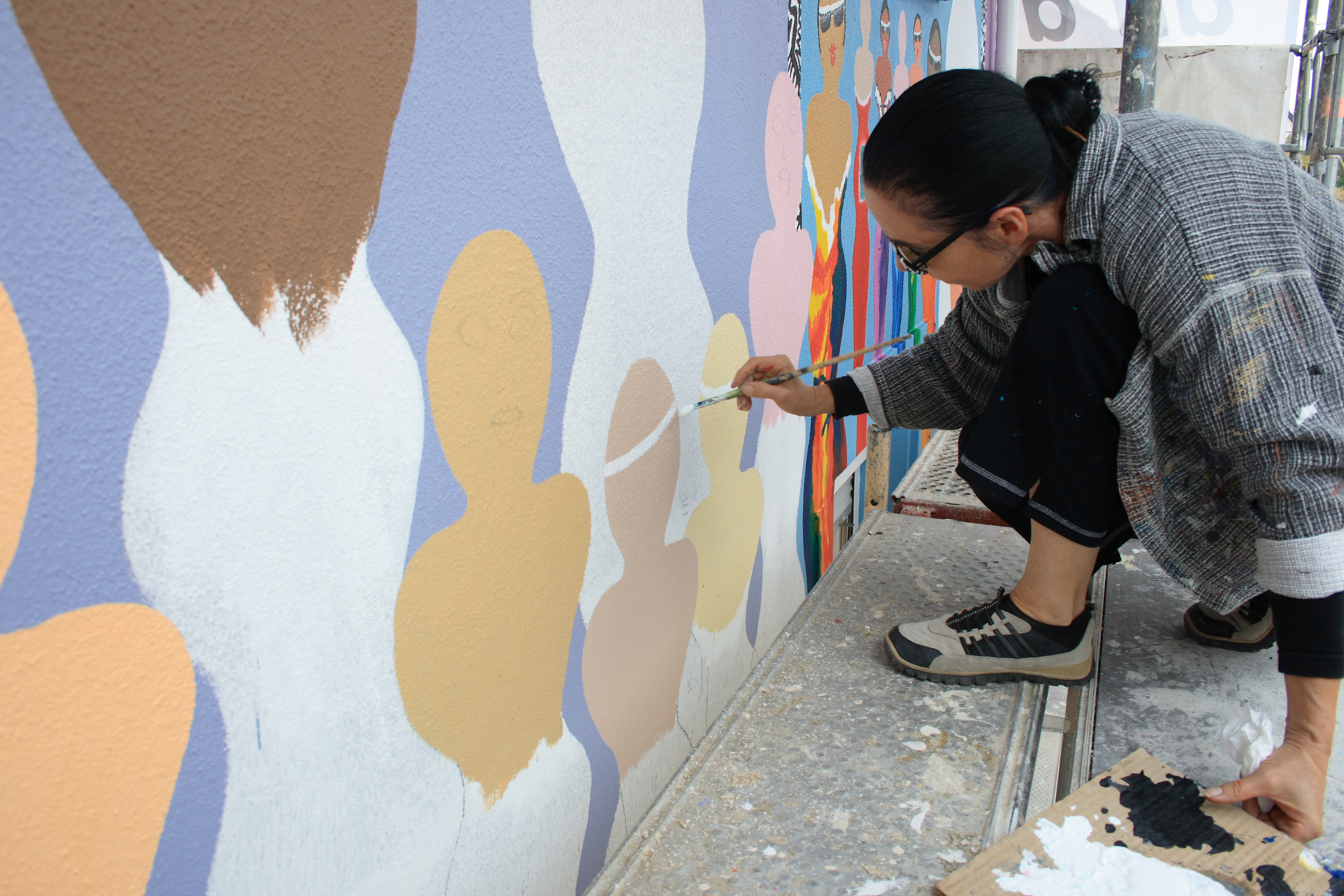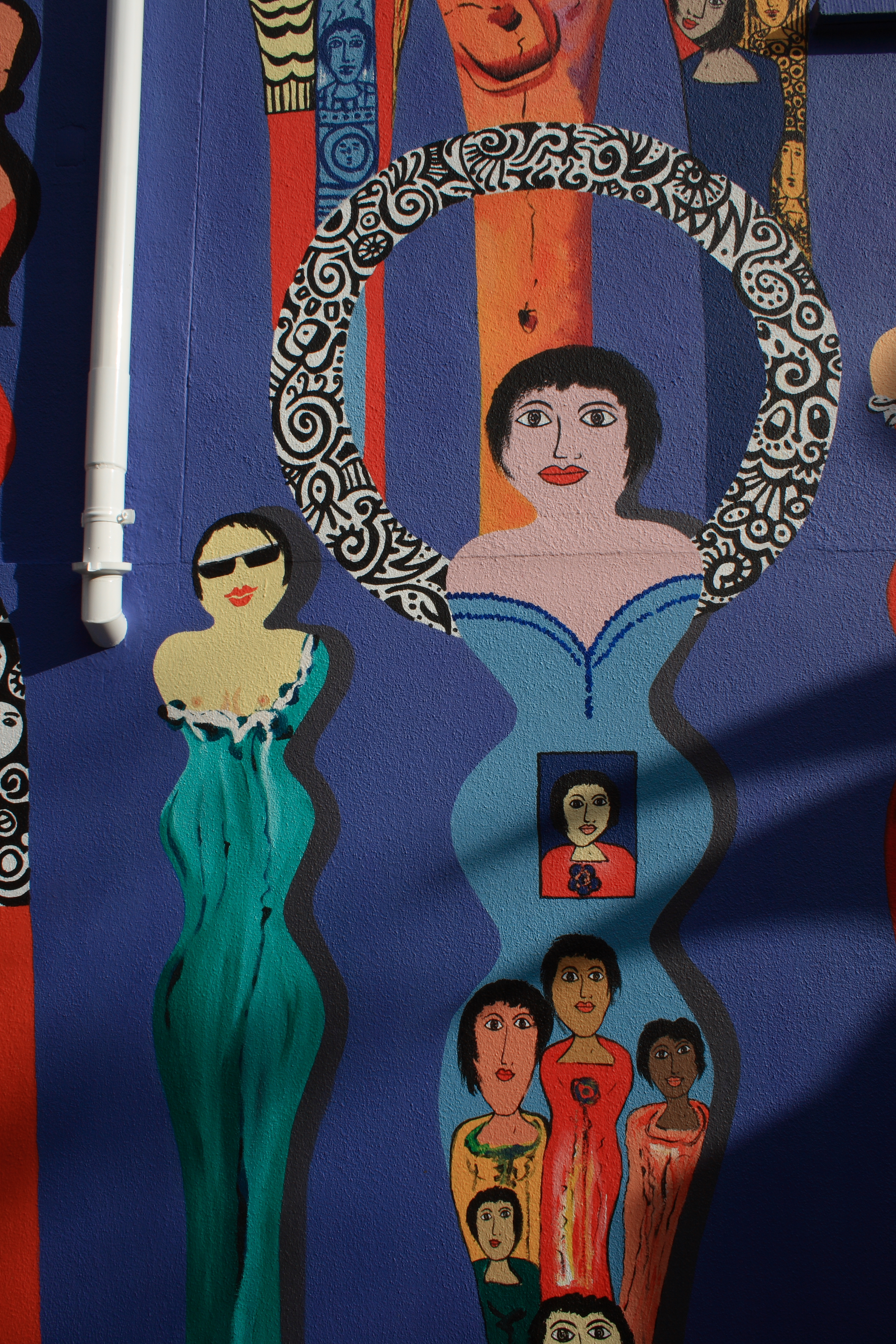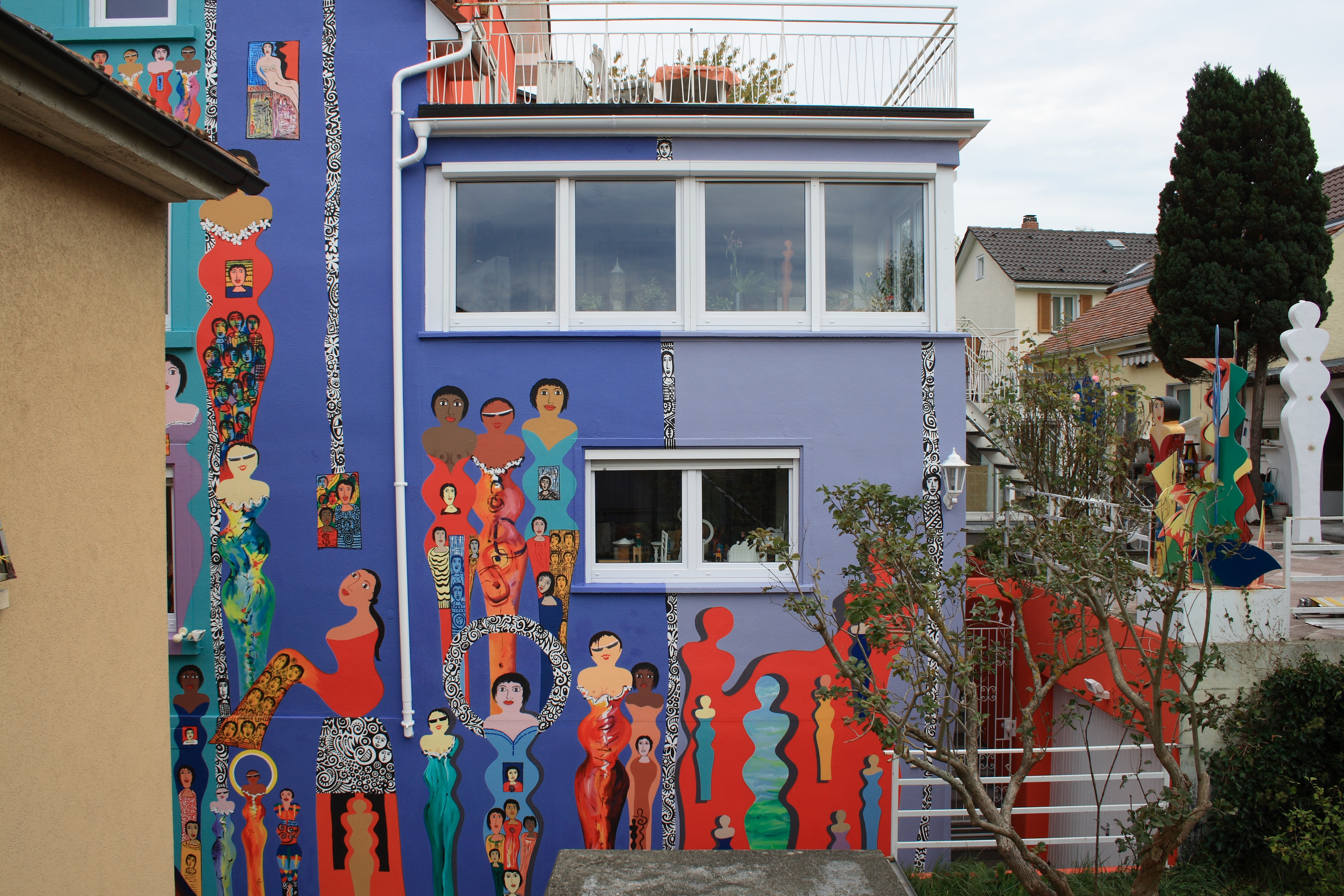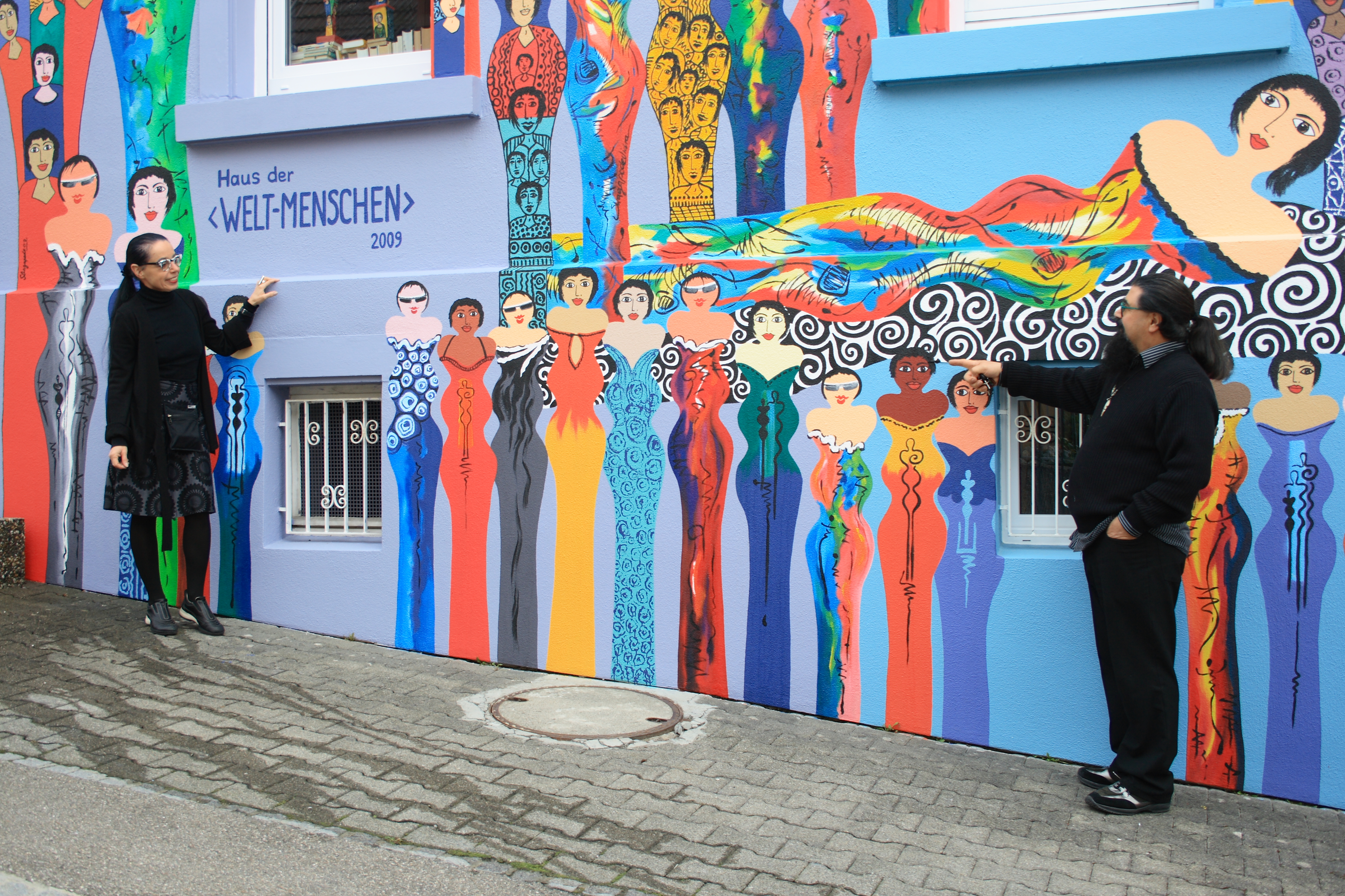 Als Skulpturen, in Gemälden und jetzt auch auf der Fassade ihres Hauses spiegelt sich das Thema wider. Florale Elemente in Schwarzweiß erinnern an Textilmuster, die Welt-Menschen leuchten in allen Farben, erzählen die Geschichten ihres Lebens. Ein Erkennungsmerkmal: die schlichte, immer wiederkehrende Form der Figuren, schwungvoll und dynamisch.