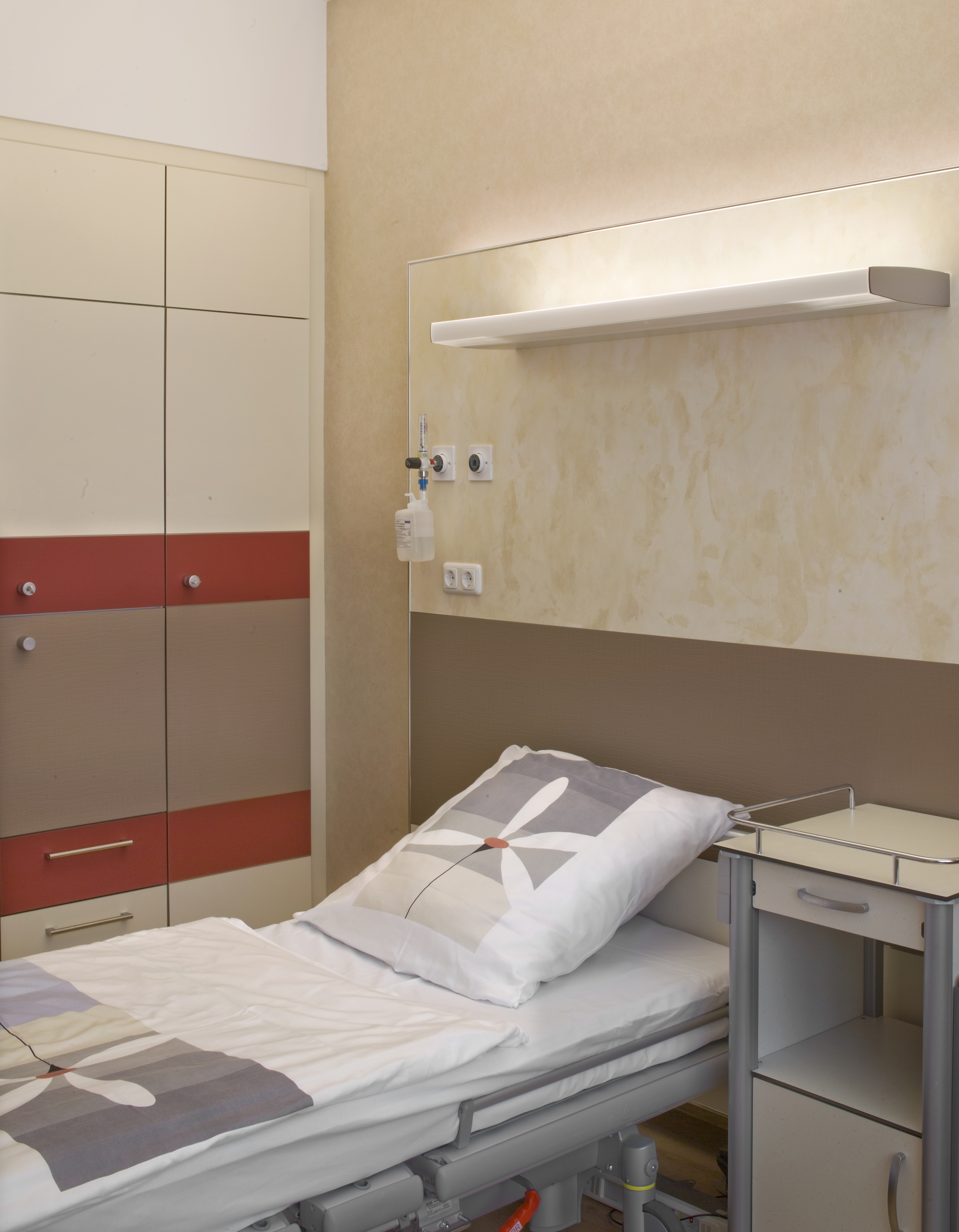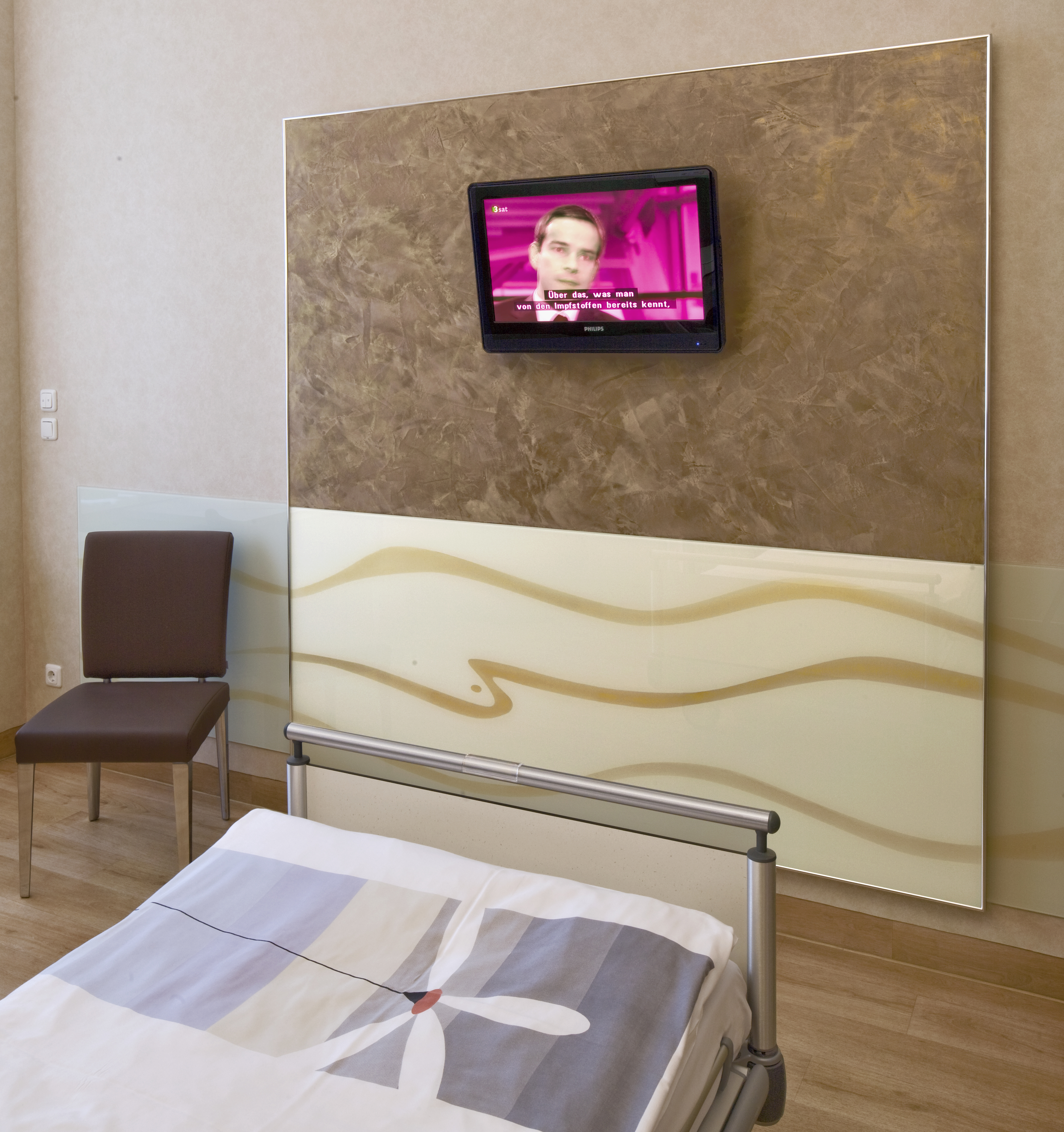 Mit der von Angela Kreps entworfenen und hochwertig gestalteten Einrichtung und Möblierung vermitteln die Zimmer eine niveauvolle Wohlfühlatmosphäre. Die Farbgestaltung spielte dabei eine wesentliche Rolle. "Edel glänzende Flächen mit Gold- und Silbertönen unterstreichen die Farbharmonie der Zimmer, ein Dreiklang aus Beige, Braun und einem roten Akzentfarbton", erläutert die Innenarchitektin. Ihre Entwürfe wurden mit der Klinikleitung und dem Malermeister Karl-Heinz Friedrich abgestimmt. Er kümmerte sich auch um die Produktwahl und führte die dekorativen Techniken schließlich selbst aus. Weil der Betriebsmaler auf Caparol-Produkte setzt und die damit angebotenen vielfältigen Möglichkeiten an dekorativen Innenwandtechniken schätzt, wandte er sich an den Caparol-Außendienstmitarbeiter Erich Krebs. Gemeinsam fertigten die beiden Fachleute Musterplatten und präsentierten ihre Gestaltungsvorschläge der Kaufmännischen Direktorin Sigrid Lommel, die ihre Vorstellungen darin verwirklicht fand.