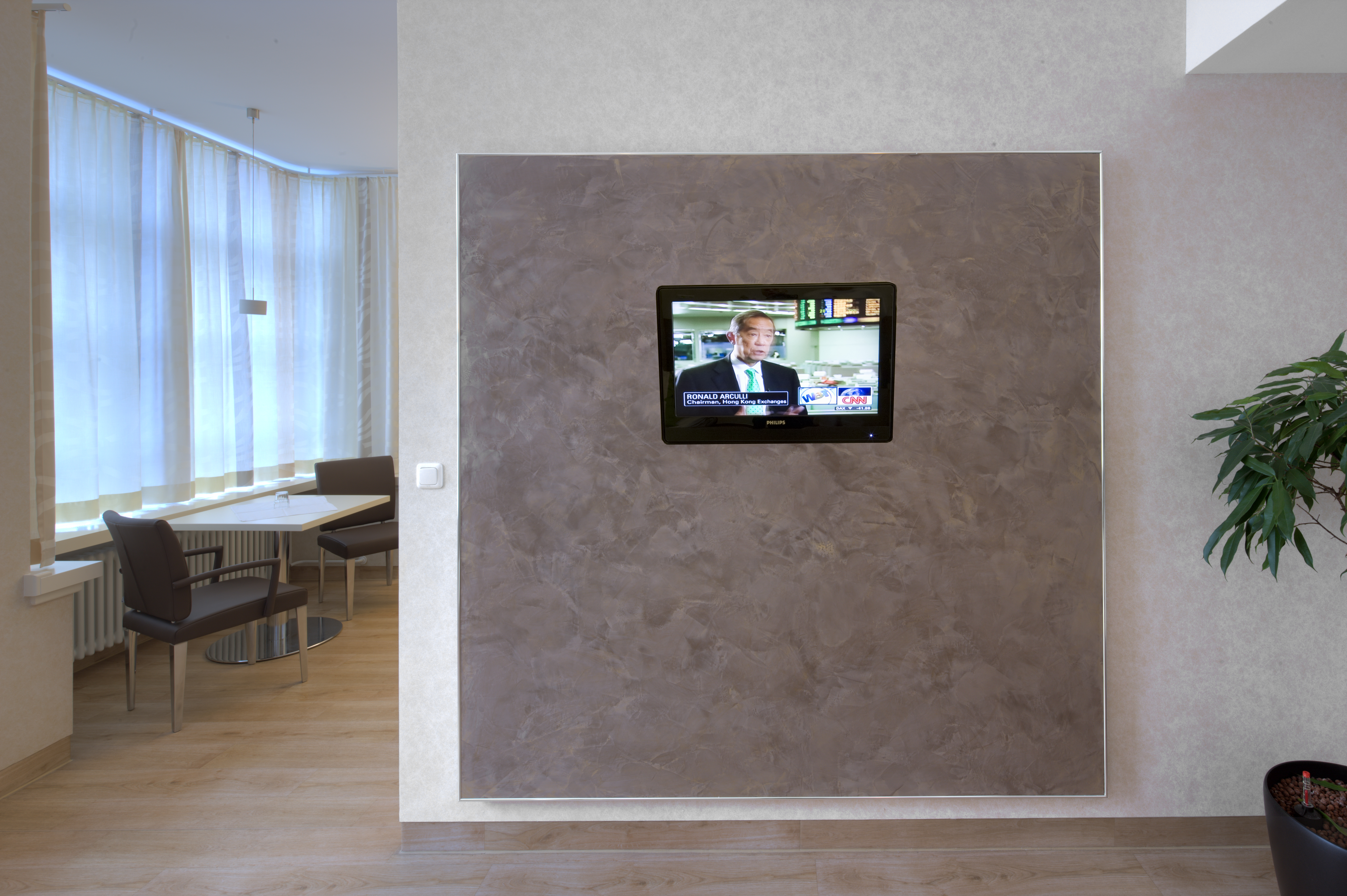 Und weil die Kaufmännische Direktorin Sigrid Lommel von der Spachteltechnik so begeistert war, bei der zwei Materialien auf einer Spezialkelle verarbeitet werden, bat sie Karl-Heinz Friedrich, eine große Wand in ihrem Büro ebenfalls mit Arte Twin zu gestalten. Sie hat nun auch an ihrem Arbeitsplatz ein ansprechendes Ambiente, an dem sie sich täglich erfreuen kann.