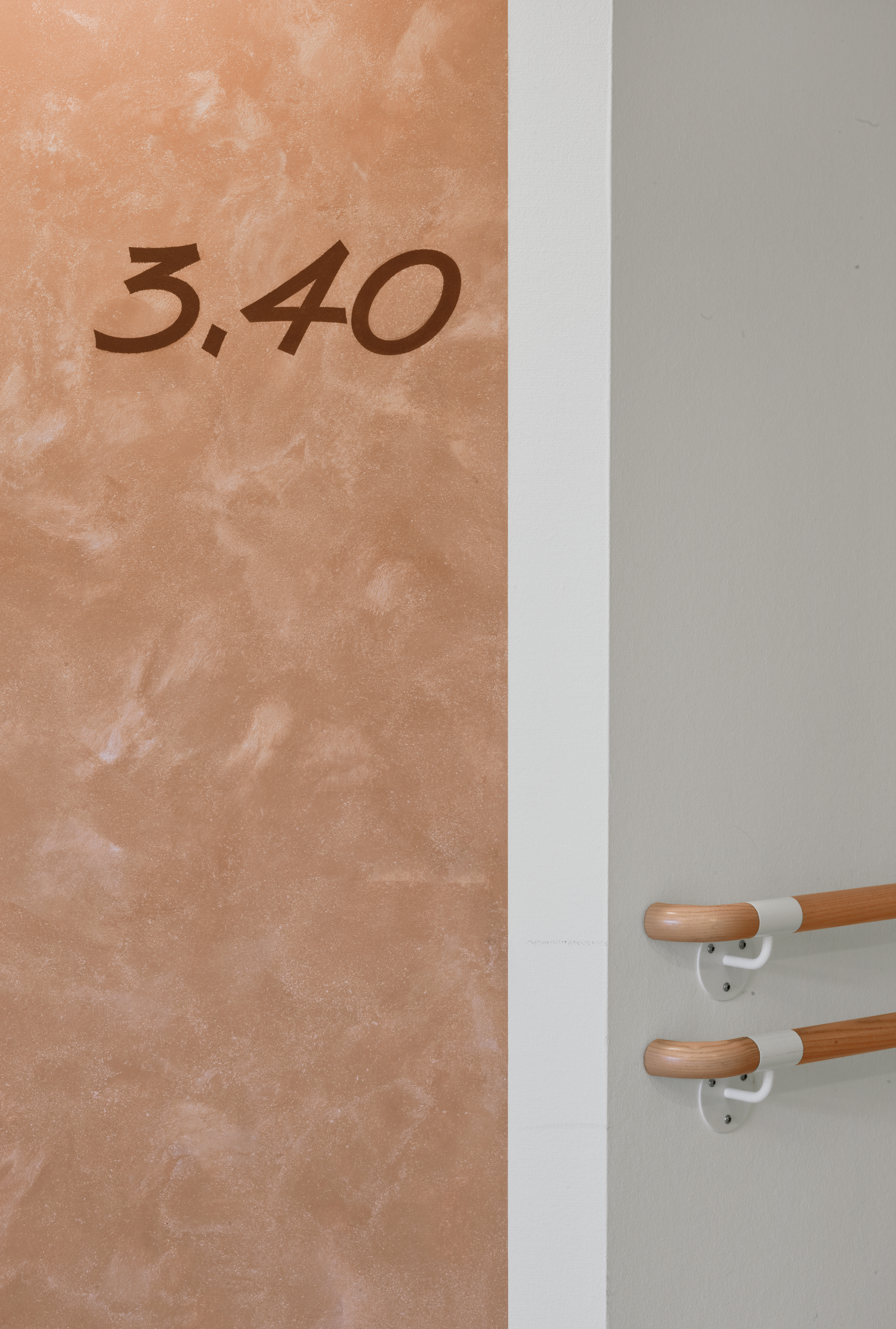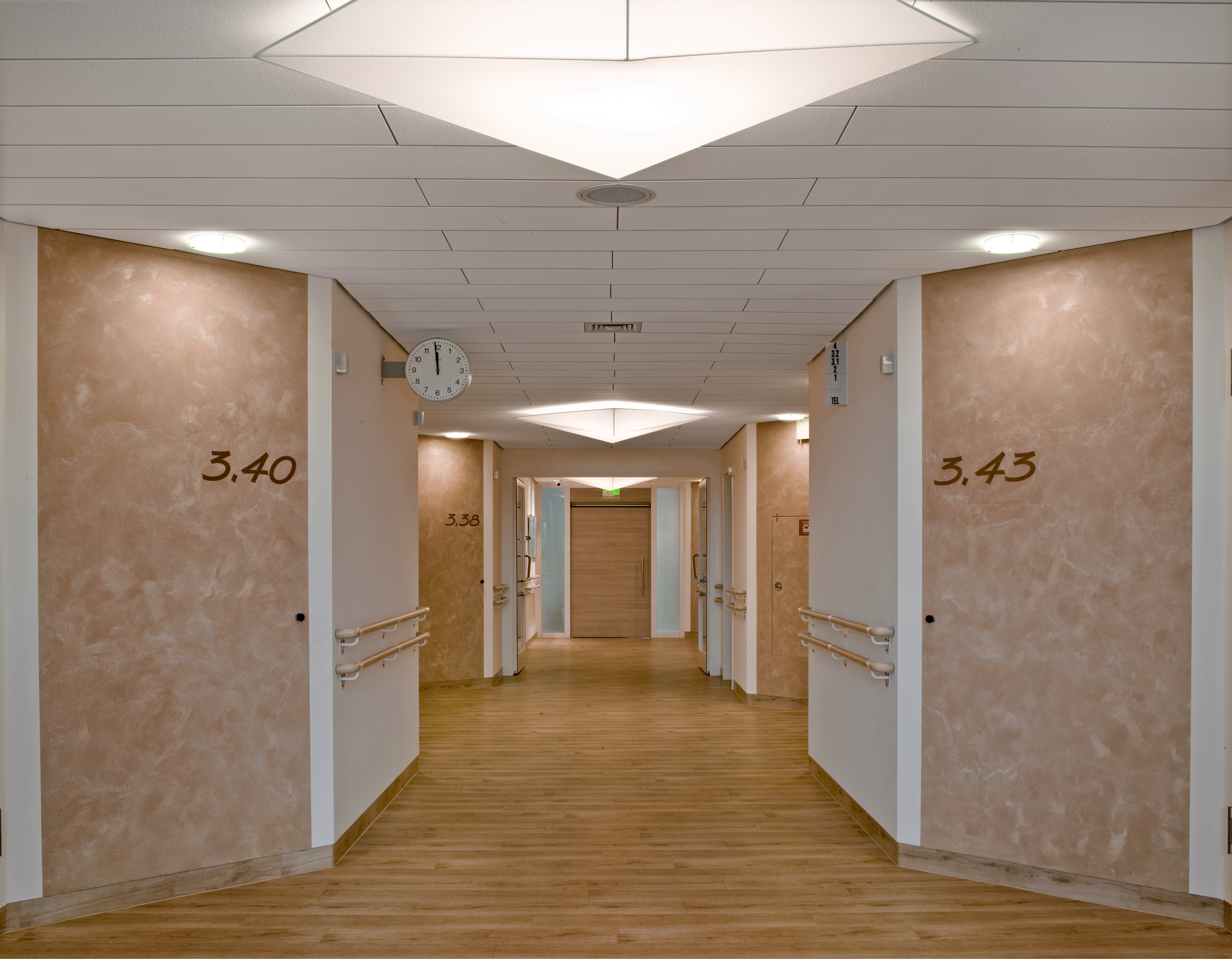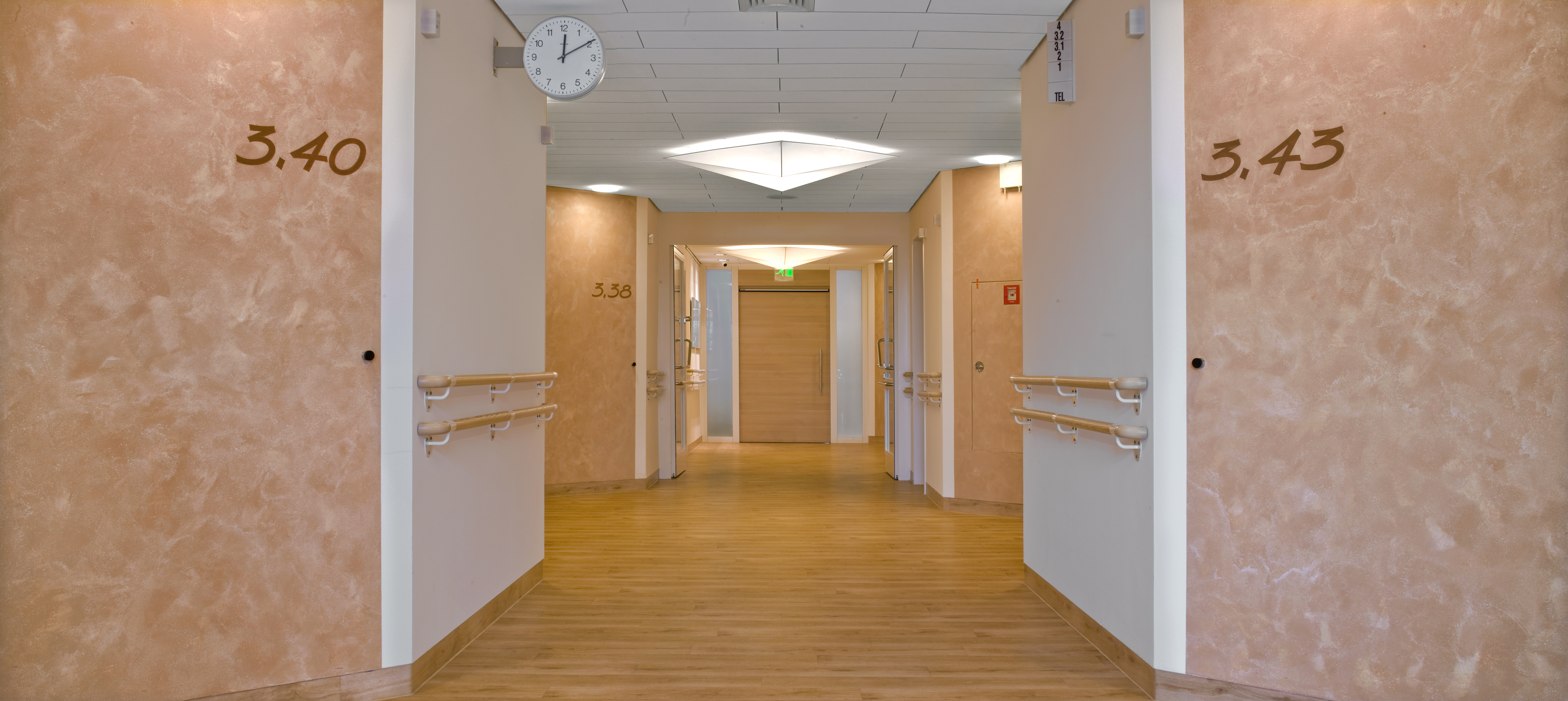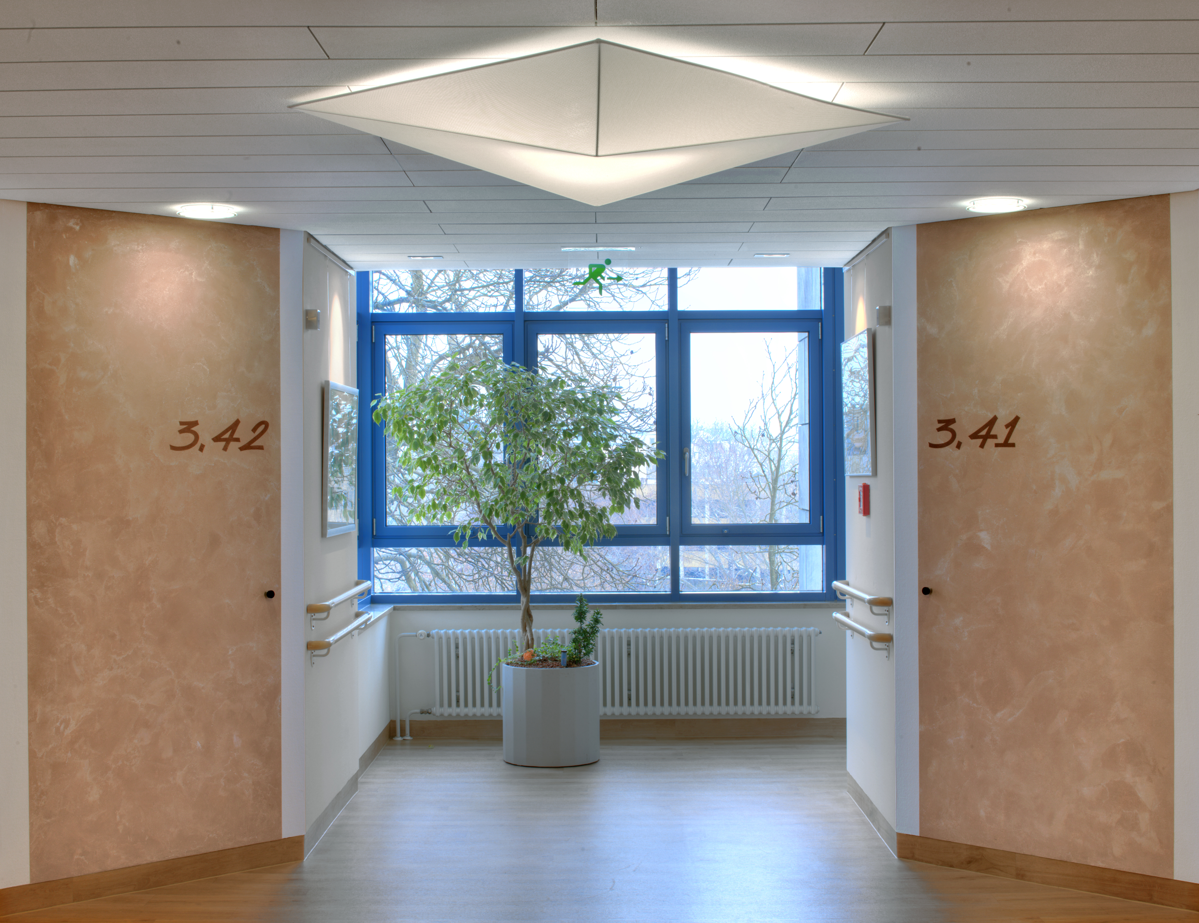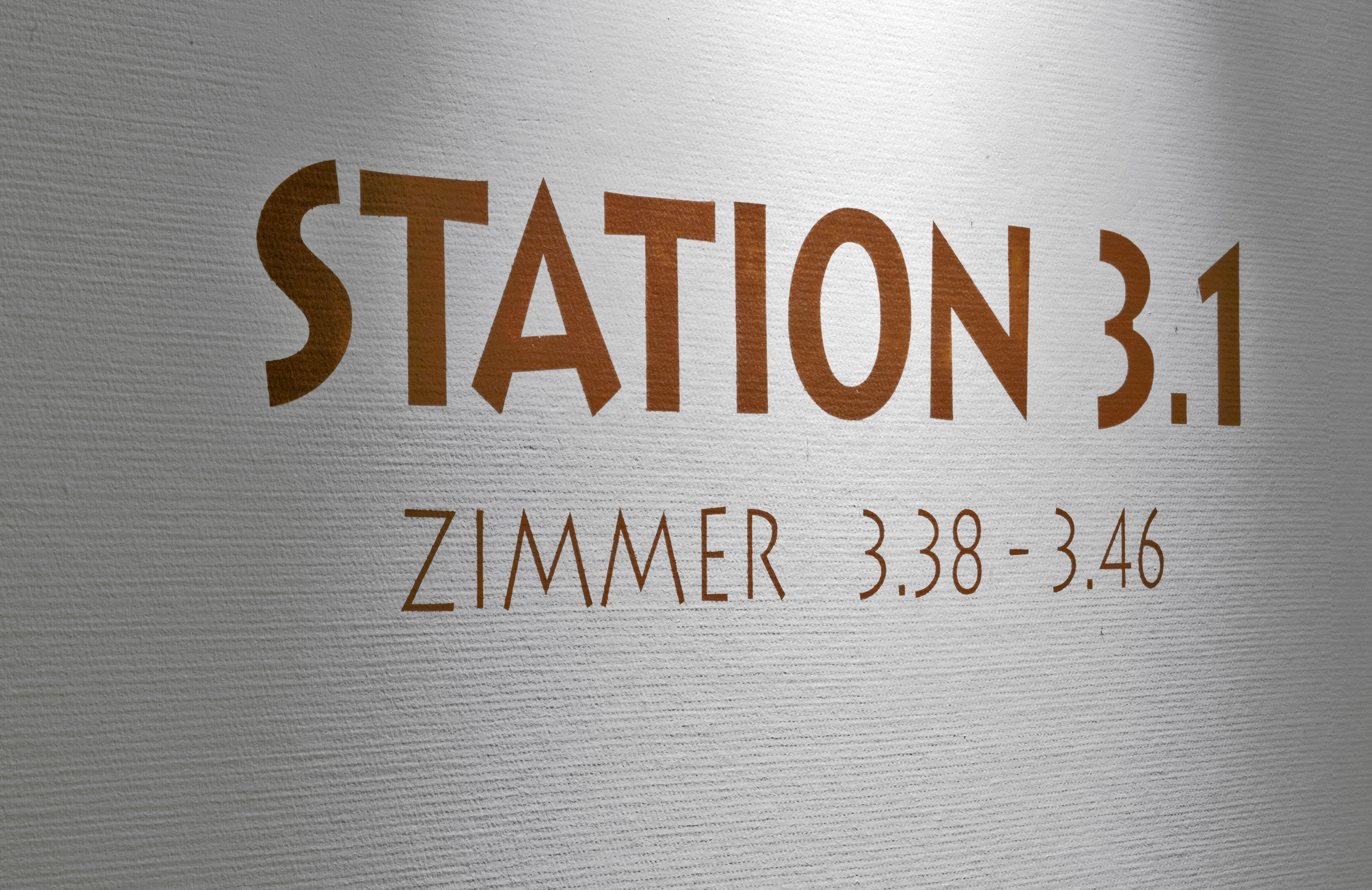 Die Beschriftung von Station und Zimmern mit sehr großen Buchstaben und Ziffern an den Flurwänden erleichtert Patienten und Besuchern die Orientierung und wirkt gleichzeitig als Gestaltungselement. Die Schrift steht auf den abgeschrägten Eckwänden, die als Akzentwände mit Arte Twin gespachtelt wurden. Die überwiegenden Wände erhielten eine strapazierfähige Beschichtung mit Latex Samt 10. In Nischenbereichen im Flur kam die quarzgefüllte Strukturfarbe MultiStructurStyle zum Einsatz, die mit Deco-Lasur veredelt wurde. Zusätzlich wurde ein Aufenthaltsraum mit Küche gestaltet, die Wände dort wurden auch mit ArteTwin gespachtelt.
