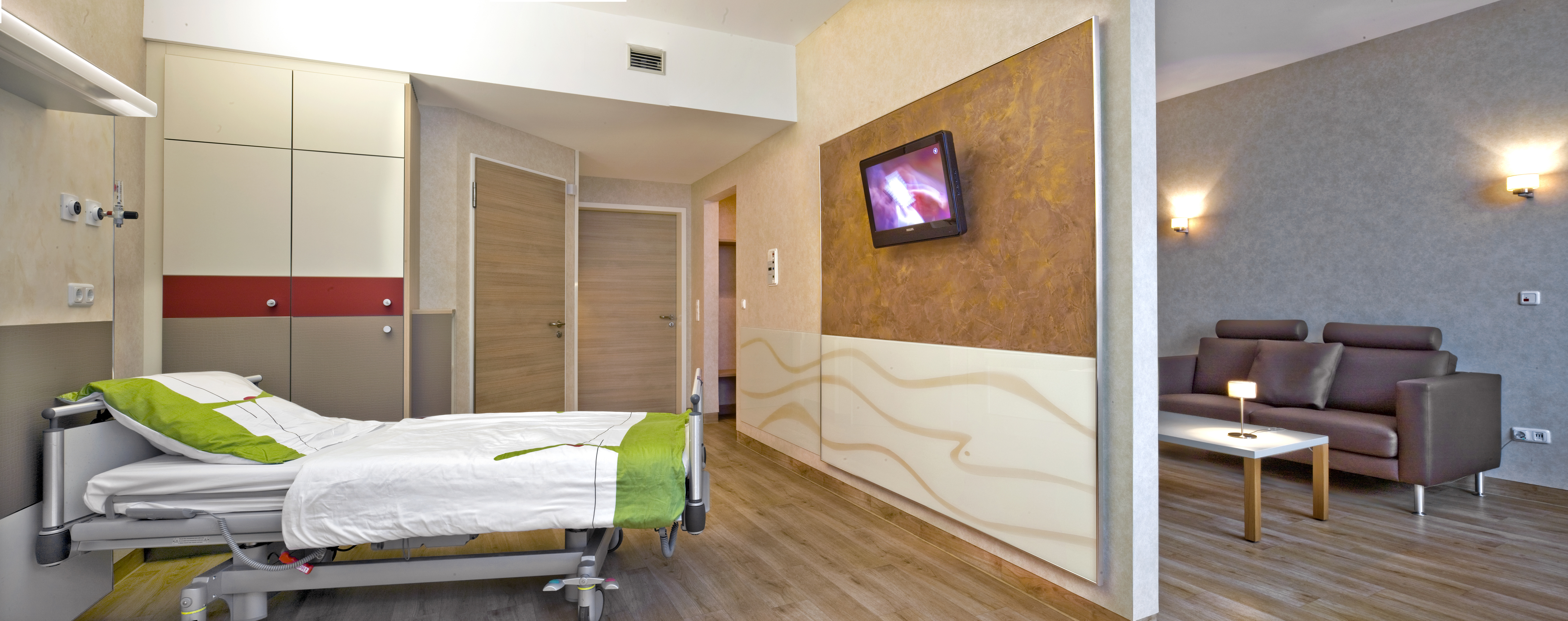 Nachdem die Wände in den Zimmern alle mit Akkordspachtel auf ein einheitliches Niveau gebracht worden waren, wurden sie mit FantasticFleece tapeziert. Dabei kamen verschiedene Dessins des stabilen Glasvlieses zum Einsatz, die Karl-Heinz Friedrich mit einer selbst gemischten Deko-Lasur matt lasierte. Wandplatten am Kopfende des Krankenbettes, hinter denen die Medizintechnik versteckt ist und an der gegenüberliegenden Wand - dort sind Flachbildfernseher integriert - sind als Akzentwände gestaltet und mit dekorativen Innenwandtechniken in Szene gesetzt. Die MDF-Platten an den Kopfenden der Betten spachtelte Karl-Heinz Friedrich mit ArteTwin Basic mit Gold und Silber Effekten, indem er beide Werkstoffe mit einer Spezialkelle aufbrachte, im unteren Teil schützt Linoleum in Kroko-Optik die Wände. Sehr edel präsentieren sich die Fernsehwände, die der Betriebsmaler im oberen Teil mit Calcino Decor Kalkpresstechnik spachtelte und mit Imprägnierpaste in Gold auf Hochglanz brachte. Im unteren Drittel schützt eine mattierte Glasscheibe die Wand. Auch auf der Scheibe sind goldene Bänder, die die Fläche lebendiger machen. Die Scheiben werden links und rechts neben der Fernsehwand über die komplette Zimmerbreite weitergeführt und schützen so die komplette Wand als so genannter "Rammschutz". Dunkelrote Farbbänder auf den Einbauschränken setzen gezielt Akzente. Nebenräume wie die Nasszelle, Umkleideräume oder Arbeitsräume wurden mit der hochwertigen Innenfarbe Indekoplus matt gestaltet, alle Decken sind mit der Vliestapete Accord Vlies tapeziert.