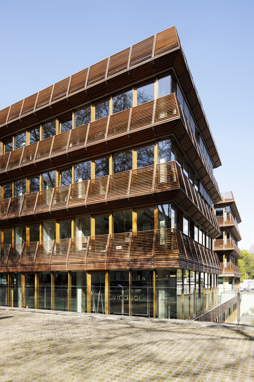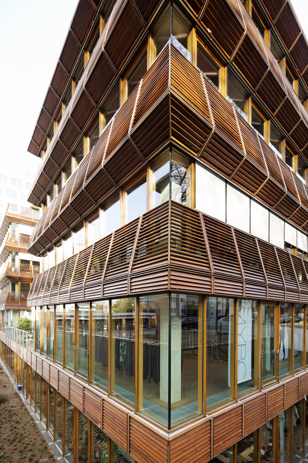 Die zwei parallel zueinander stehenden, in der Bauweise identischen Bürogebäude sind durch einen Verbindungsbau aneinander gekoppelt. Sie wurden im November 1999 fertiggestellt. Was sofort ins Auge springt, sind die ringsum verlaufenden, balkonartig vorgesetzten, leicht gekippten Holzkonstruktionen, die an Pagoden erinnern. Die kastenförmigen Vorbauten dienen der Beschattung der geschosshohen Glasfronten und fungieren als Absturzsicherung - und sie sind wunderbare Gestaltungselemente.
