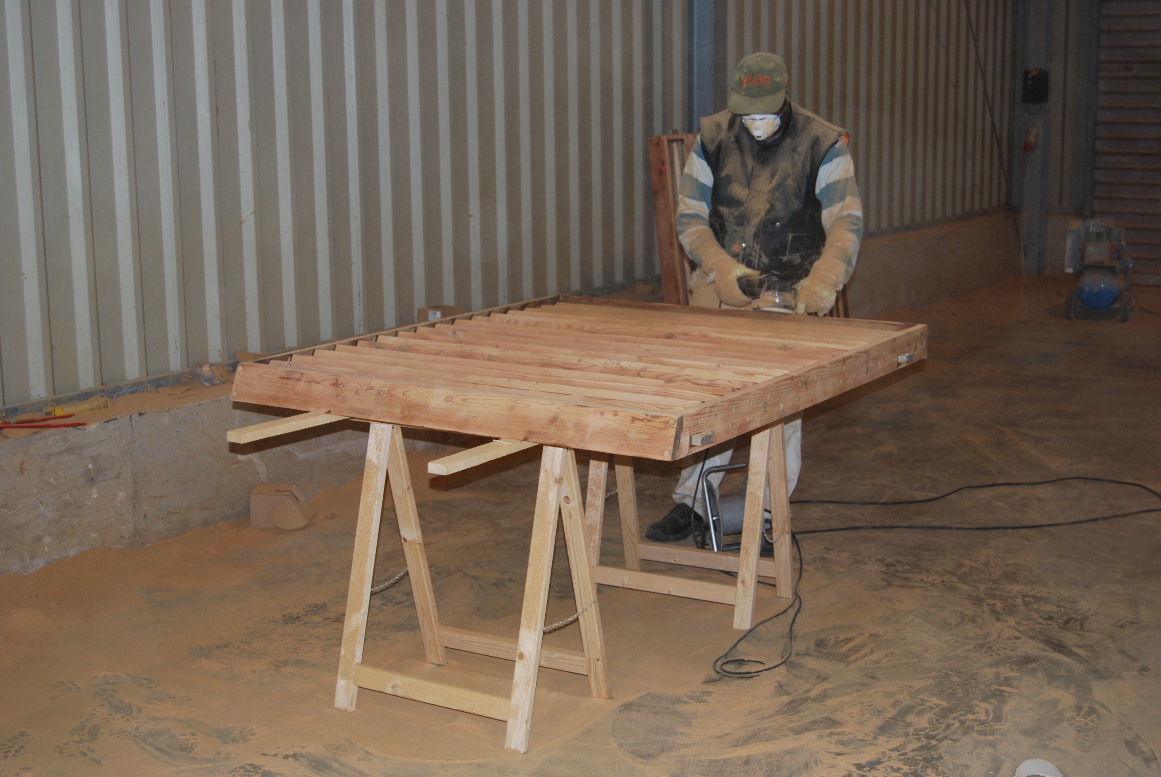 Die Planung, Ausschreibung und Bauüberwachung oblag dem Architekturbüro ABW Architekten, Heinz Binder und Partner Düsseldorf, vertreten durch Jan Siemer. Die Hölzer wurden mit einem Bauaufzug vom Gerüst nach unten befördert und auf Lkw geladen, die das Material nach einem ausgeklügelten Zeitplan zwei- bis dreimal die Woche in ein eigens angemietetes Lager brachten. Mit der Renovierung waren 15 bis 20 Mitarbeiter über eine Bauzeit von ca. drei Monaten beschäftigt. Die Firma Tholl hatte in der Lagerhalle verschiedene Produktionsschienen eingerichtet, an denen jeweils vier bis fünf Mitarbeiter beschäftigt waren. Nach dem Austrocknen der Lamellen wurden im ersten Arbeitsgang die Reste der Altbeschichtung bis auf das rohe Holz abgeschliffen. Beschädigte oder verwitterte Hölzer wurden ausgetauscht. Dann erfolgte eine Imprägnierung mit Capadur ImprägnierLasur, und schließlich wurden die Hölzer dreimal beschichtet mit der Capadur UniversalLasur. Auch die Fenster- und Türrahmen wurden abgeschliffen und mit der UniversalLasur eingelassen.