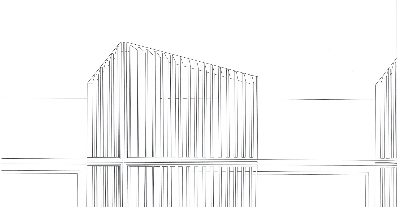 Zur Konstruktion wird ausgeführt: "Die Holzfassade setzt sich aus einer Pfosten-Riegelkonstruktion mit darin eingesetzten Festverglasungen und Fenstertüren zusammen: Die Pfosten und Riegel bestehen aus BFU Profilen in der Holzart Buche und die Fenstertüren und Deckleisten aus Lärche. In den oberen Geschossen sind der Fassade nach innen geneigte Absturzsicherungen vorgelagert. Die Holzlamellen verändern von unten nach oben ihren Winkel, so dass der Anschluss an die Geschossdecke verdeckt wird und die Absturzsicherung nach oben hin immer transparenter wird. Dadurch wirkt das Gebäude, obwohl es eine Geschoss hohe Verglasung hat, nicht als ganz gläserner Körper. Es erscheint vielmehr je nach Lichtverhältnis mehr oder weniger transparent.
